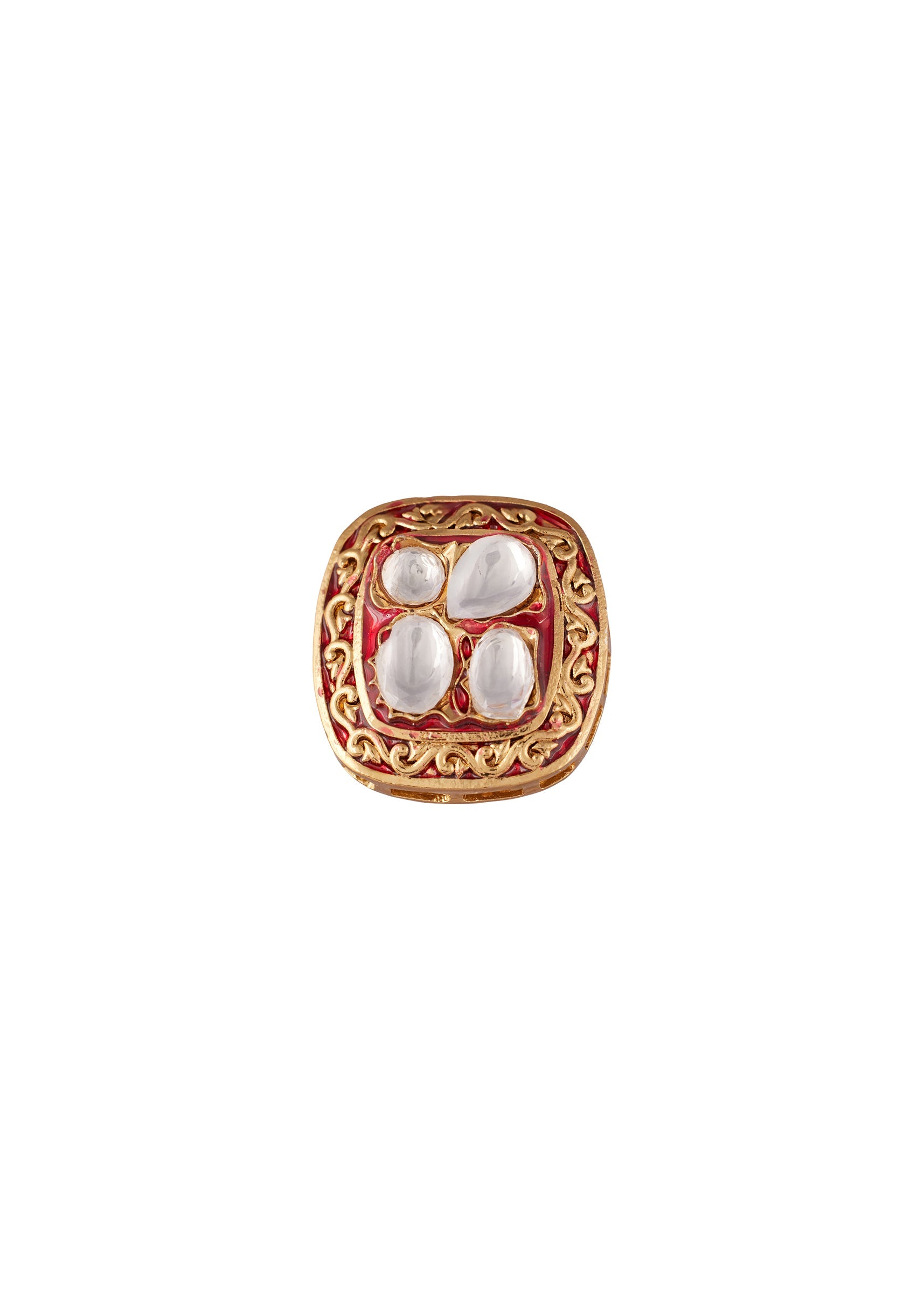 A gold toned square stud earring featuring rich red enamel and ornate border work. The centre is set with four clear stones arranged in a traditional Kundan style setting... More Product Details