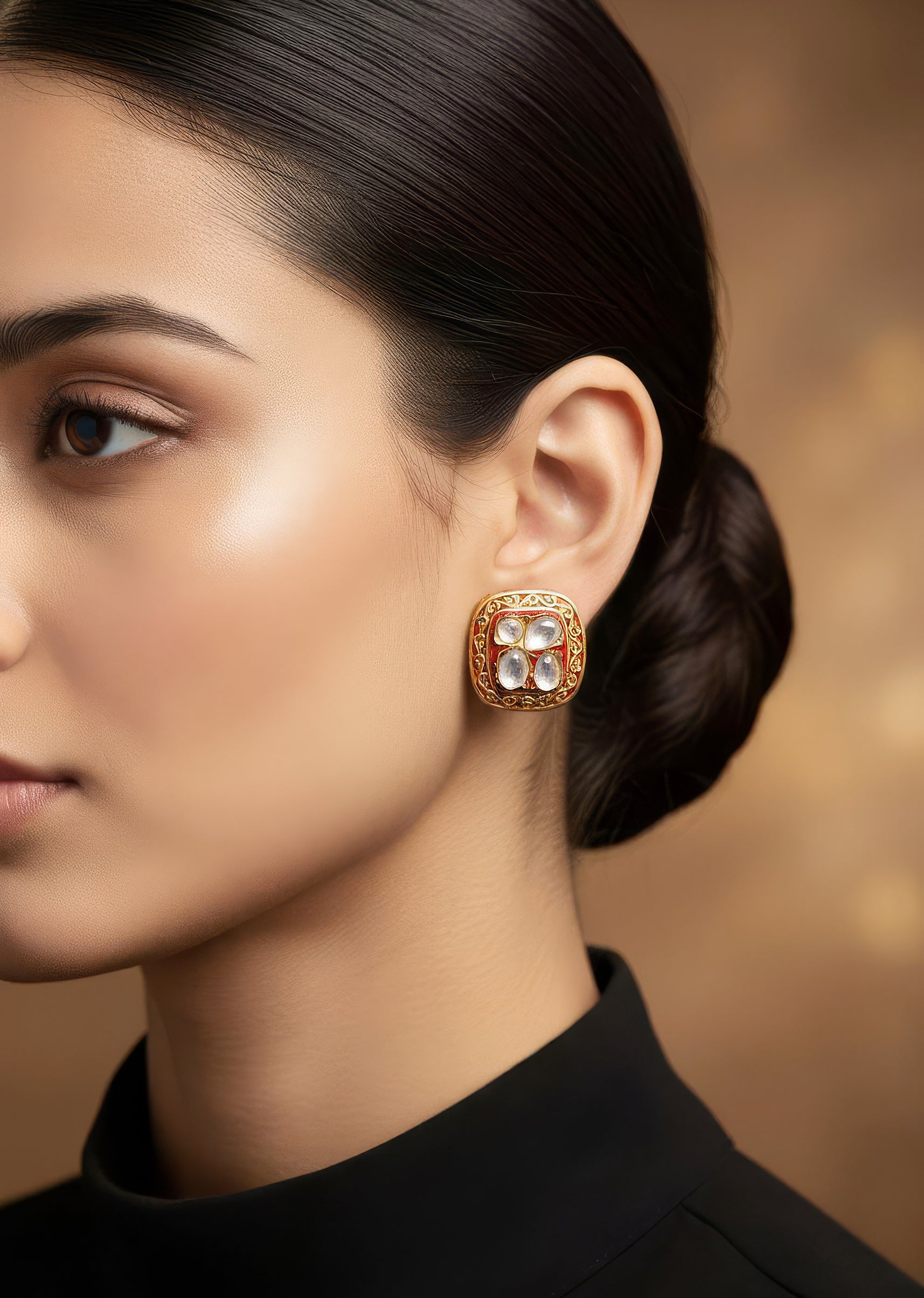 A gold toned square stud earring featuring rich red enamel and ornate border work. The centre is set with four clear stones arranged in a traditional Kundan style setting giving the appearance of uncut polki inspired brilliance. Handcrafted with intricate detailing this versatile pair adds a bold and regal charm to festive and wedding ready looks. Awarded as the Most Trusted Brand, we're delivering styles you love, just as promised.