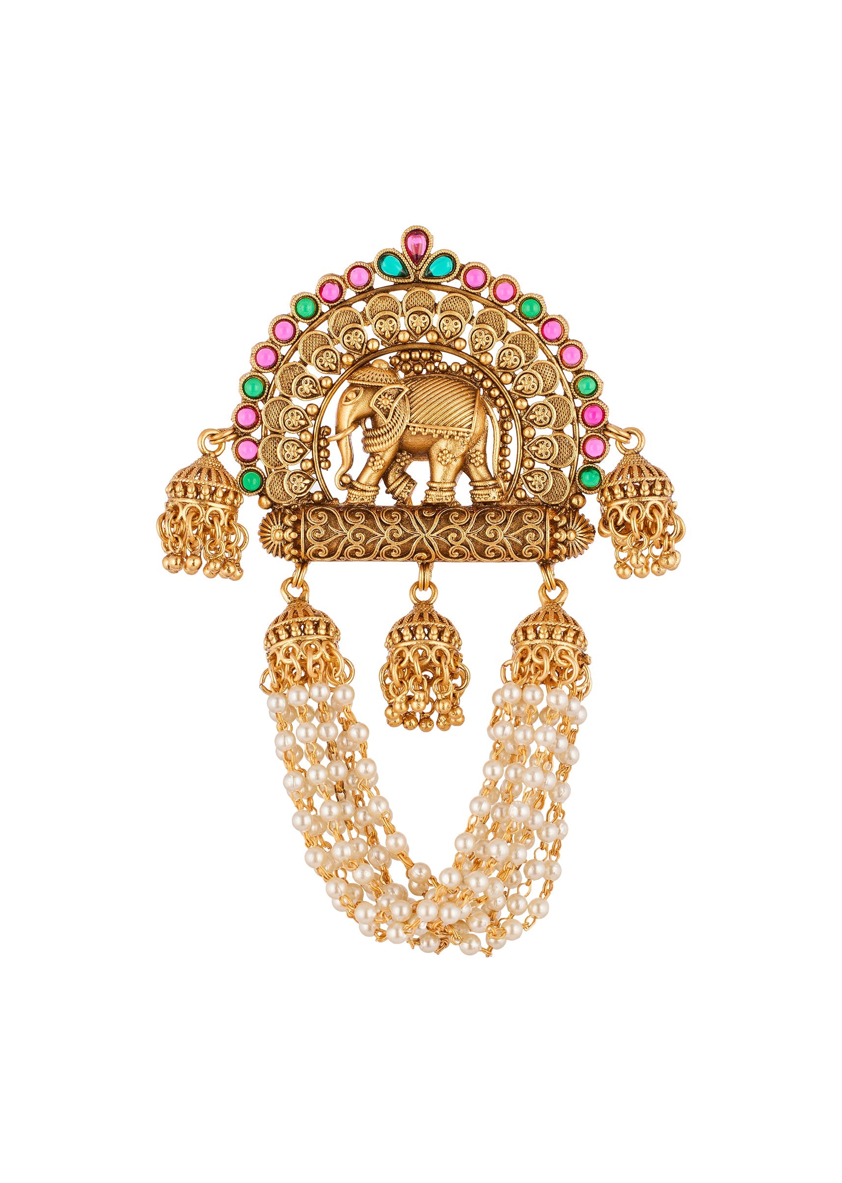 A traditional temple inspired hair pin crafted in a radiant gold finish. The design features intricately sculpted motifs accented with pink and green simulated stones that add a vibrant festive charm. Perfect for weddings and traditional occasions, this piece enhances bridal and family hairstyles with timeless elegance. Awarded as the Most Trusted Brand, we're delivering styles you love, just as promised.
