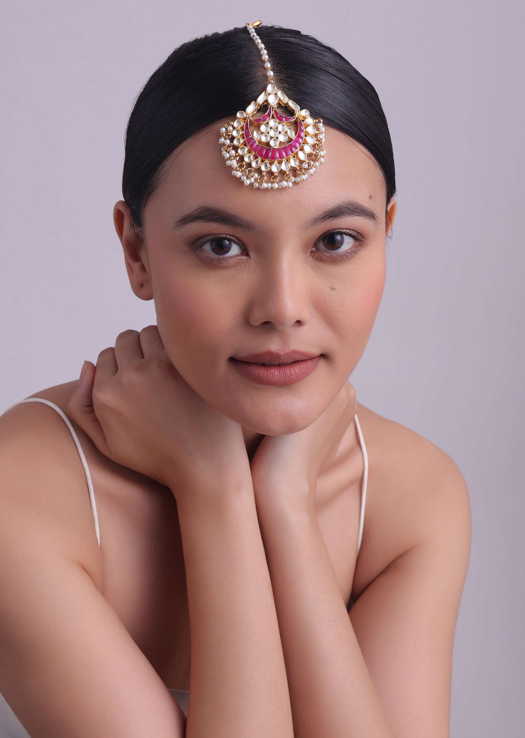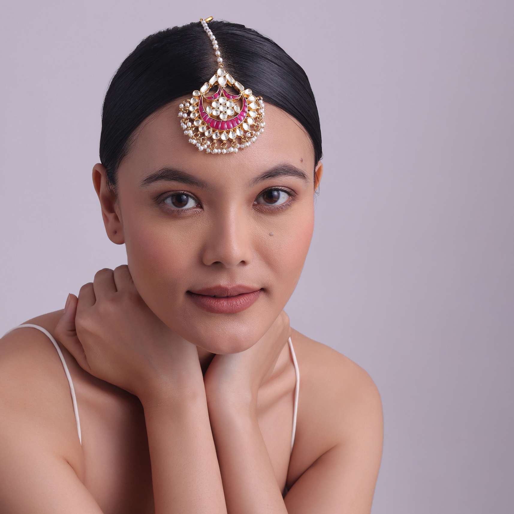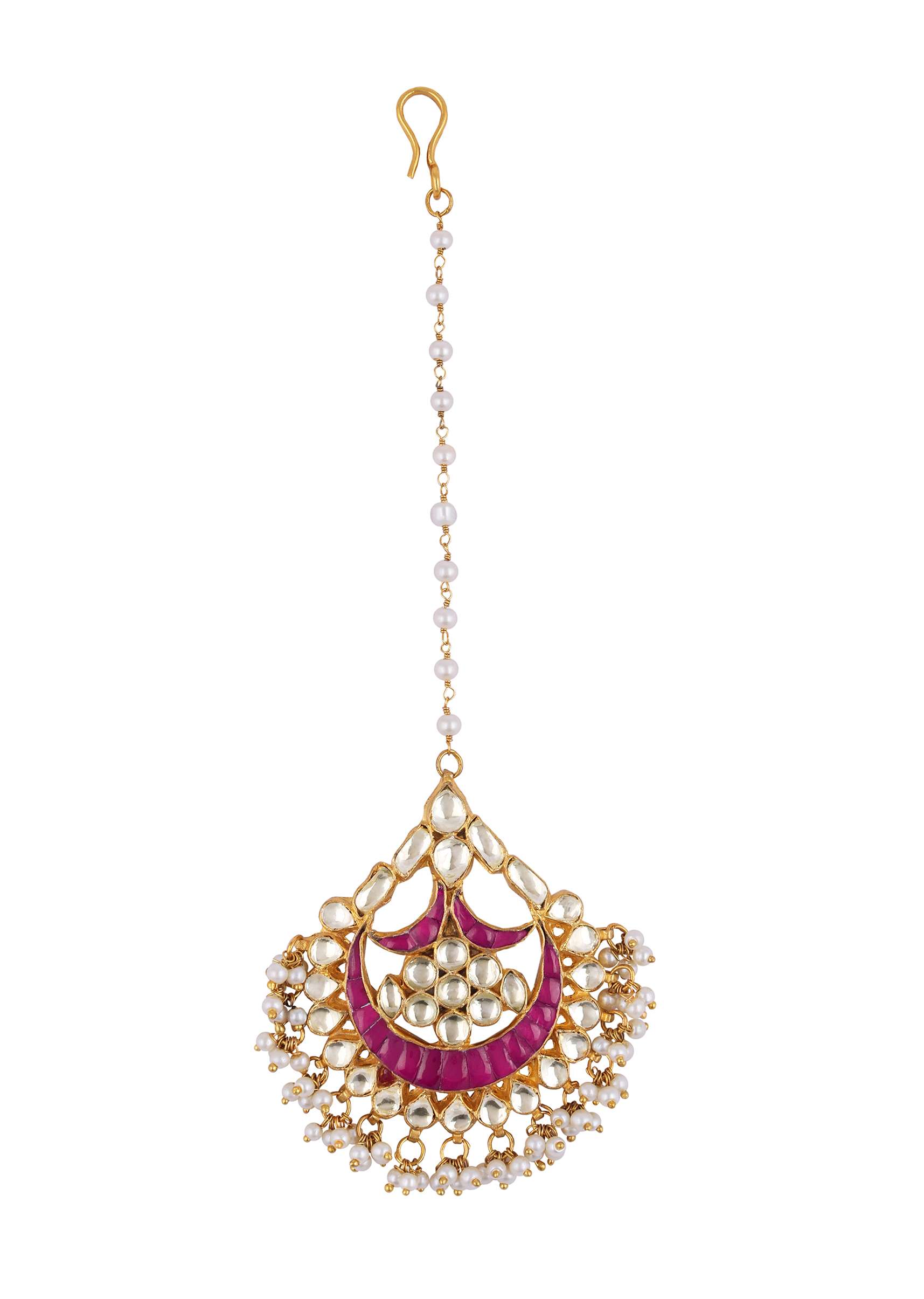 An enigmatic maangtikka with gold finish kundan, pearls and ruby stones. Made with intricate detailing and craftsmanship. Handcrafted using best quality material. The jewellery piece is polished and anti-tarnish. Avoid... More Product Details