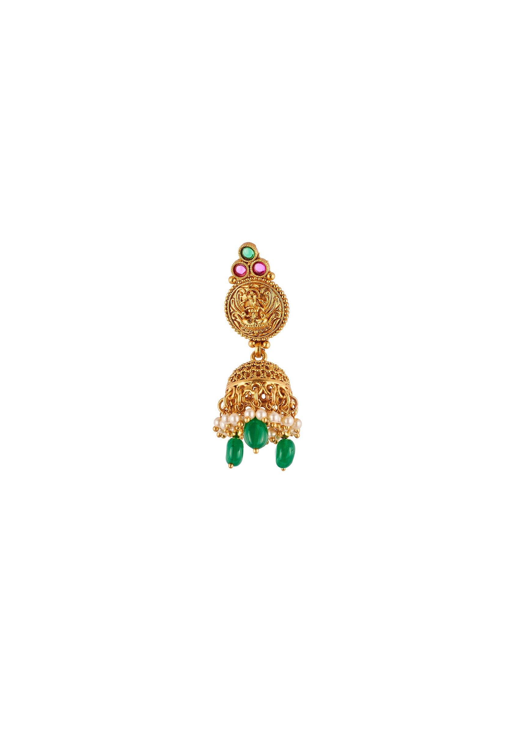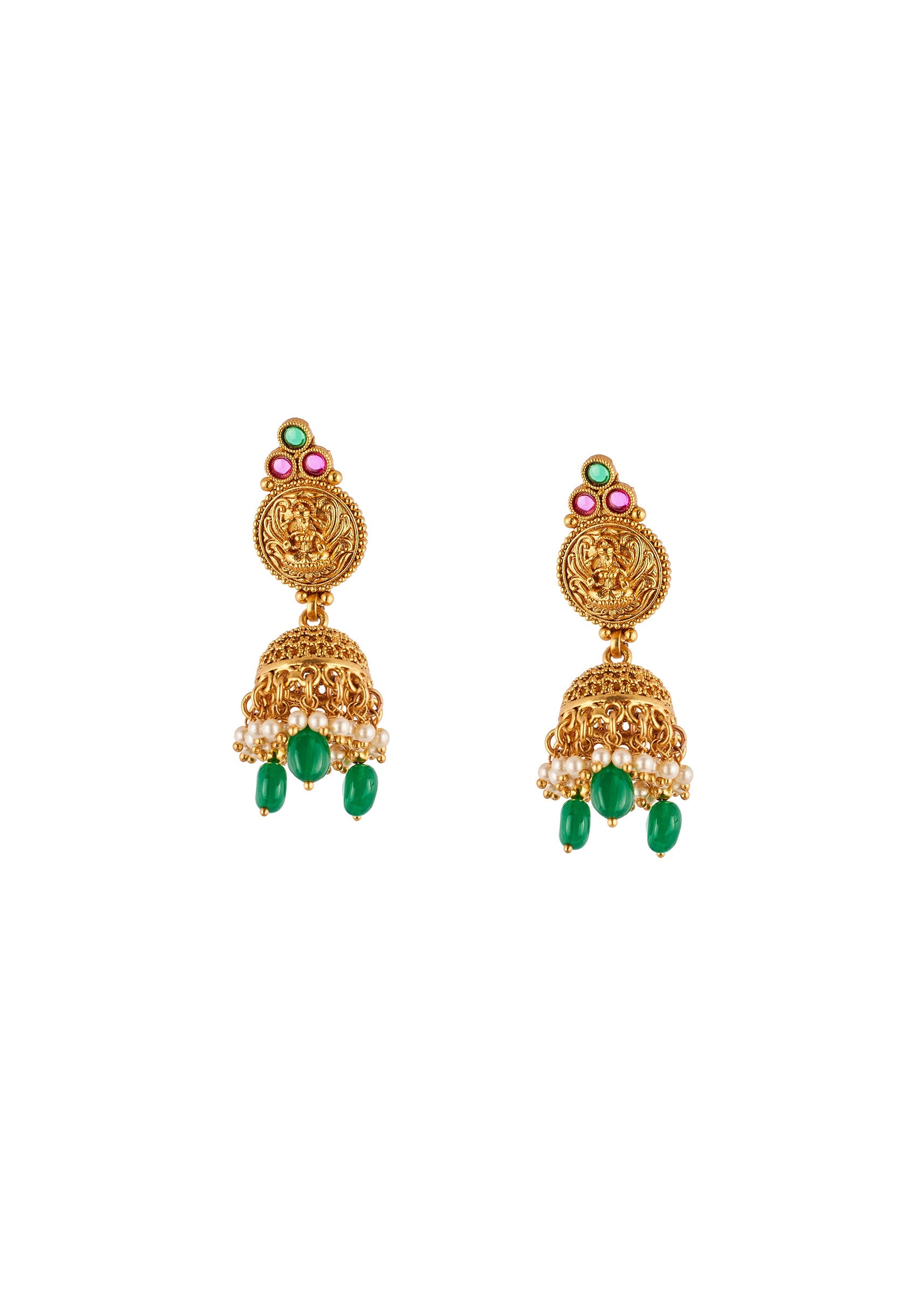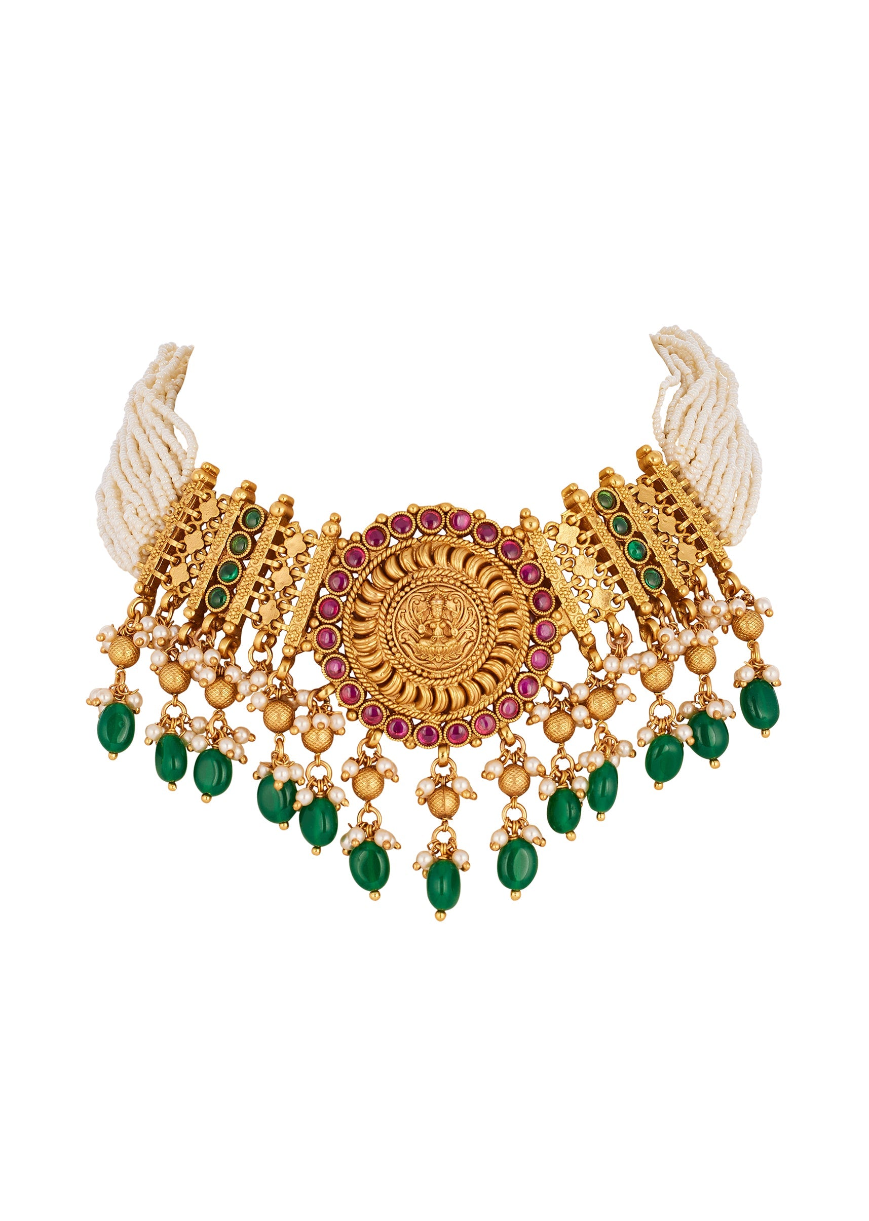 A radiant gold necklace set featuring intricately detailed traditional temple motifs accented with green and pink simulated stones. The vibrant stone combination adds a festive and elegant charm, making it... More Product Details