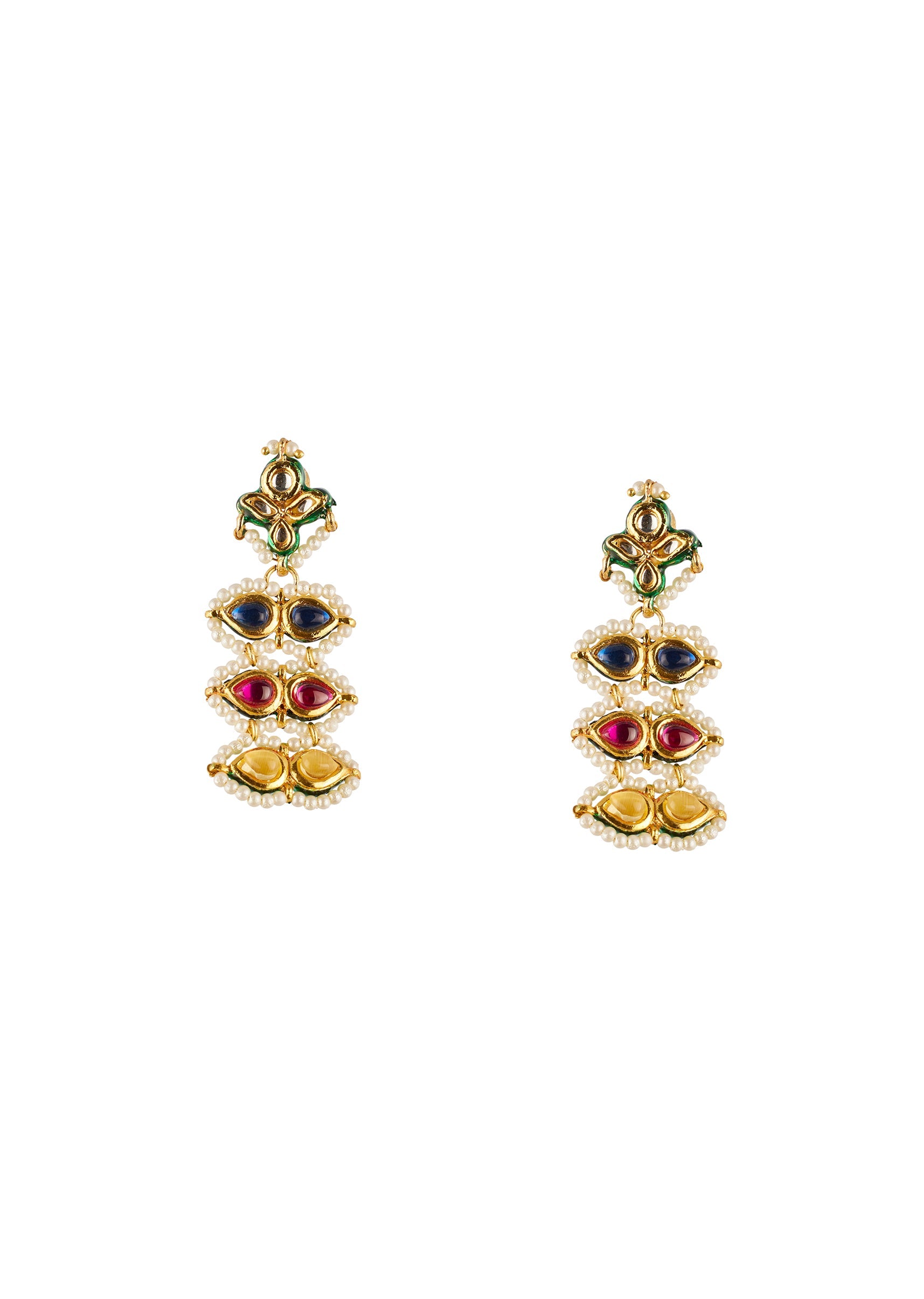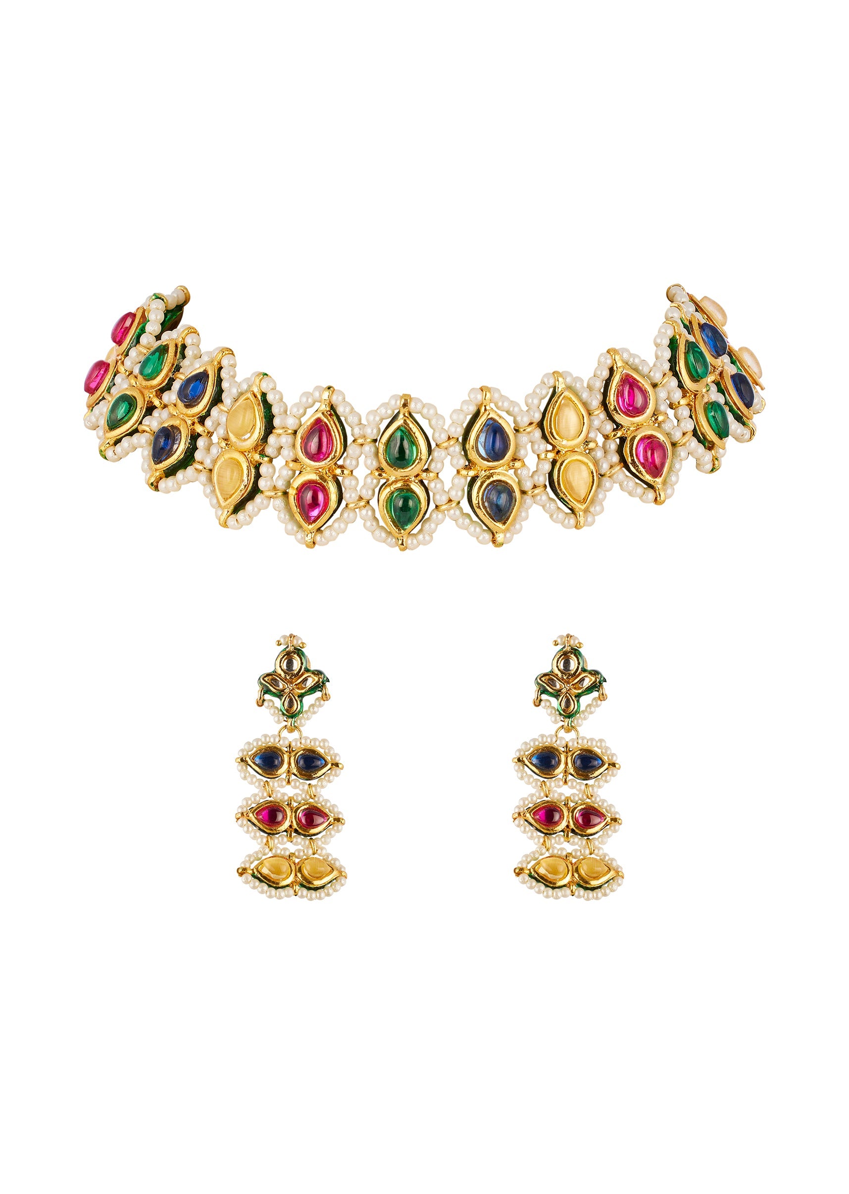 Bring timeless elegance to your ethnic wardrobe with this Kundan style jewelry set, designed in a classic gold tone finish. Accented with faux pearls and simulated coloured embellishments, the beautifully crafted necklace is paired with matching dangler earrings, making it an ideal choice for weddings, festive celebrations, and traditional occasions.