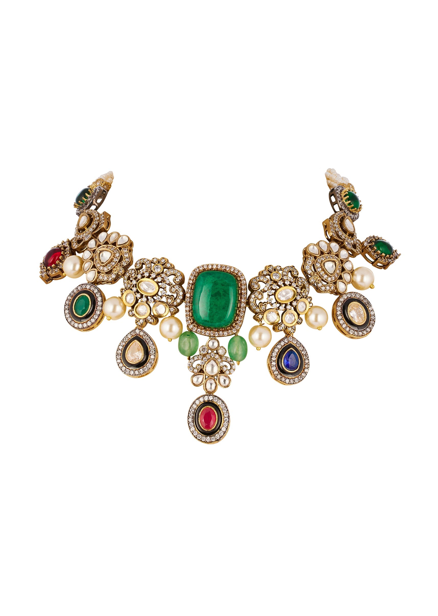 Gold Traditional Mordern Polki Necklace Set with Faux Simulated Coloured Stones