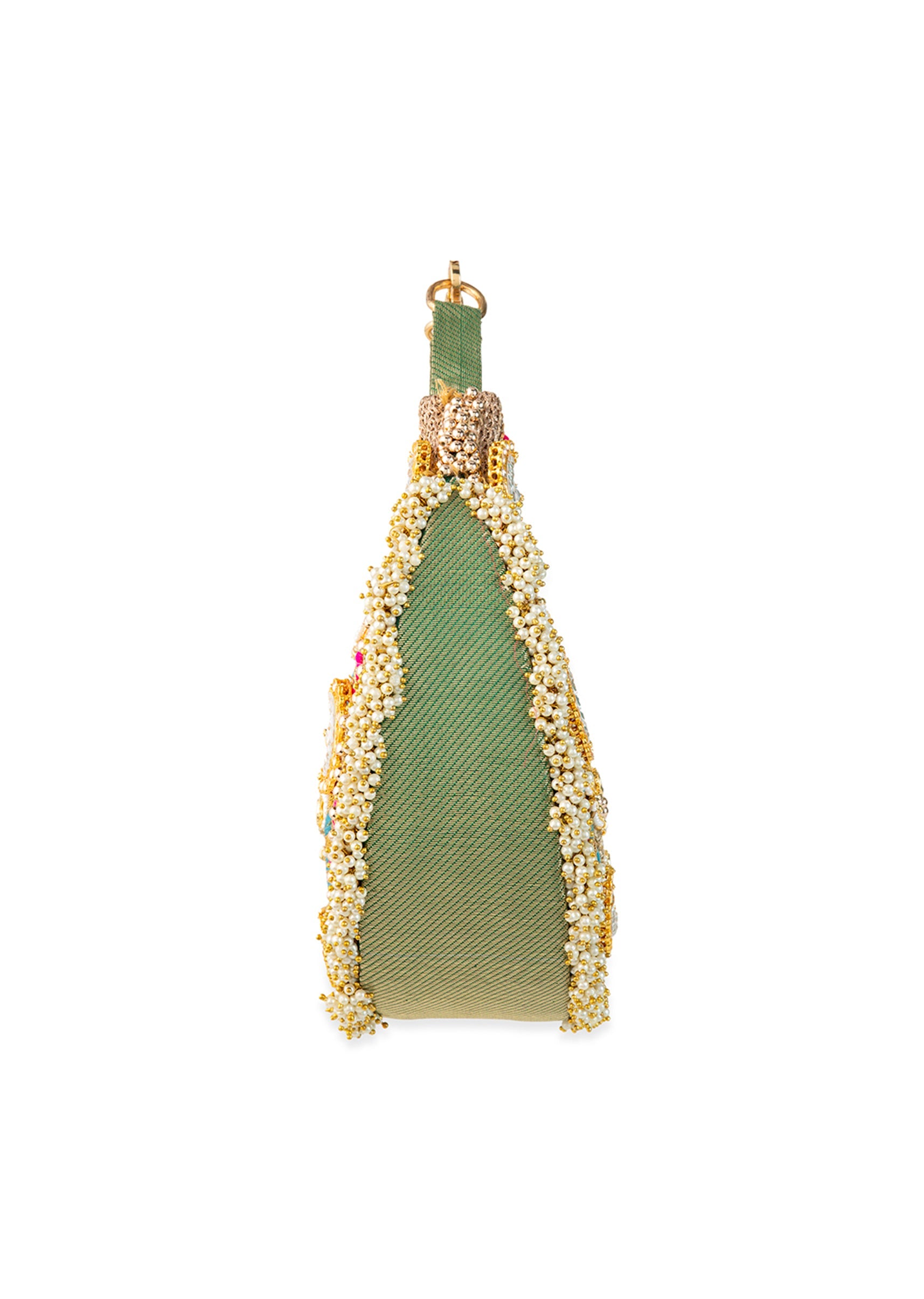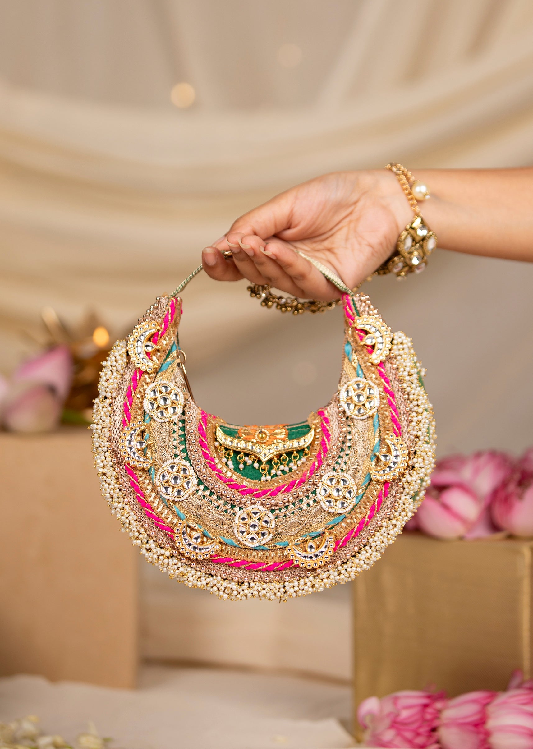 This gold bag dazzles with intricate zardozi embroidery, brought to life with mirror accents, lustrous pearls, and vibrant pink and green threadwork. Its ornate detailing and radiant finish make it... More Product Details