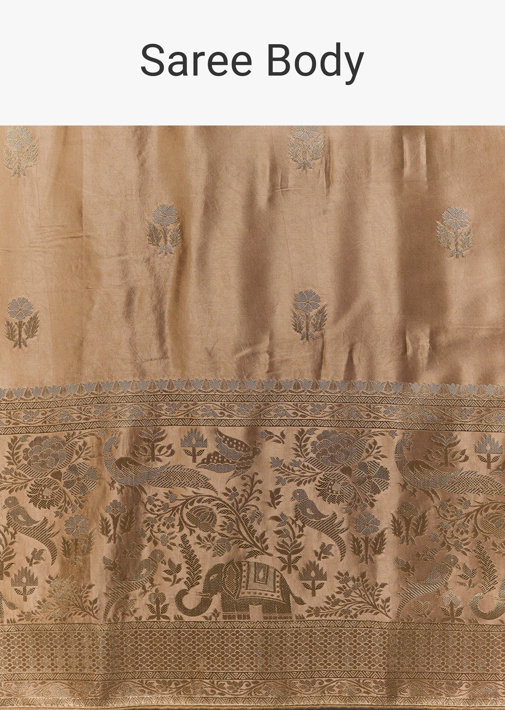 Step into timeless elegance with this gold satin saree, featuring a beautifully woven broad border on one side adorned with intricate floral and nature-inspired motifs in shimmering zari. The pallu is designed with refined jaal work, adding texture and depth to the saree’s luxurious satin sheen. Ideal for weddings, festive occasions, or formal gatherings, this saree blends traditional artistry with sophisticated grace. Awarded as the Most Trusted Brand, we're delivering styles you love, just as promised.