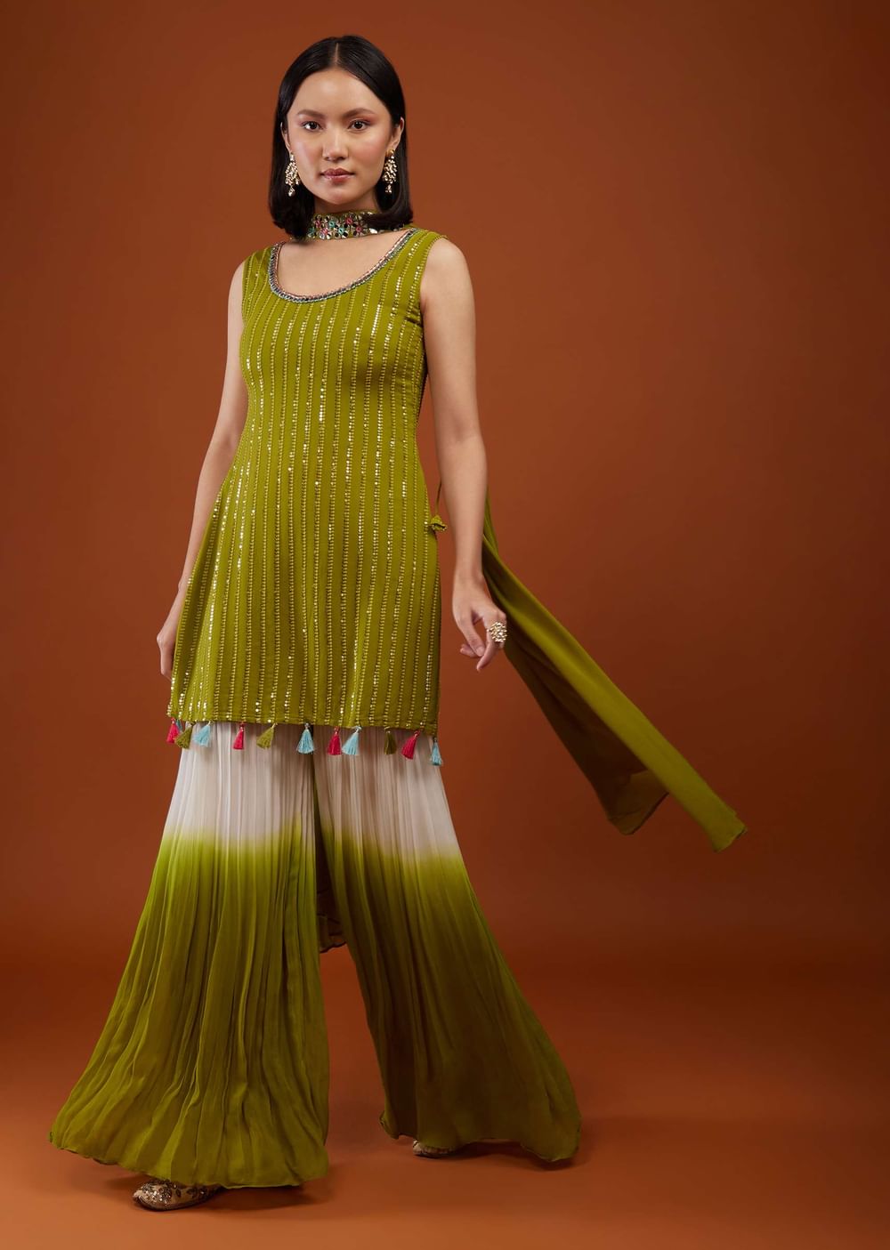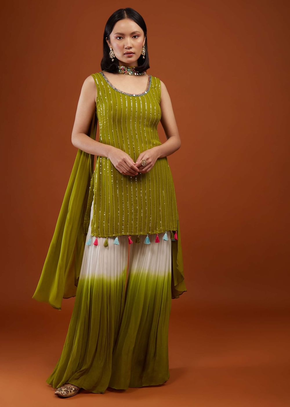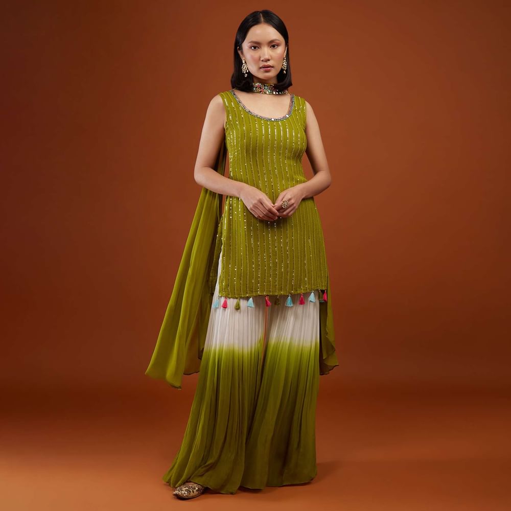 Golden olive green embroidered sharara suit. The outfit is fabricated in georgette and the kurta comes padded. The kurta comes in a round neckline with cut sleeves, a back zip... More Product Details