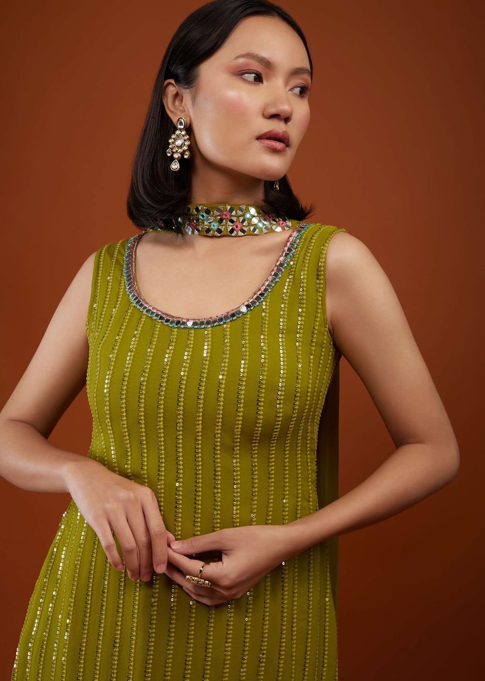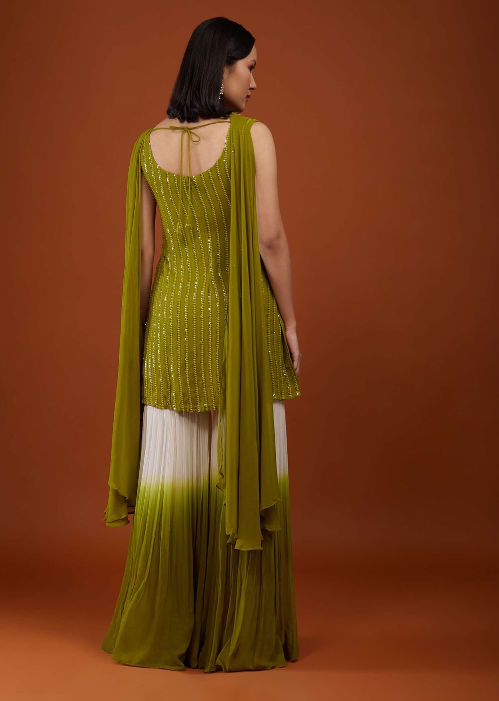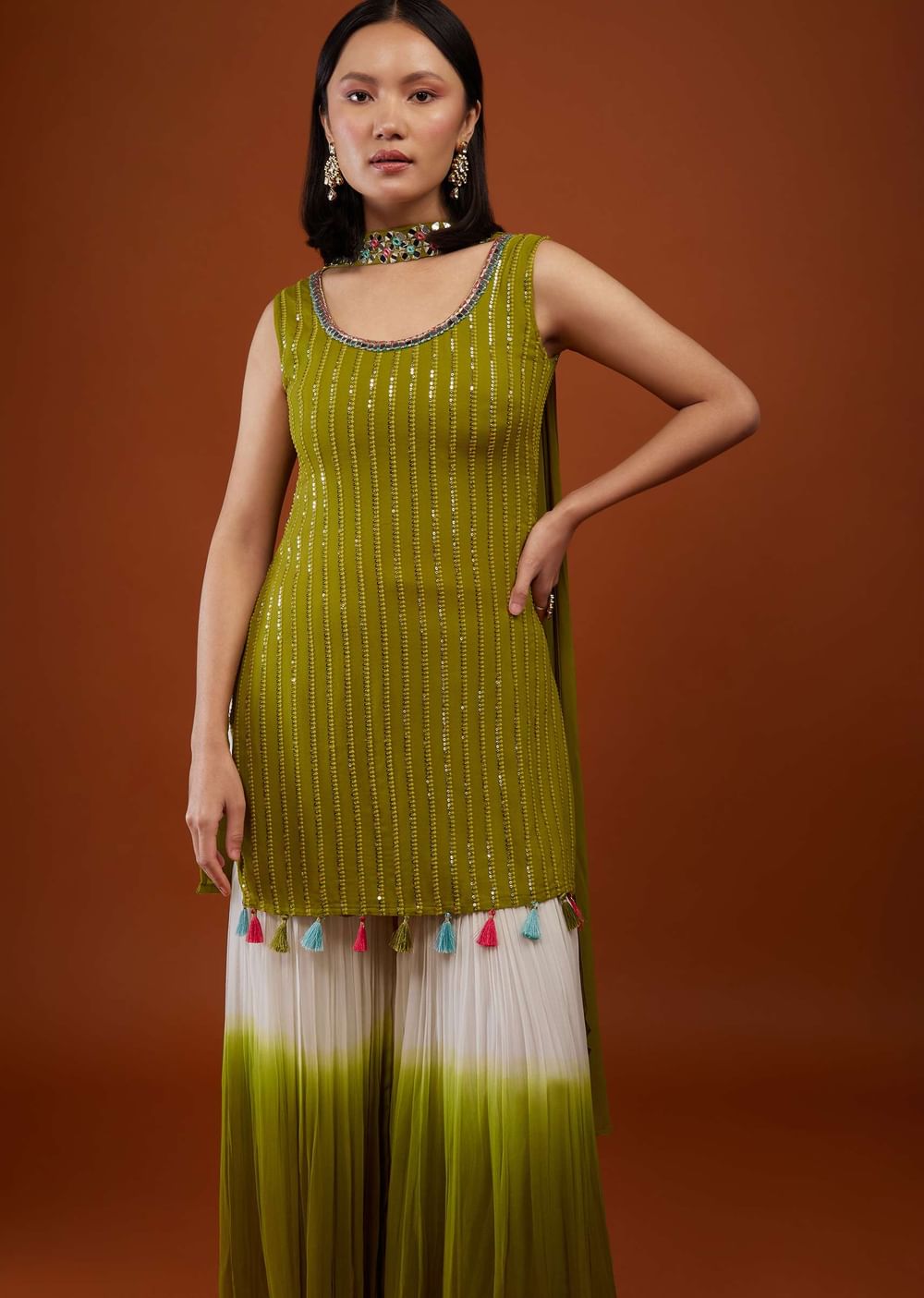 Golden olive green embroidered sharara suit. The outfit is fabricated in georgette and the kurta comes padded. The kurta comes in a round neckline with cut sleeves, a back zip... More Product Details