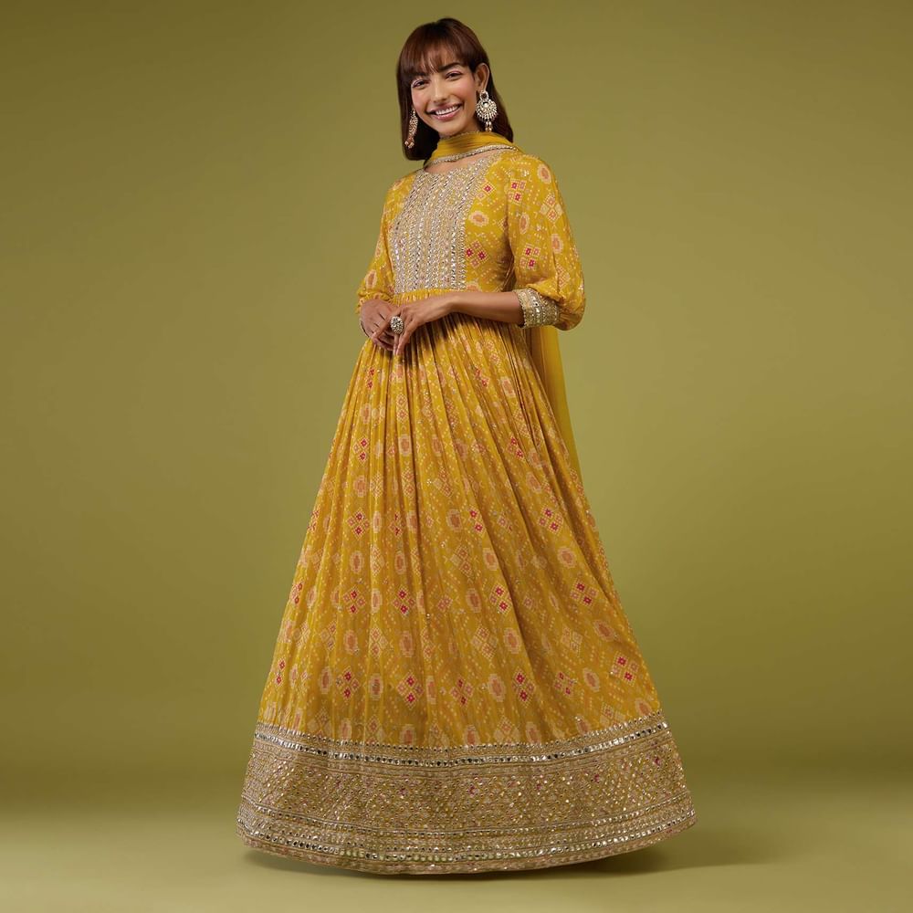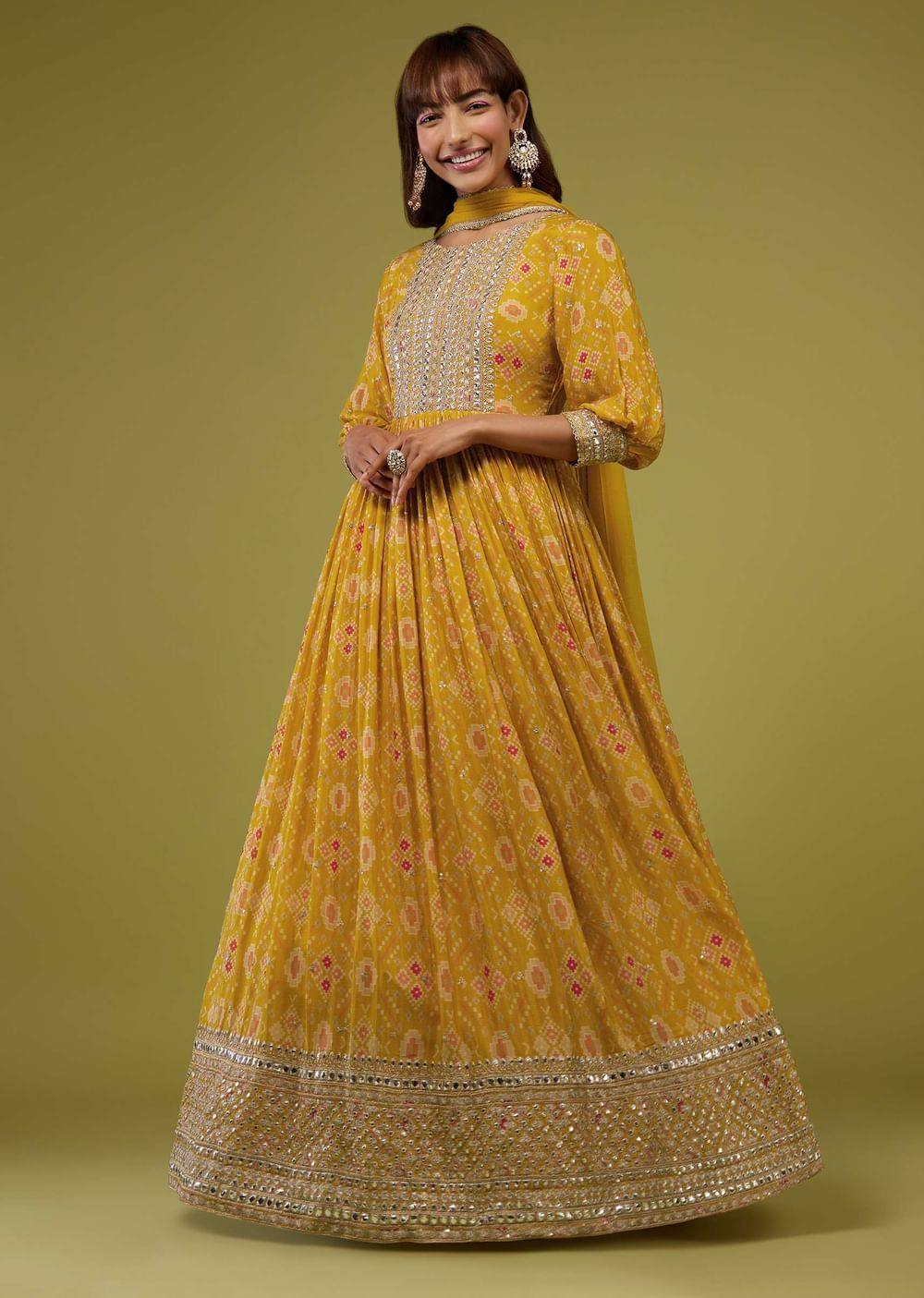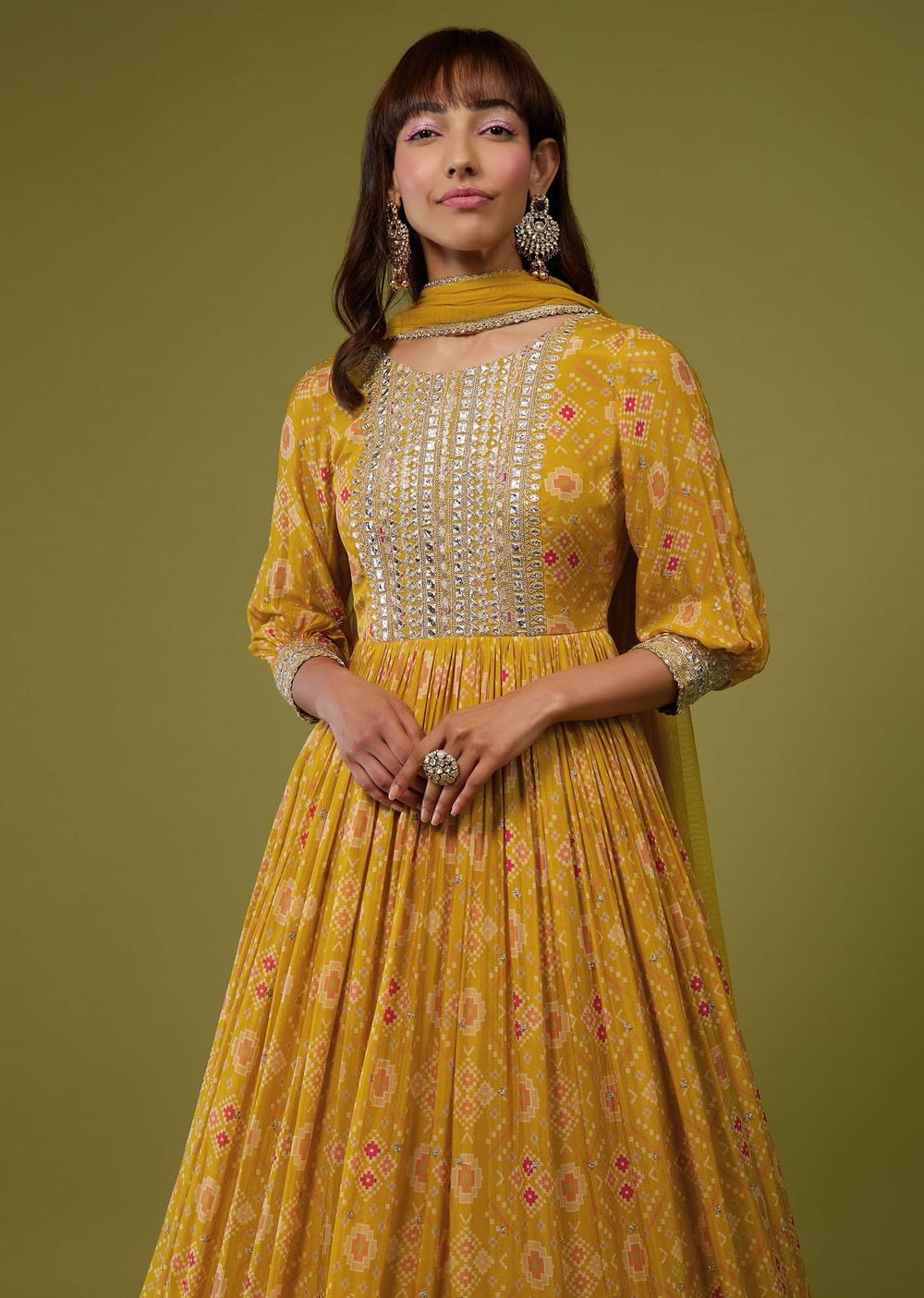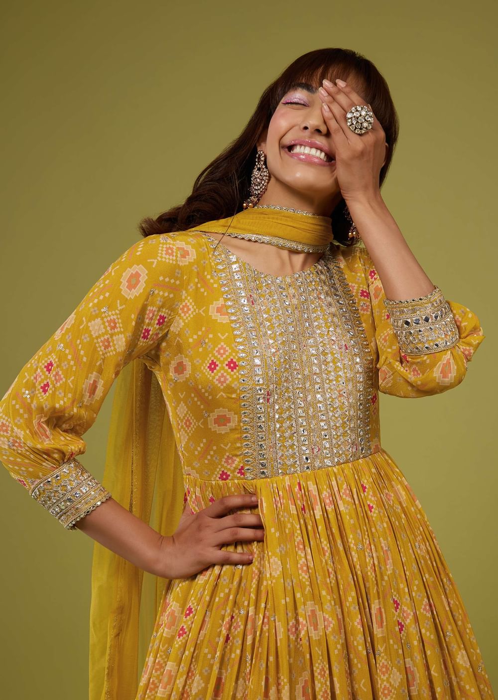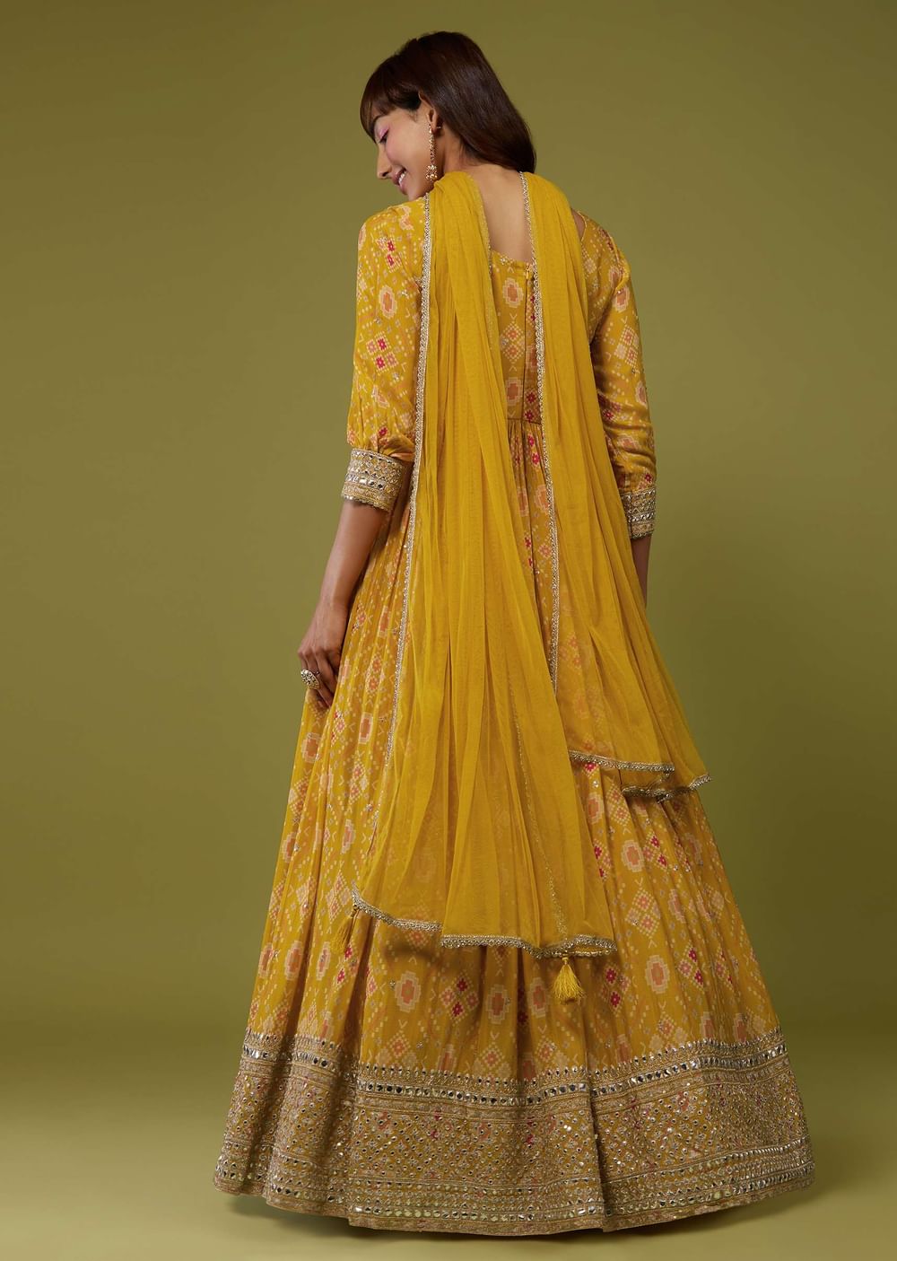 Golden Rod Yellow Anarkali Suit in a gorgeous silk fabric.The suit has a beautiful patola print and is highlighted with zari and mirror handwork on the bodice and hemline.It has... More Product Details