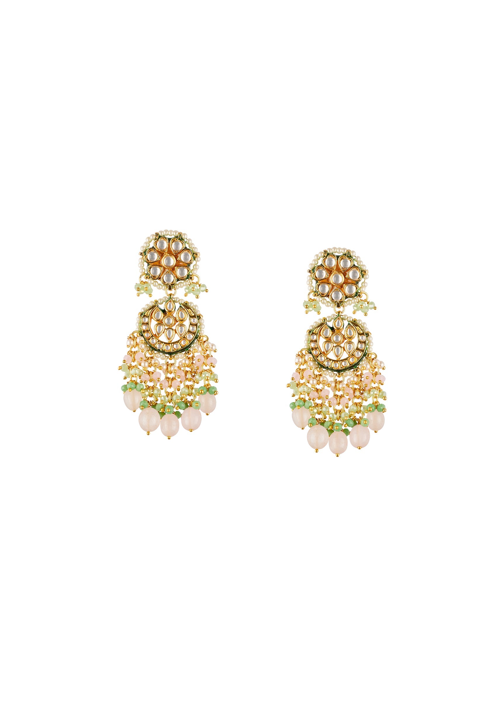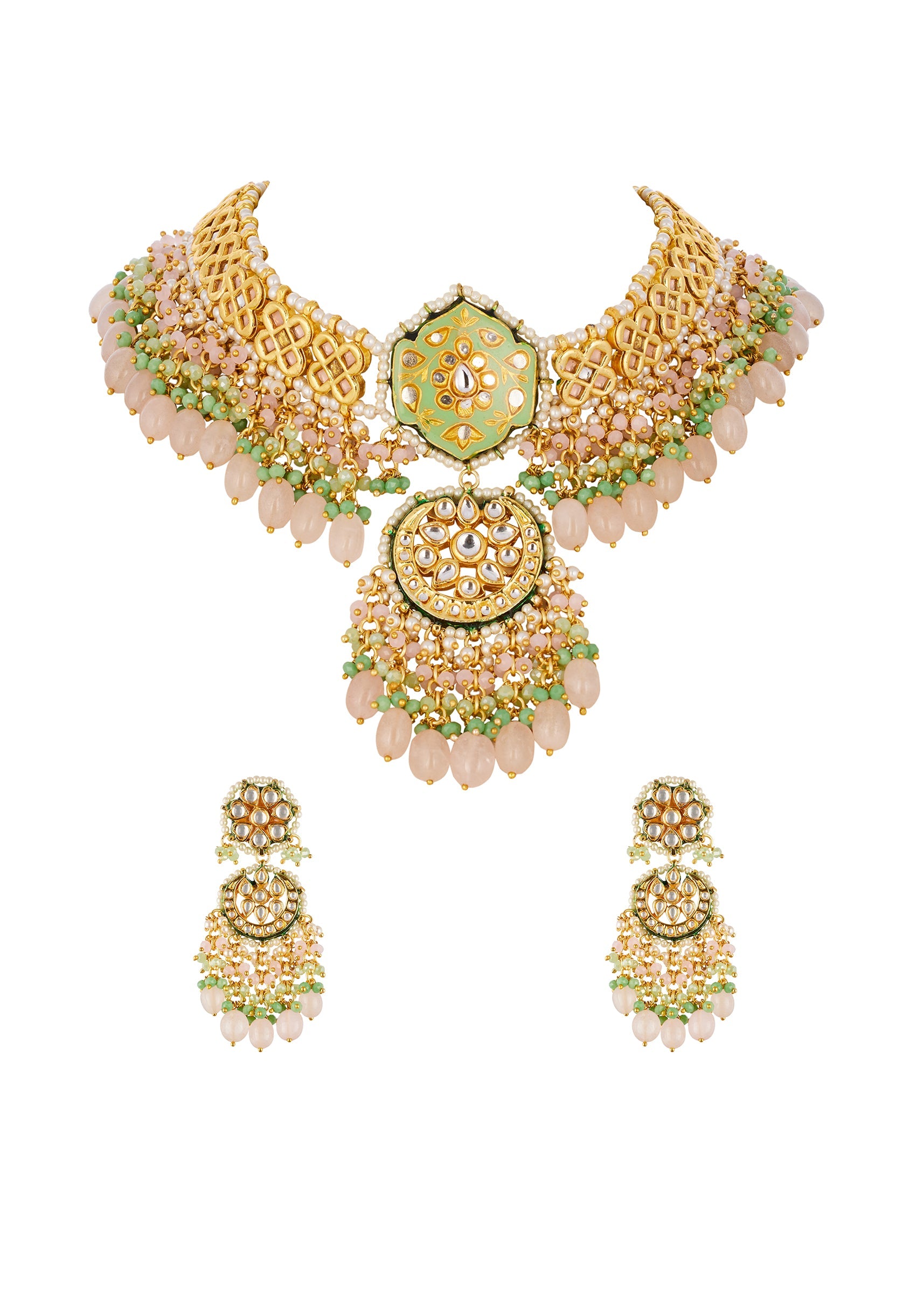 Green and Gold Traditional Kundan Chandbali Necklace Set with Faux Pearl