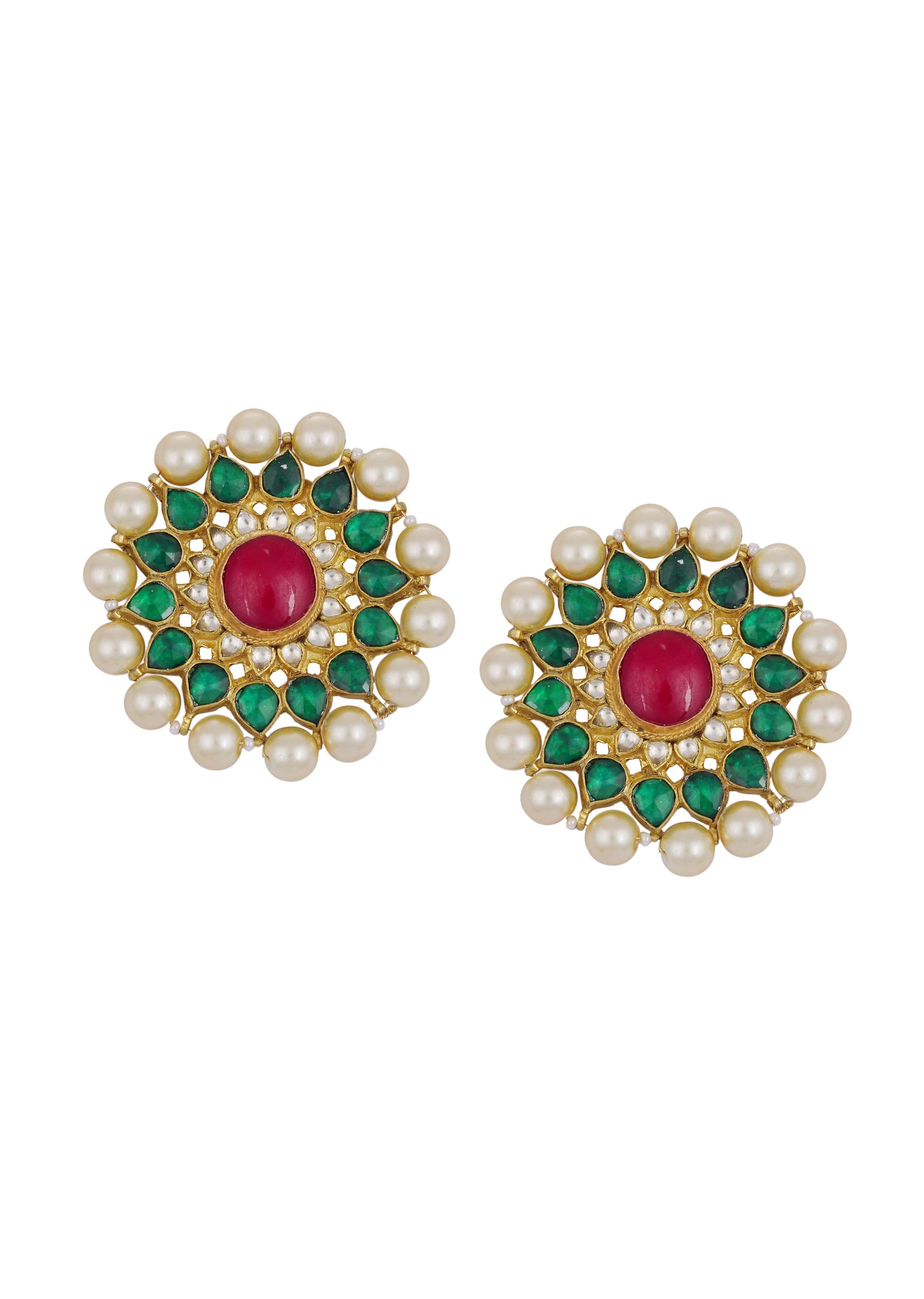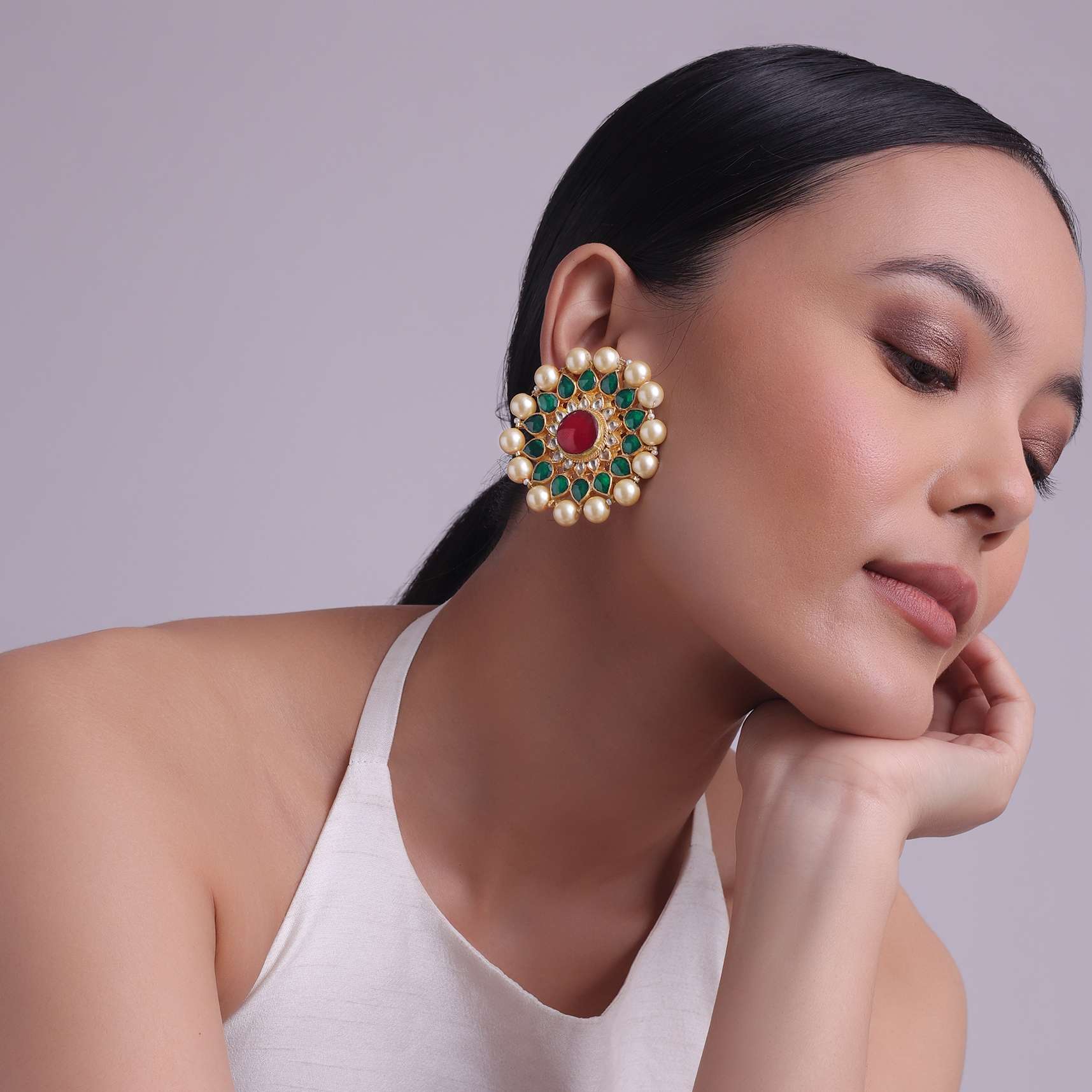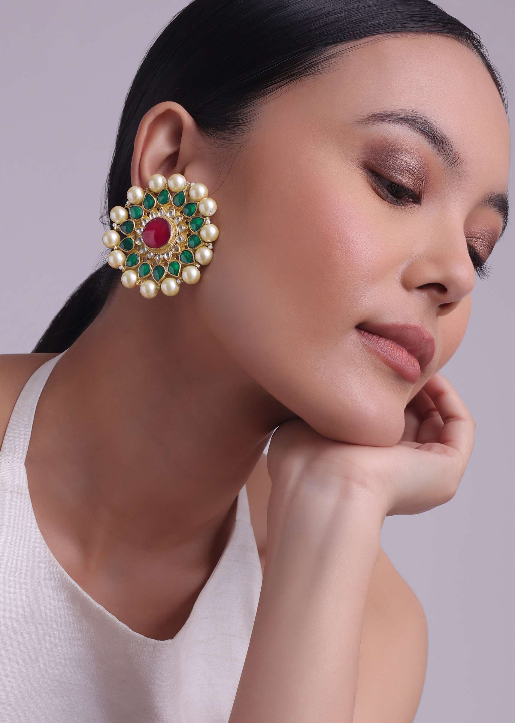 Presenting a gorgeous pair of gold finish jadau kundan earrings in mixed metal, synthetic ruby and emerald stones, along with beads and pearls that accentuate the piece's beauty. The earrings have a beautiful big ruby stone studded in the middle, adorned in cut diamond stones, circled by emerald cut stones, and a final circle of pearls and beads. The earrings have a push-back closure and speak royalty with sheer tradition. Avoid contact with water, chemicals, harsh liquids, perfumes, etc. Do not wear this piece of jewelry while showering, gymming, swimming, etc. Hard contact must be avoided completely. Please keep the product away from moisture and humidity when not in use. Baroque pearls and Natural stones can range from minor aberrations to distinctly ovoid, curved, pinched, or lumpy shapes. Slight variations in design may vary. Awarded As The Most Trusted Brand We'Re Delivering Styles You Love Just As Promised.