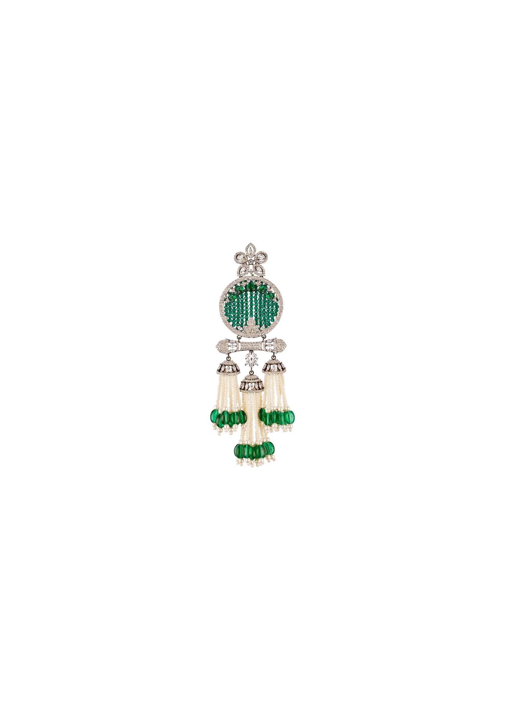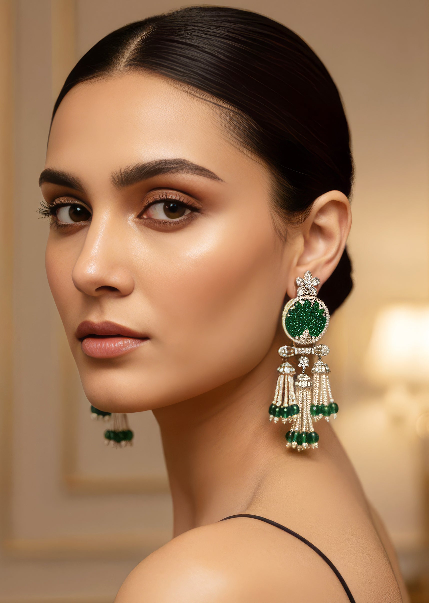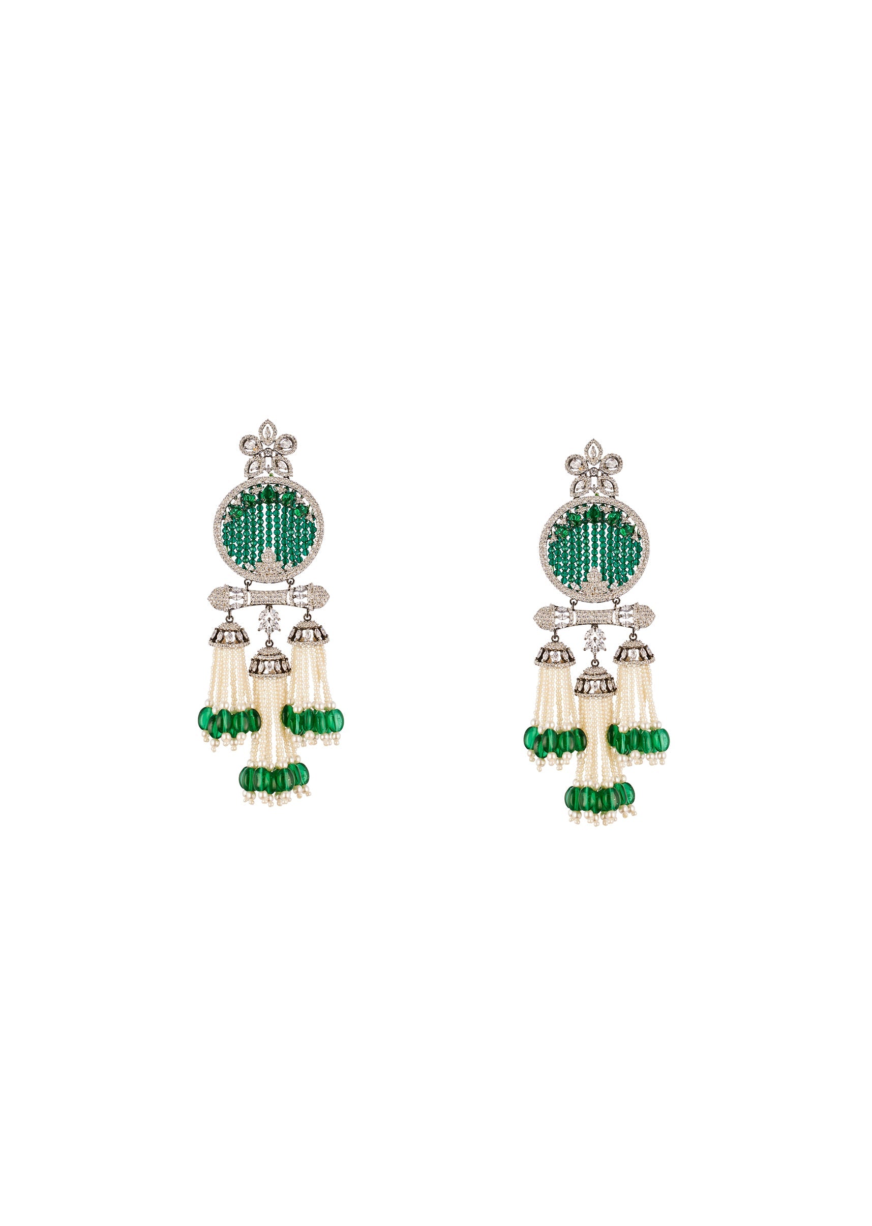 Green Anti Tarnish CZ Diamond Rhodium-Plated Brass Earrings with White Beads