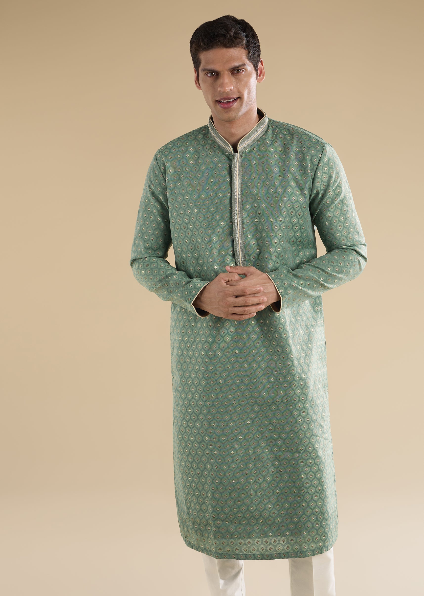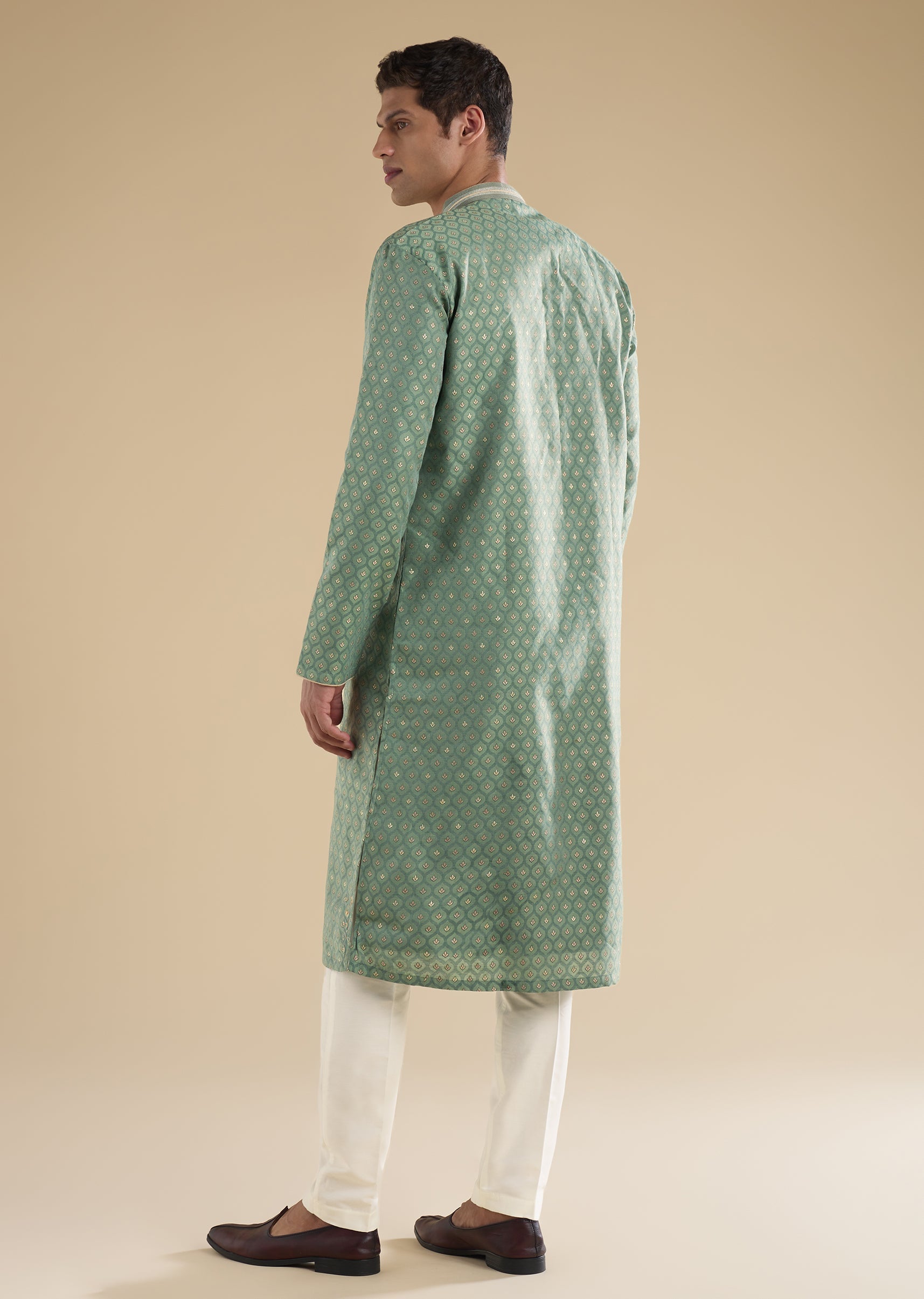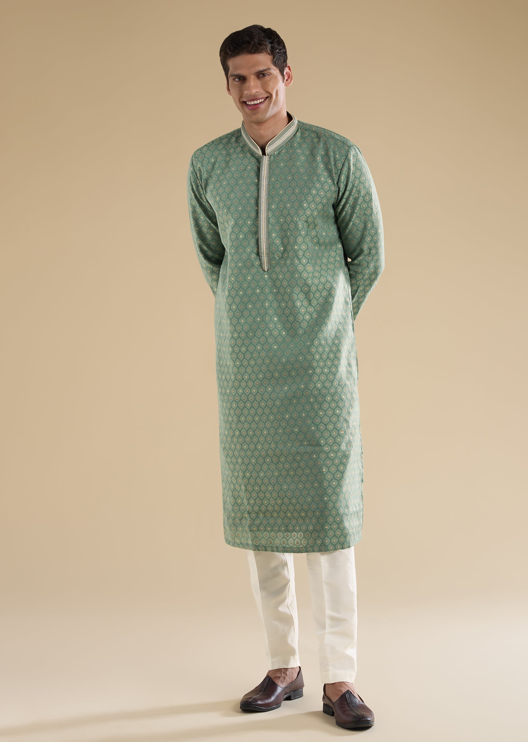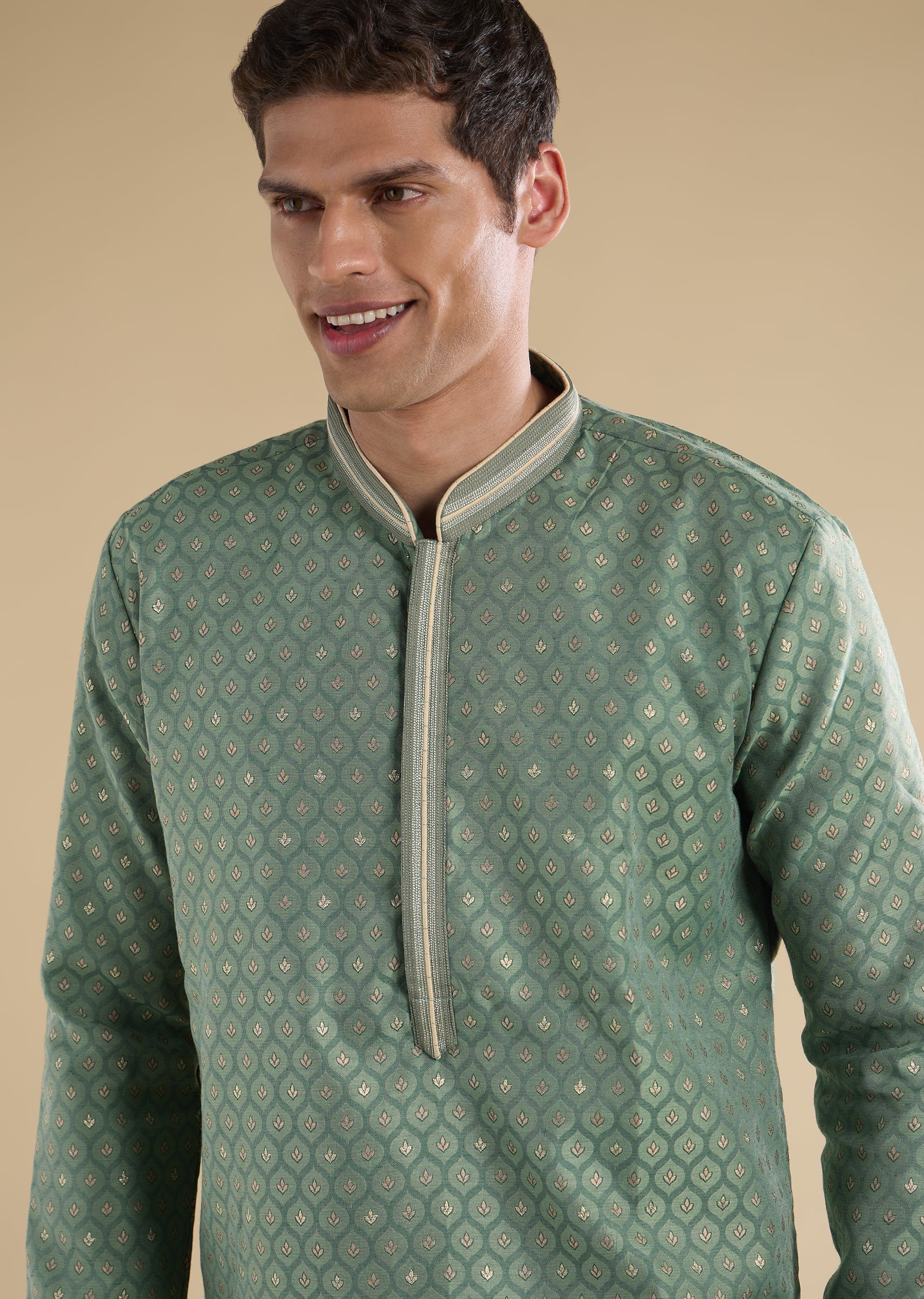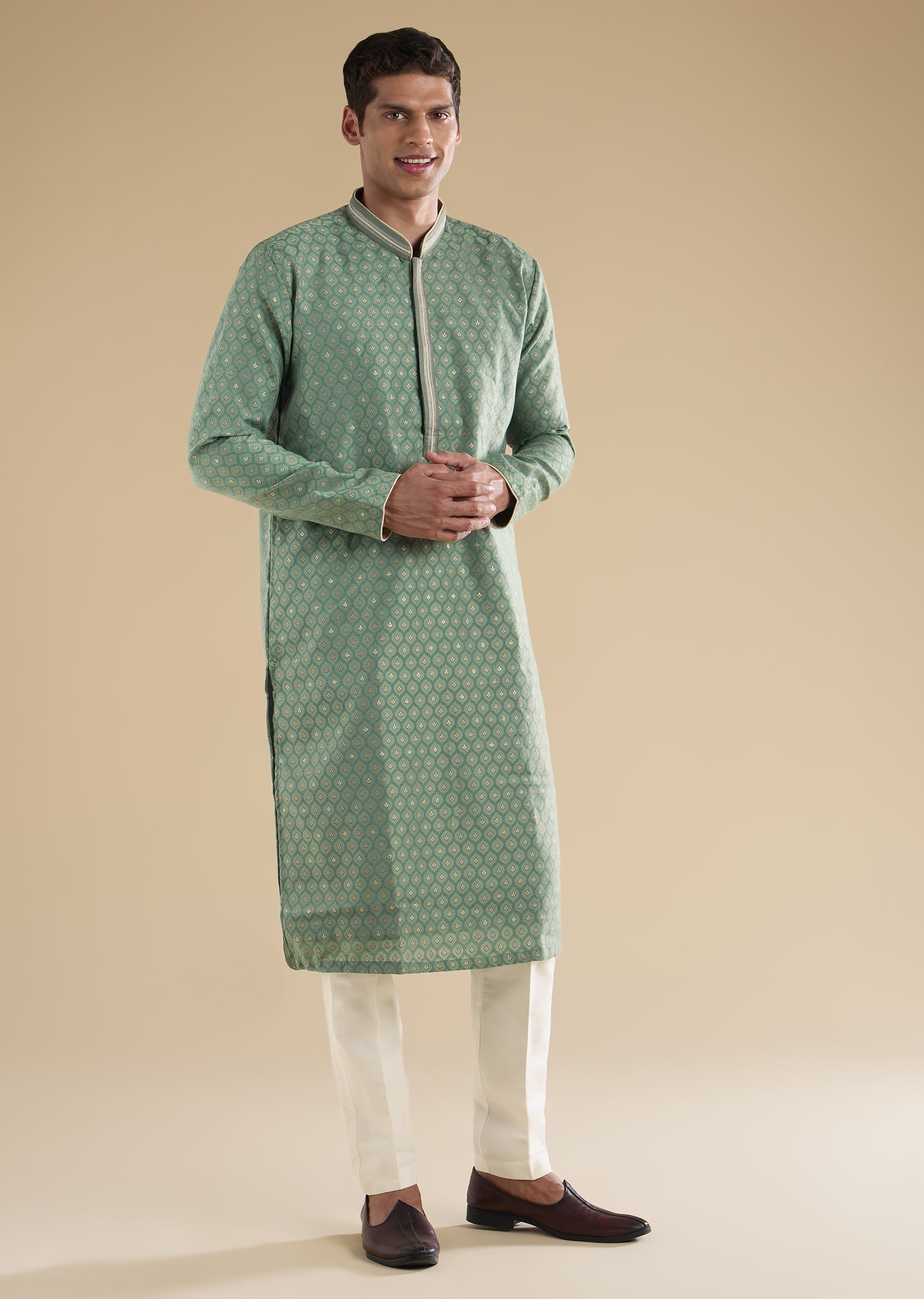 A refined green kurta set crafted in Banarasi silk with subtle resham detailing for a rich yet wearable look. Finished with mandarin collar, full sleeves, and front hook-eye closure, paired... More Product Details