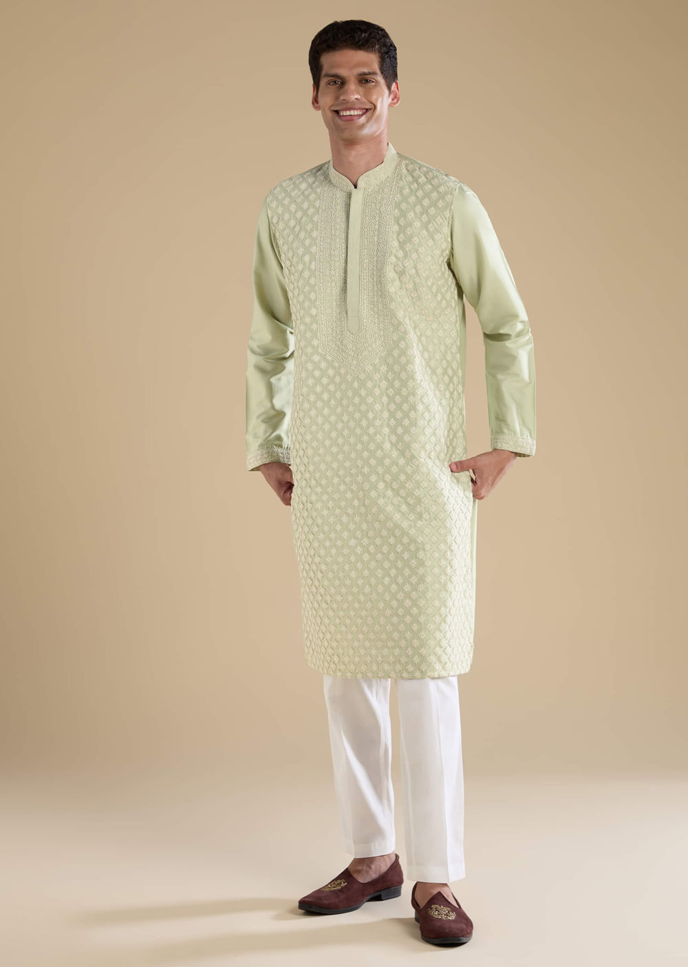 Make a striking statement in this vivid green kurta and pant set. Crafted in rich banarasi silk fabric, it features a textured weave that adds depth and dimension. The vibrant... More Product Details