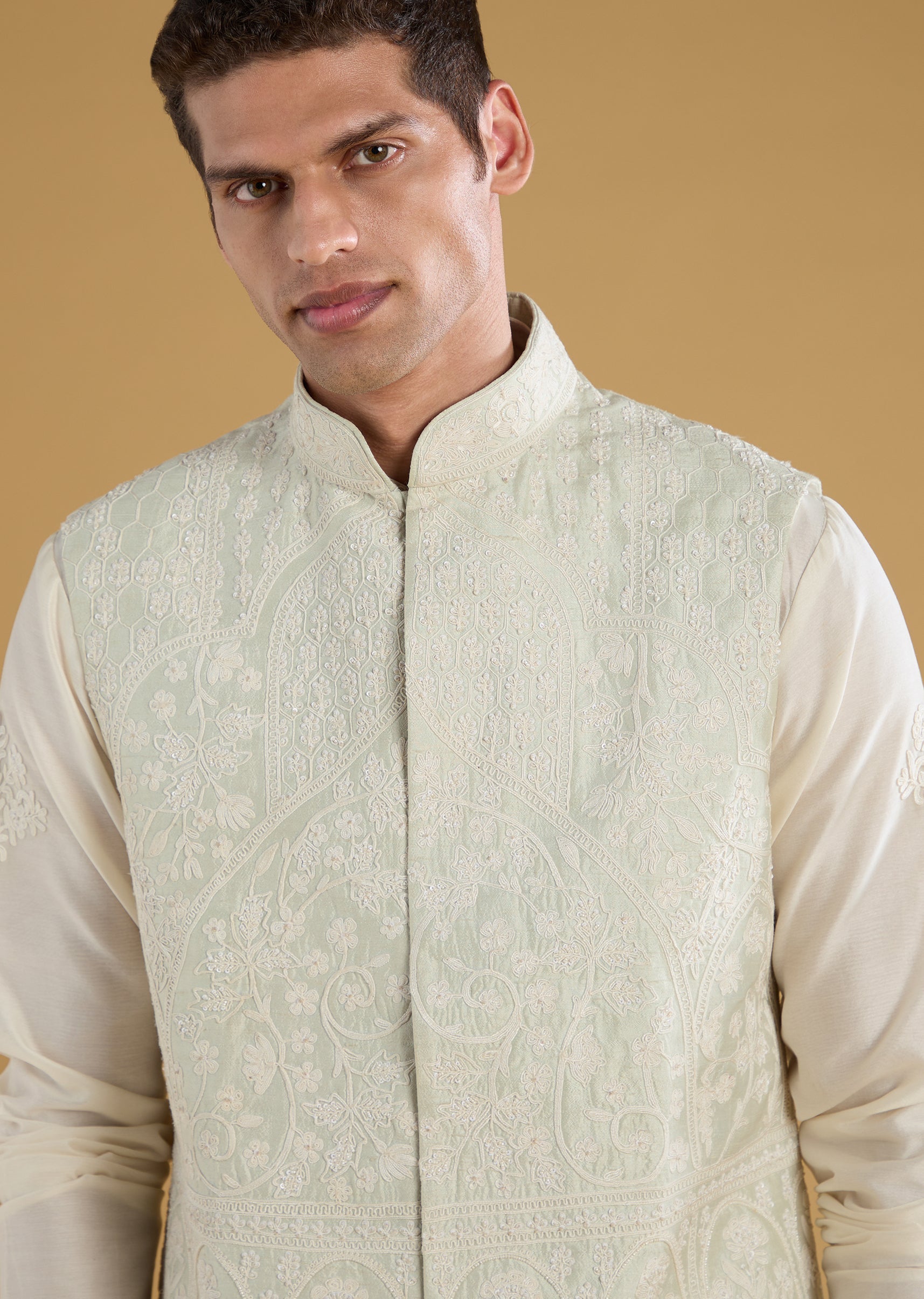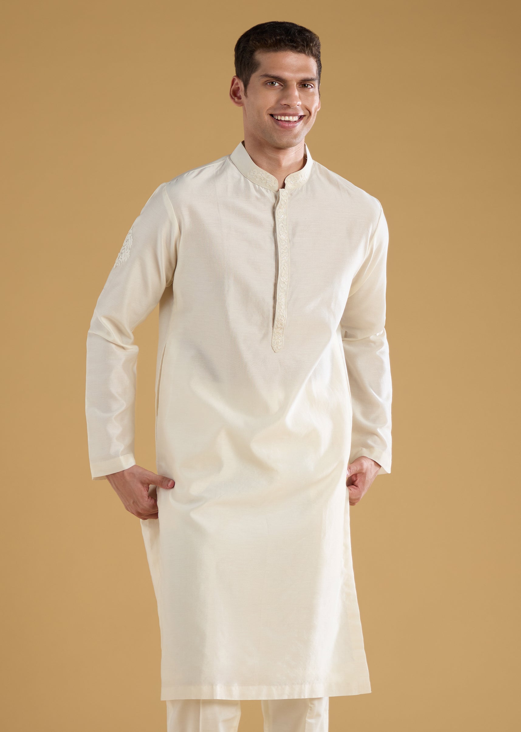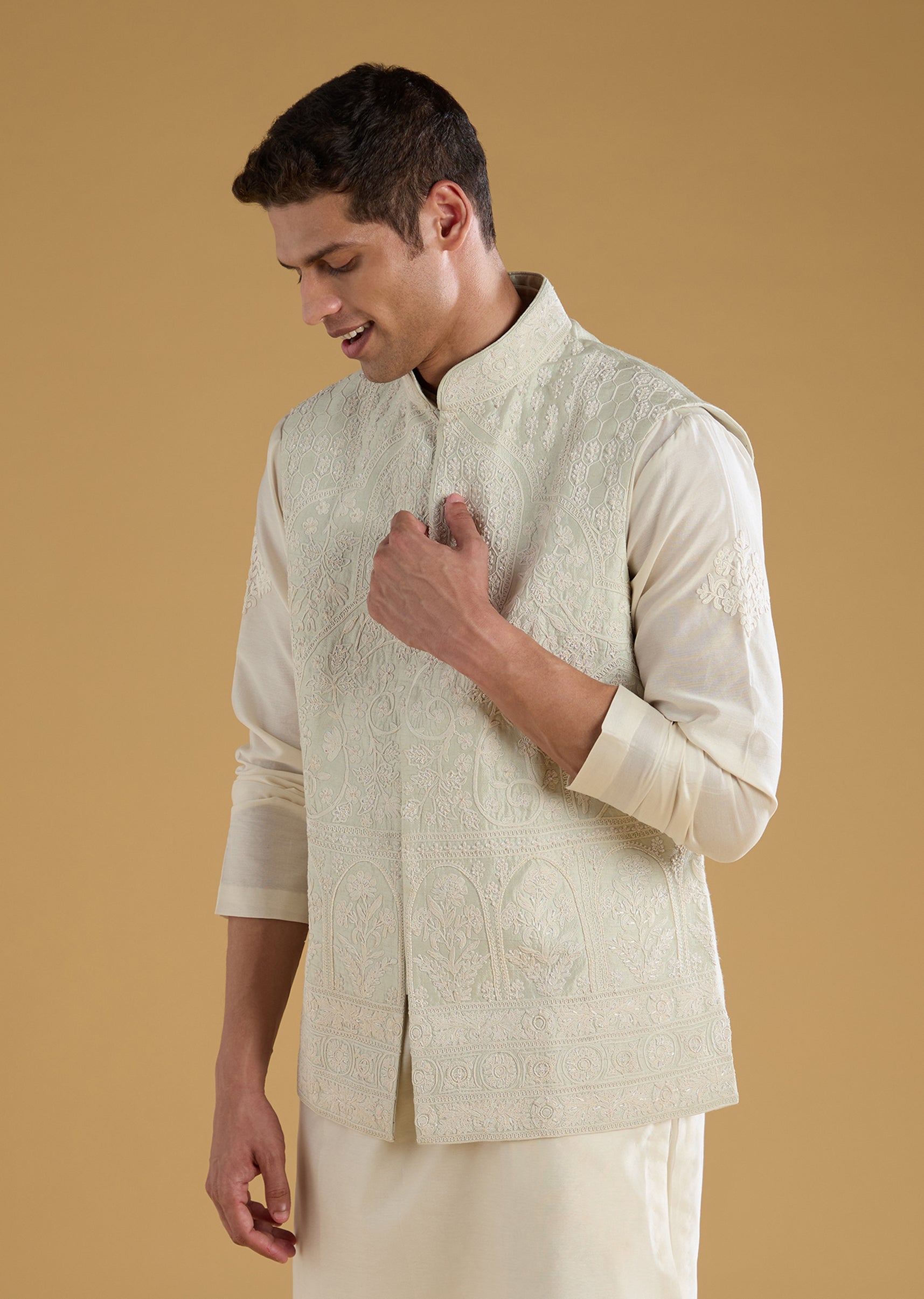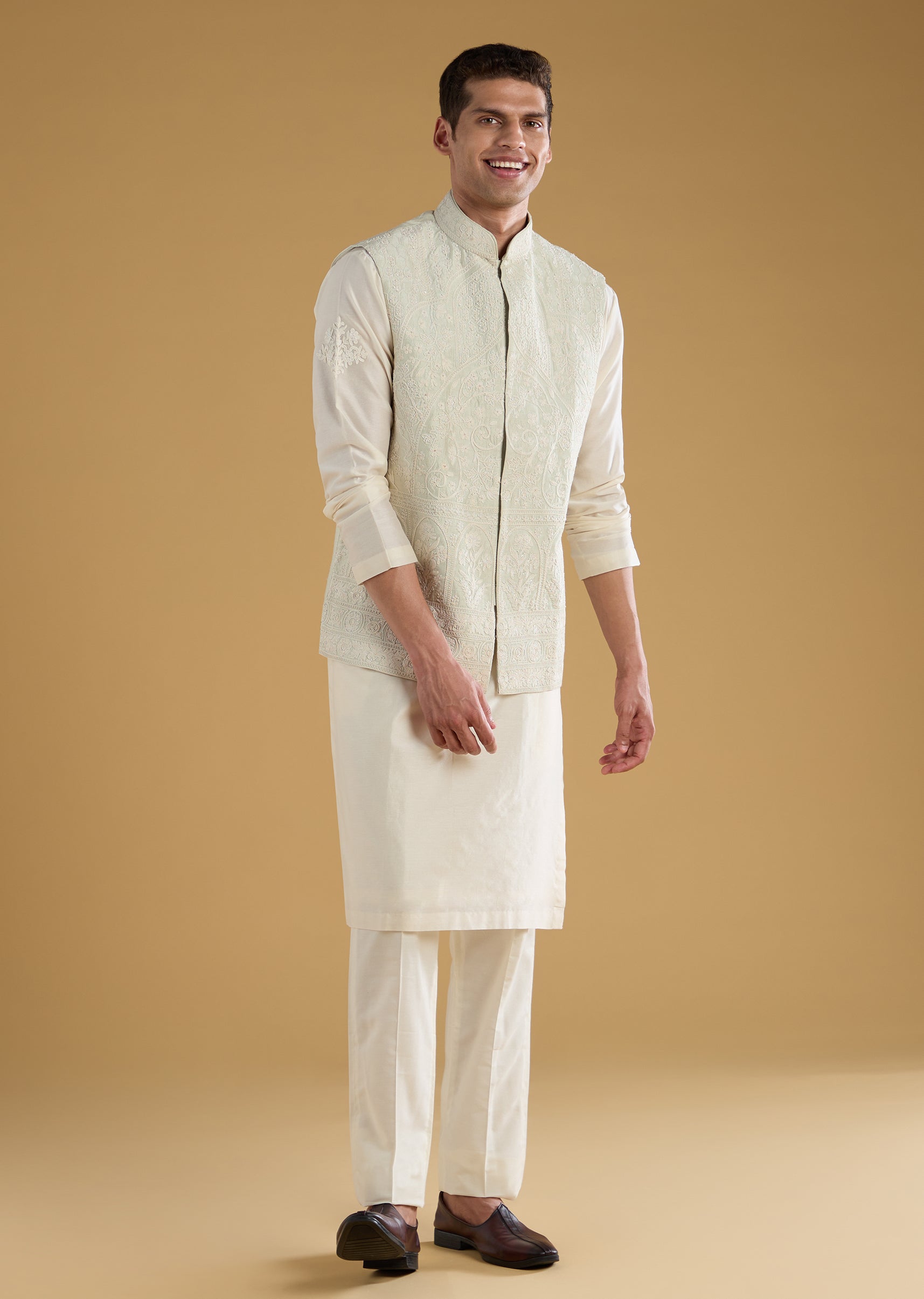 Step into festive sophistication with this Chanderi and raw silk set, where the jacket steals the spotlight with intricate dori, resham, and embroidered detailing. The full sleeve mandarin collar adds a touch of stately charm, while the front hook eye closure keeps the look sharp and seamless. Paired with a classic kurta and tailored pants, this trio brings together rich texture and modern elegance for celebrations that call for standout style. Awarded as the Most Trusted Brand, we're delivering styles you love, just as promised.