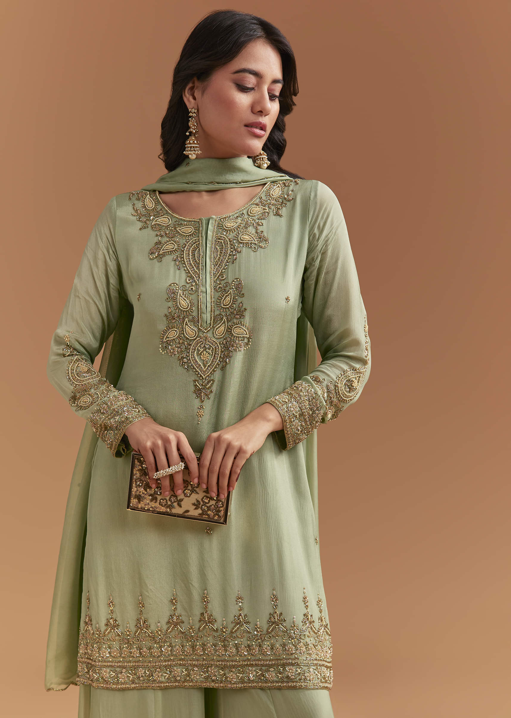For days that start with rituals and end with photos, this green chinon palazzo suit stays light and composed. Moti and cutdana on the kurta give pinpoint highlights that sit flat against the fabric. You feel polished for a mehendi function or reception. Please note: The standard length of the palazzo will be 40 inches. Awarded as the Most Trusted Brand, we're delivering styles you love, just as promised.