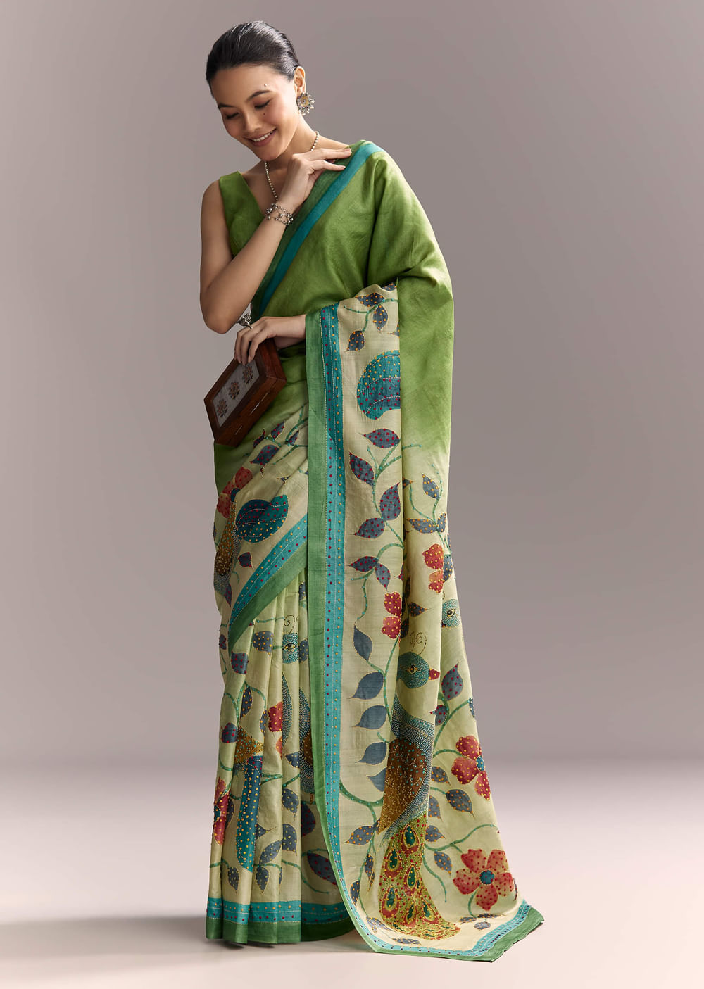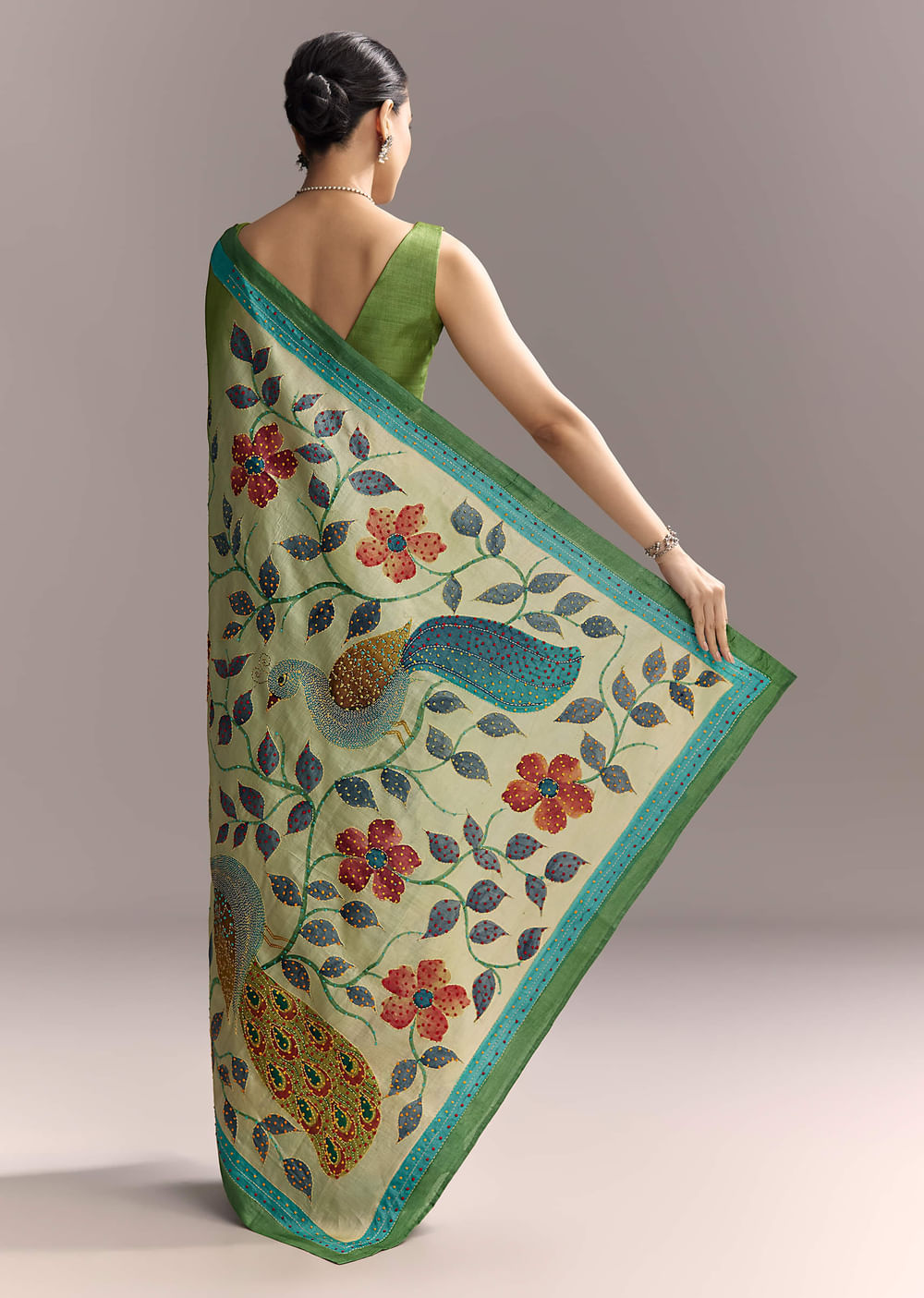 Green Cotton Saree With Hand Painted Motifs And Blue Border