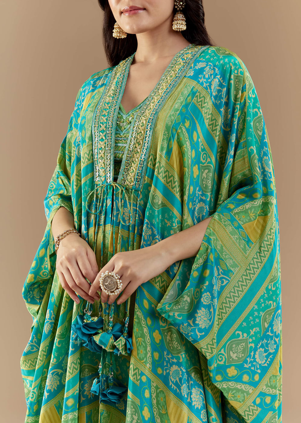 Fit Tips:Ensure the palazzos sit comfortably at the waist and the cape drapes fluidly for a balanced, elegant finish.