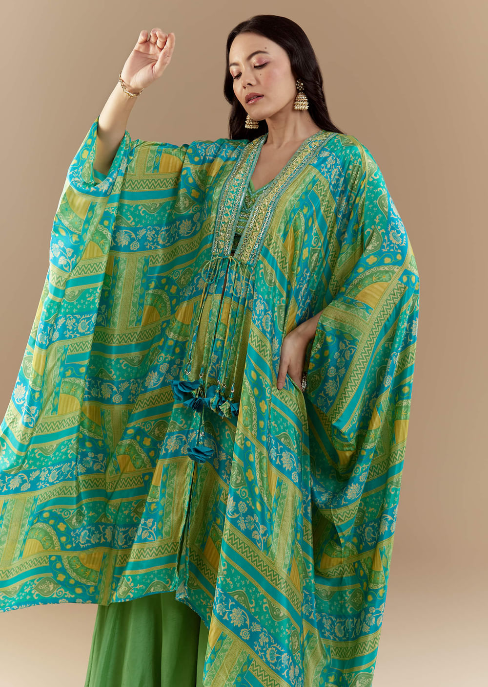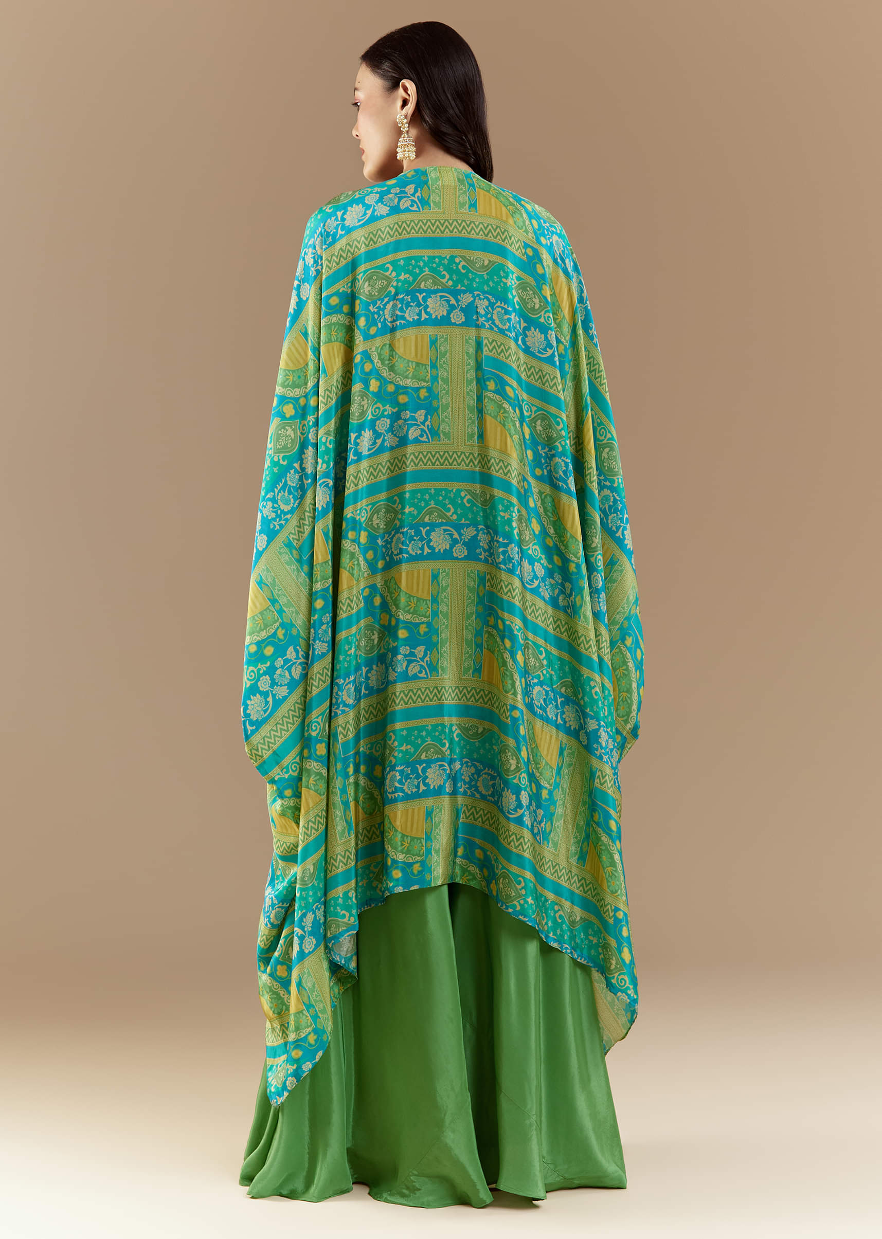 Green Crop Top Palazzo Set with Printed Cape