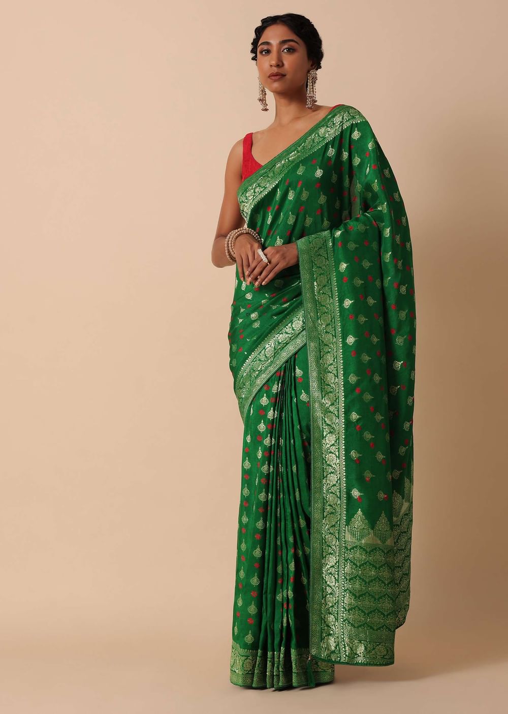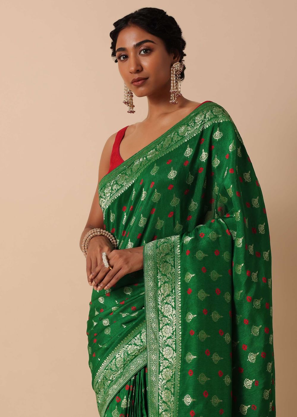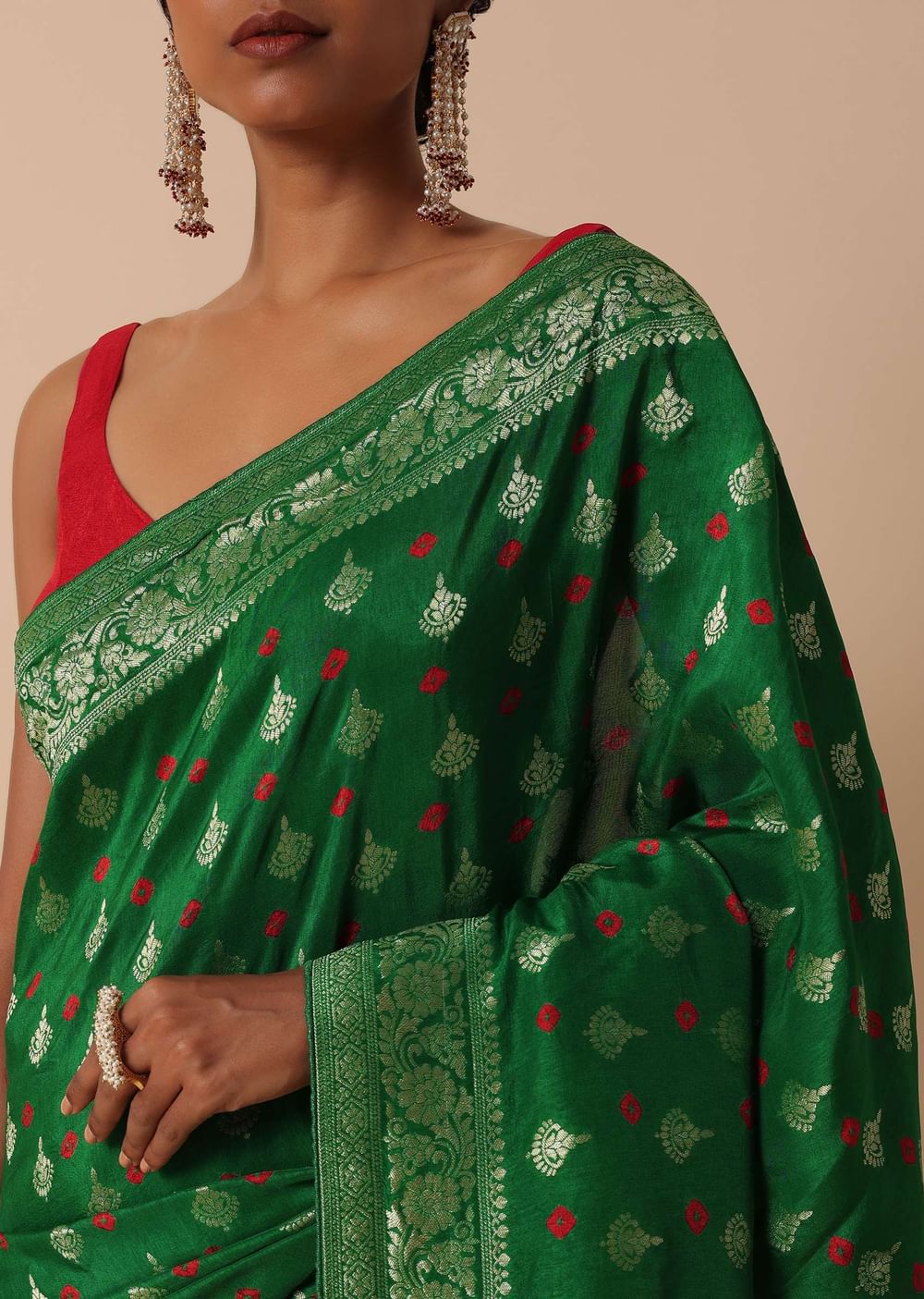 Step into festivities with grace in this exquisite Dola Silk Banarasi Saree featuring intricate Bandhani and Zari weave. Crafted in a lush green hue, the saree exudes timeless charm, perfect for celebratory occasions. The ensemble includes a contrasting blouse fabric, allowing you to tailor it to perfection. Elevate your ethnic wardrobe with the opulence of Dola silk. Blouse design may vary. Actual color may slightly vary due to photographic lighting sources and device screen settings. Awarded as the Most Trusted Brand, we're delivering styles you love, just as promised.