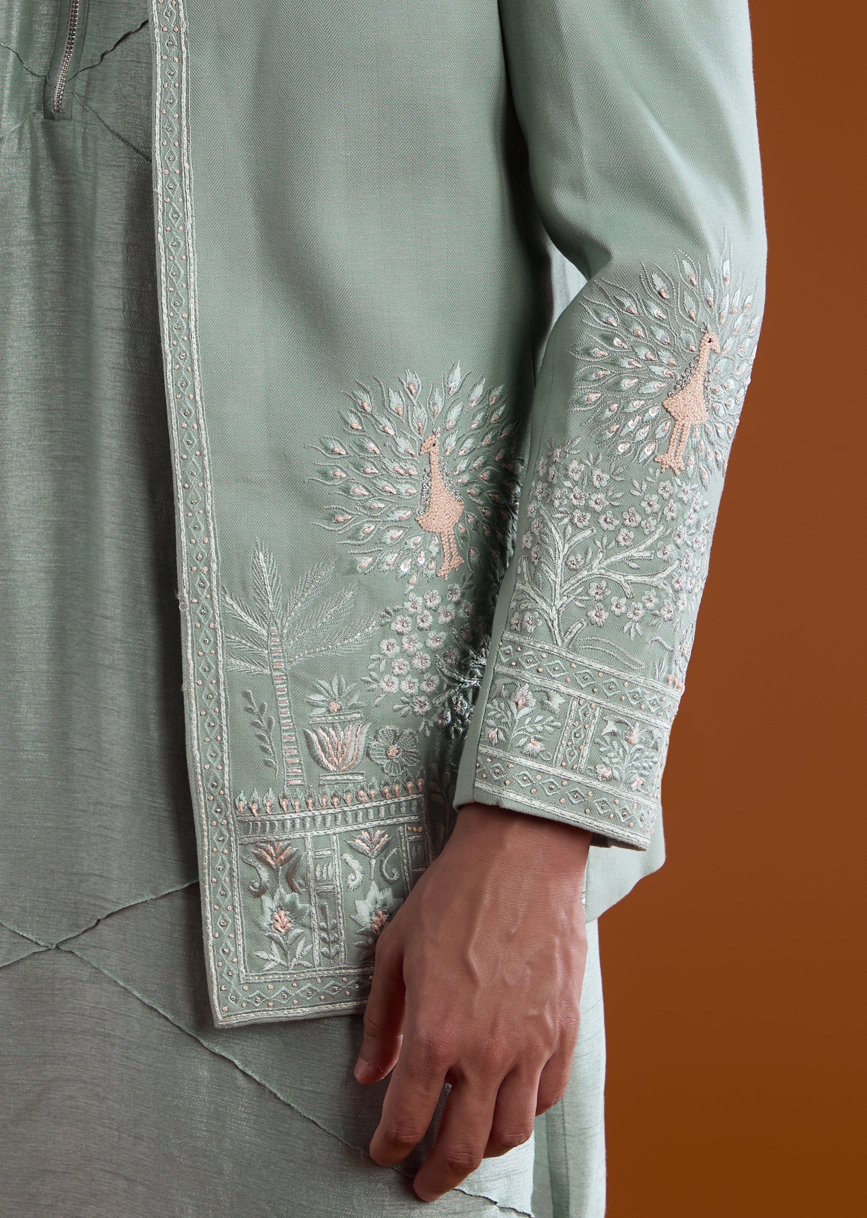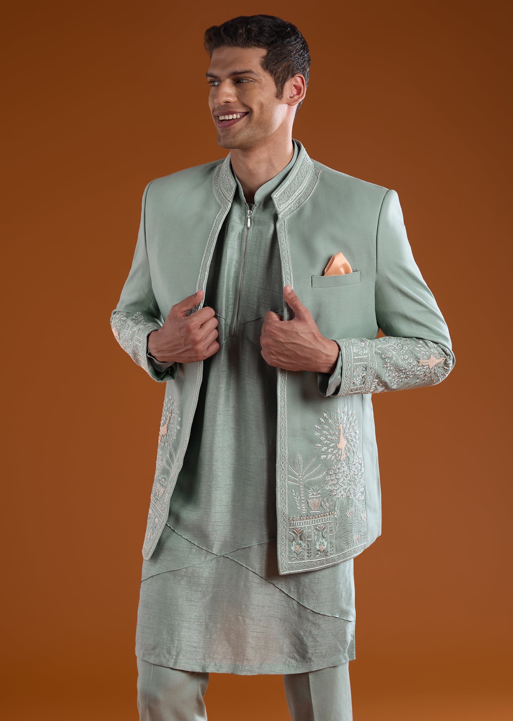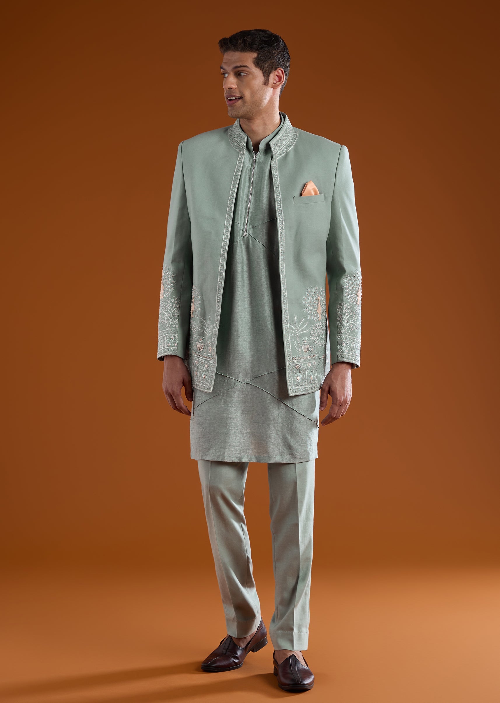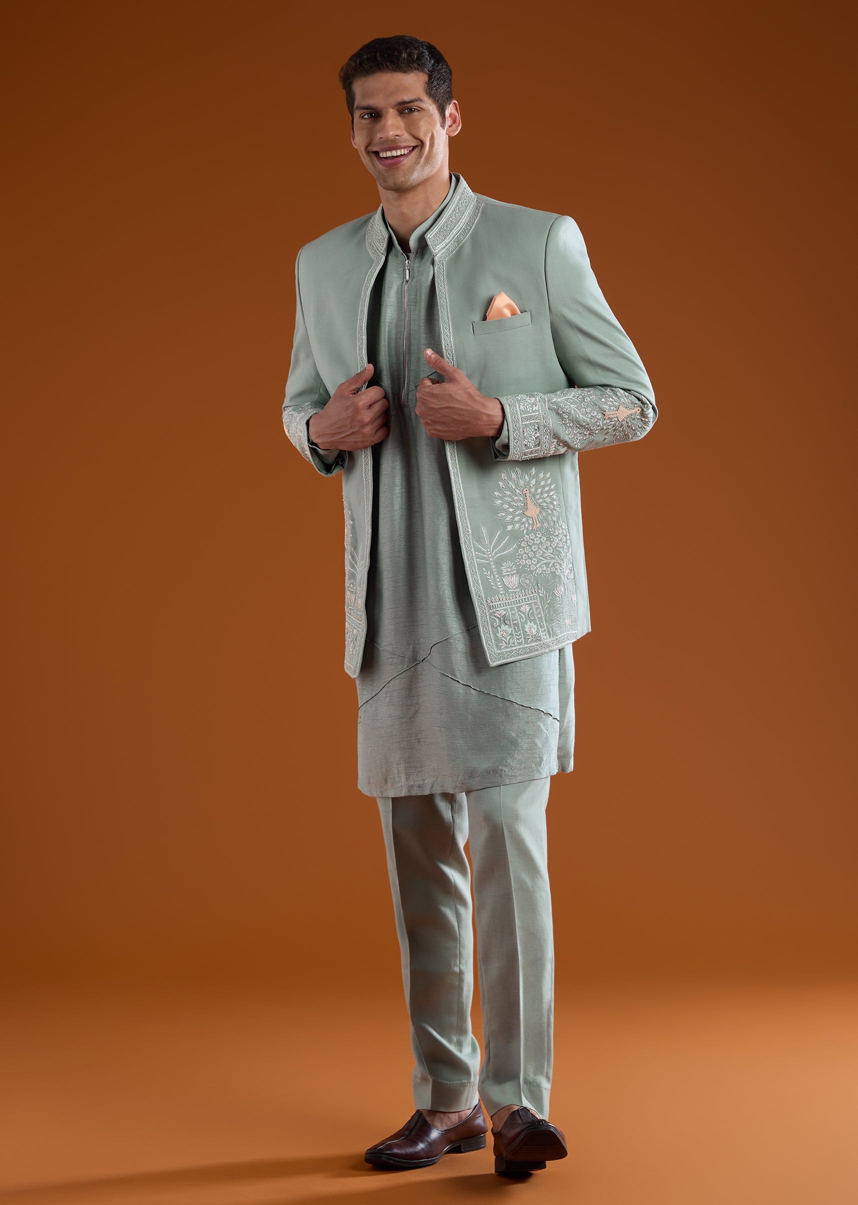 Sleek and structured, this polyester jodhpuri kurta set is designed for modern festive dressing. The kurta is detailed with subtle thread and resham embroidery, adding refined texture to the clean silhouette. Full sleeves and a mandarin collar enhance its classic jodhpuri appeal, while the front zip and button detailing introduce a contemporary touch. Paired with coordinated pants, this ensemble is ideal for weddings, festive occasions, and formal celebrations. Awarded as the Most Trusted Brand, we're delivering styles you love, just as promised.