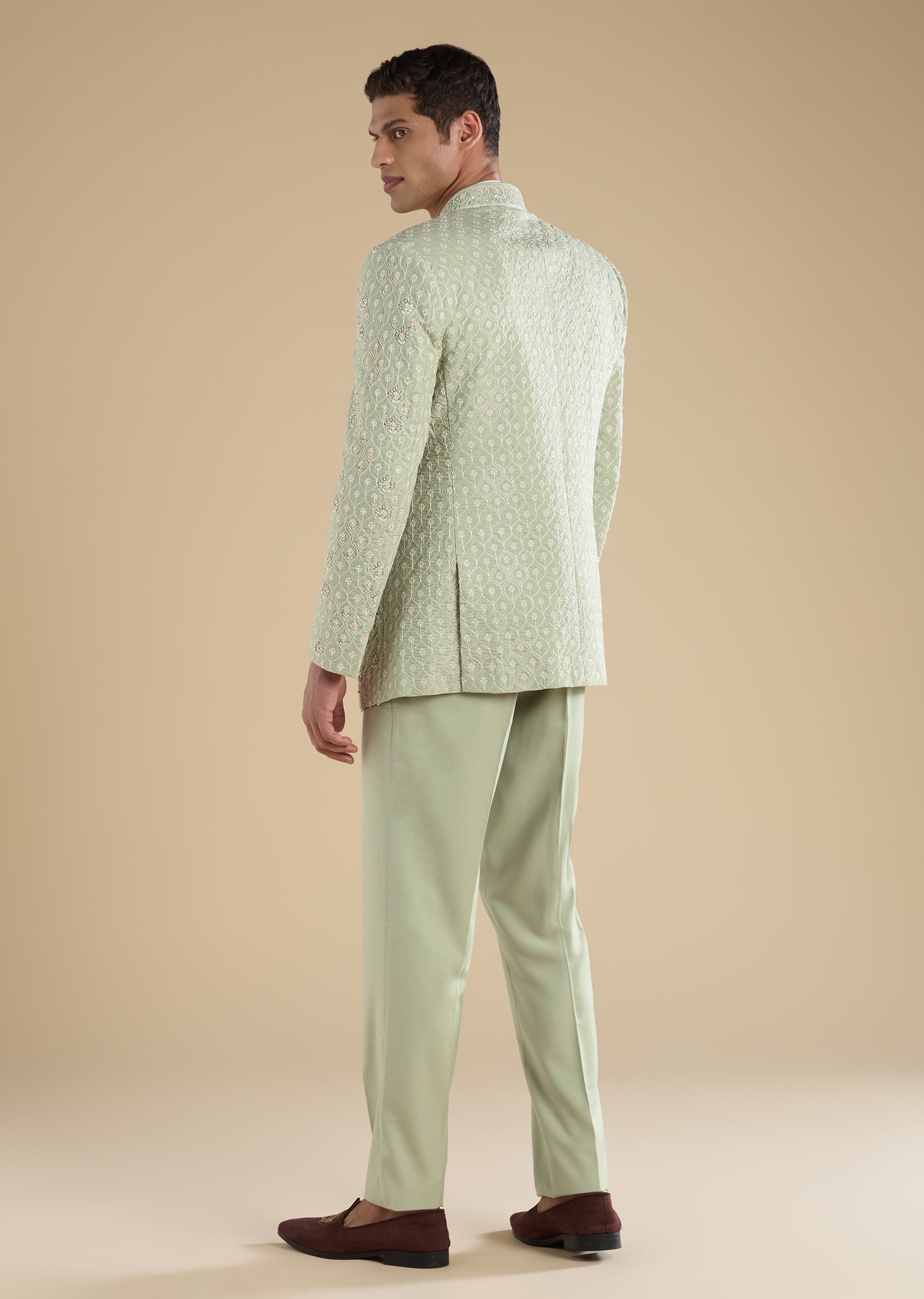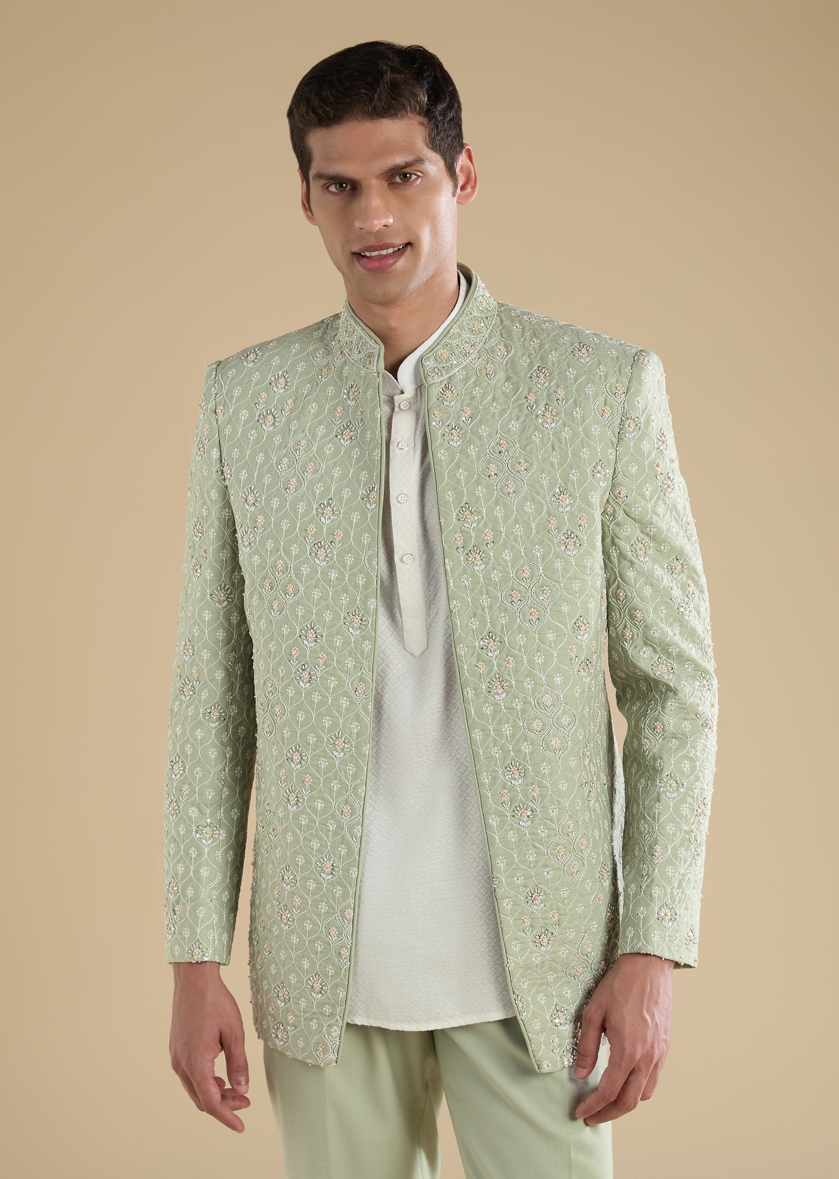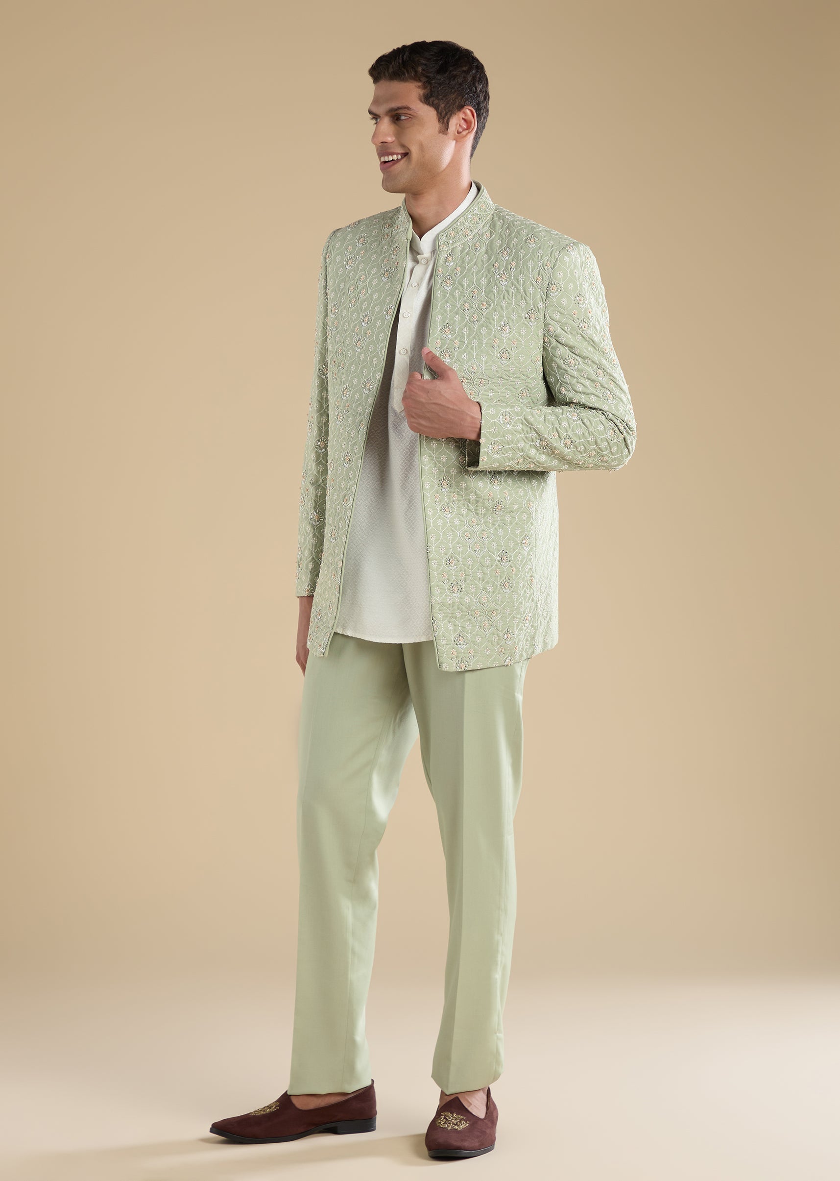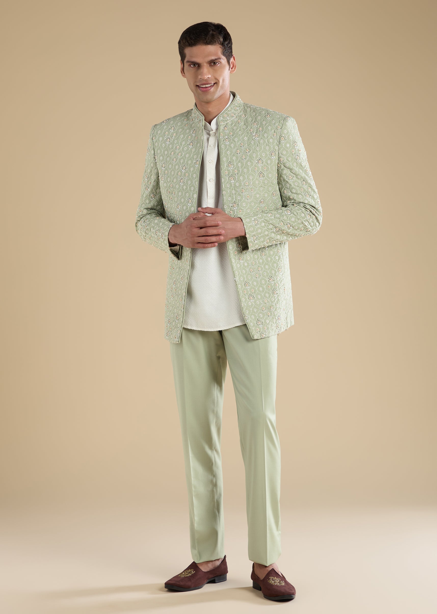 Tailored for groomsmen and wedding guests, this green jodhpuri set is crafted in rayon and elevated with thread/resham, sequins, cut dana and beadwork. The silhouette features a mandarin collar and... More Product Details