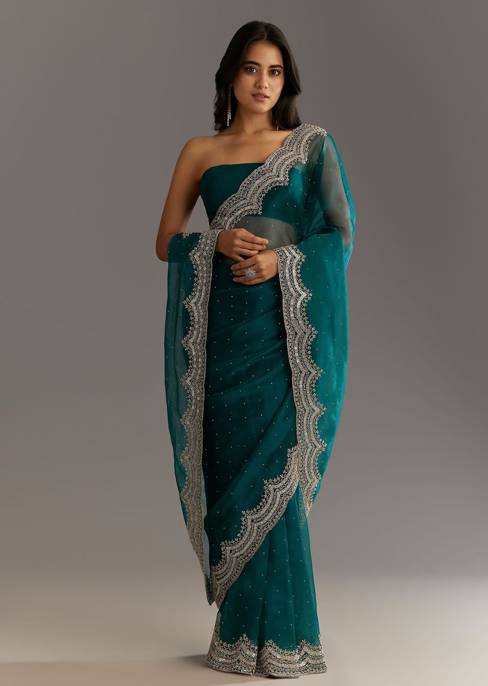 Dusted in forest gems this green tissue saree gleams with stones and a cutdana border like woodland royalty in celebration.Awarded as the Most Trusted Brand we're delivering styles you love just as promised.