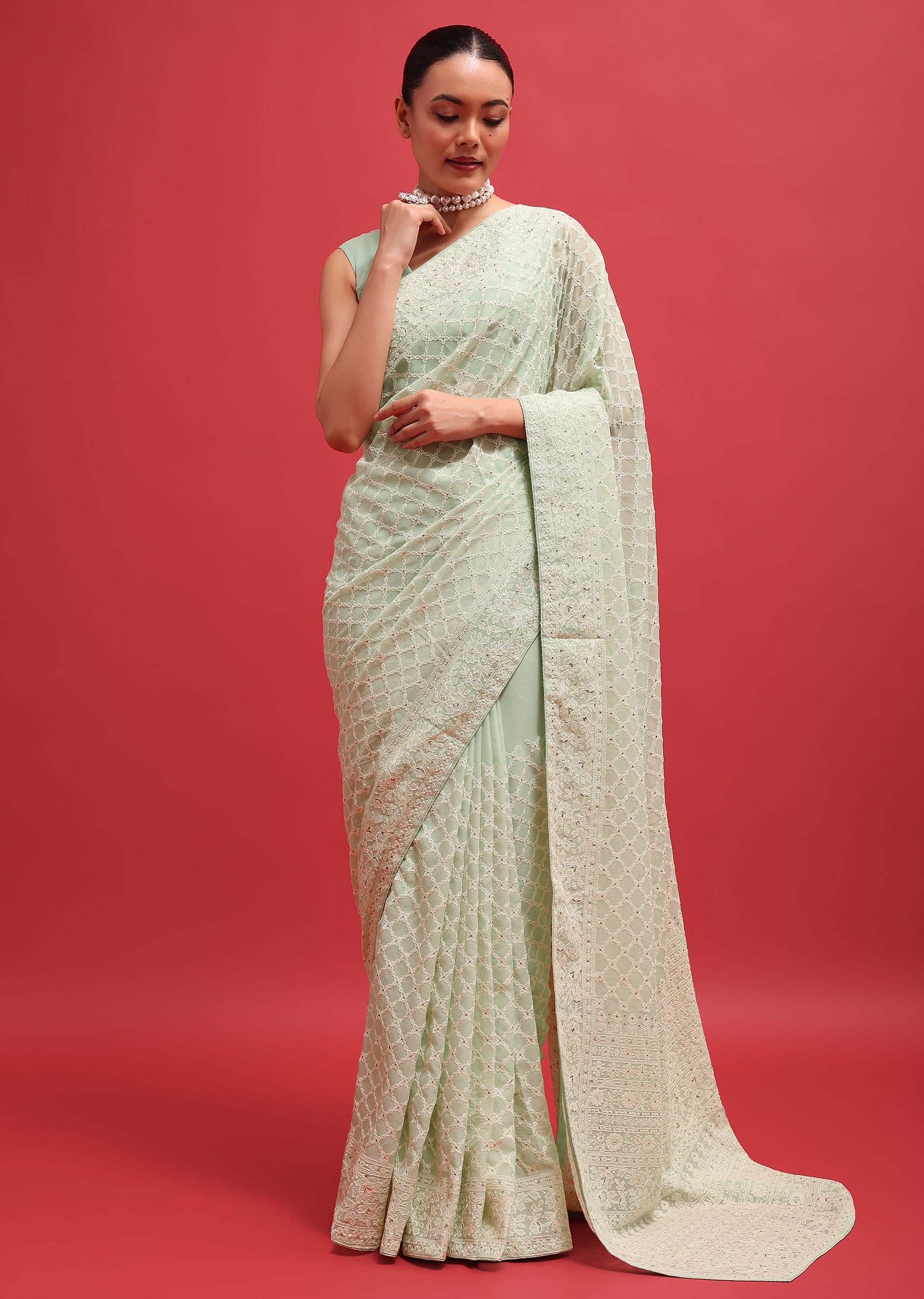This ethereal green Georgette saree whispers of summer gardens. Delicate chikankari embroidery dances across the translucent fabric, creating a piece as light and airy as a daydream. Perfect for twirling under fairy lights at a summer soirée, or adding a touch of whimsical elegance to a daytime soiree. Comes with an unstitched blouse. Awarded as the Most Trusted Brand, we're delivering styles you love, just as promised.