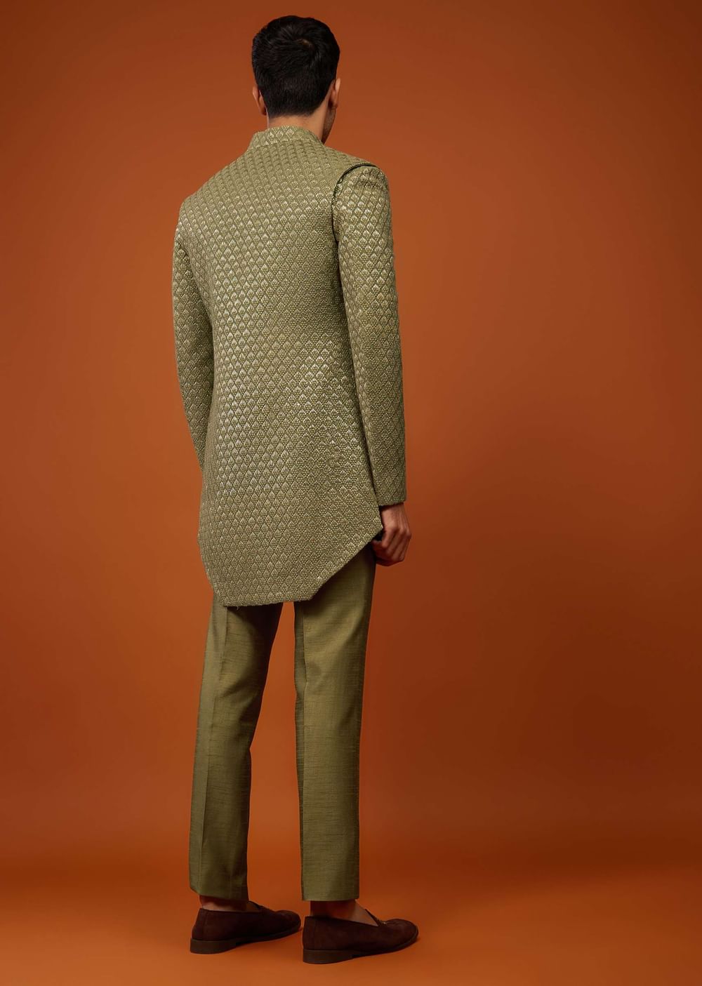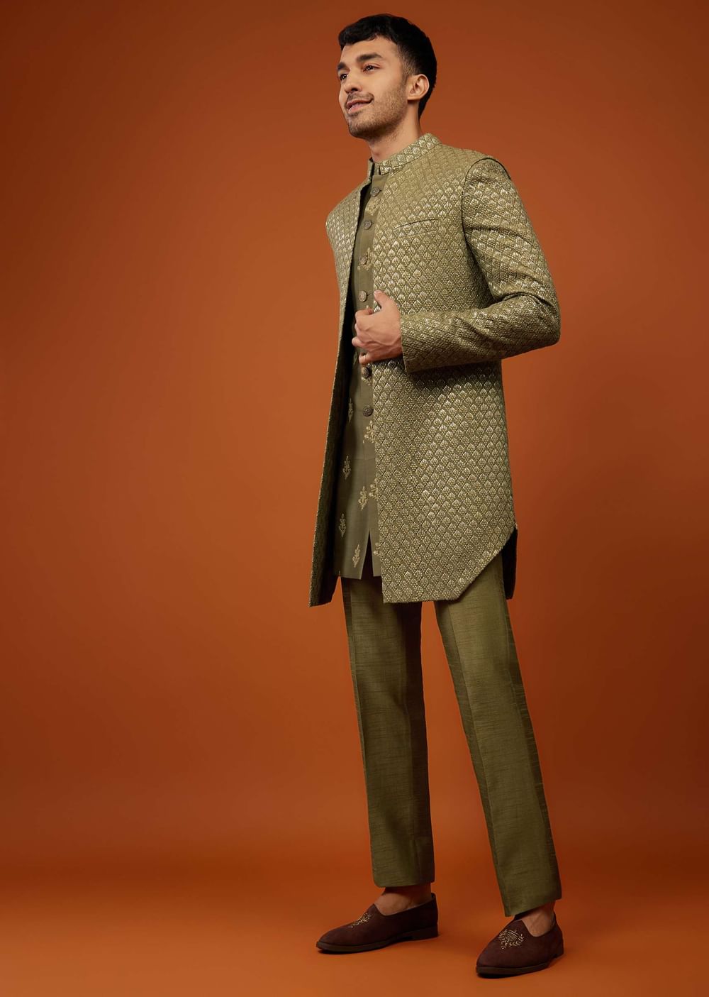 Moss Green Embroidered Indo-Western Sherwani Set In Tussar Silk