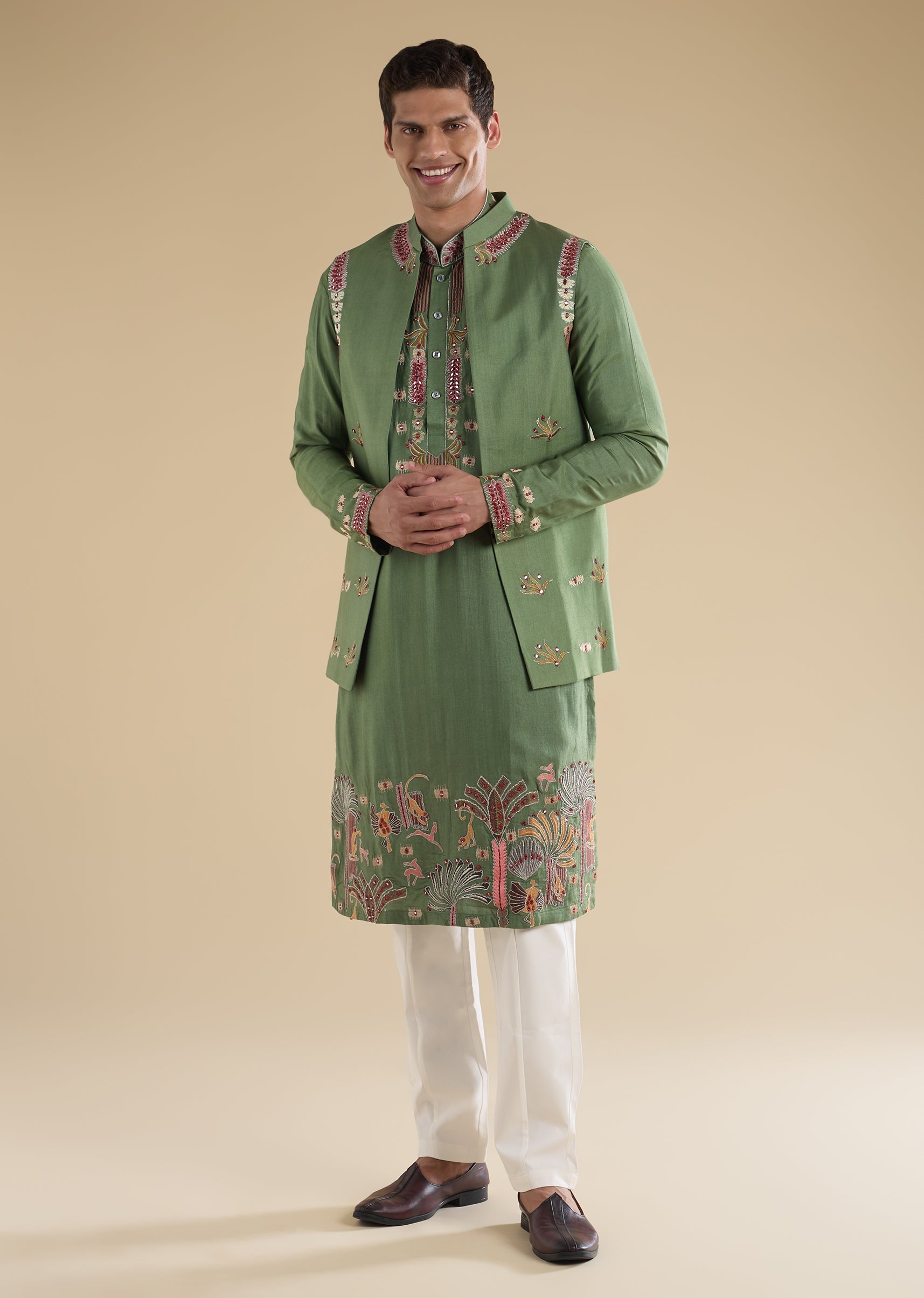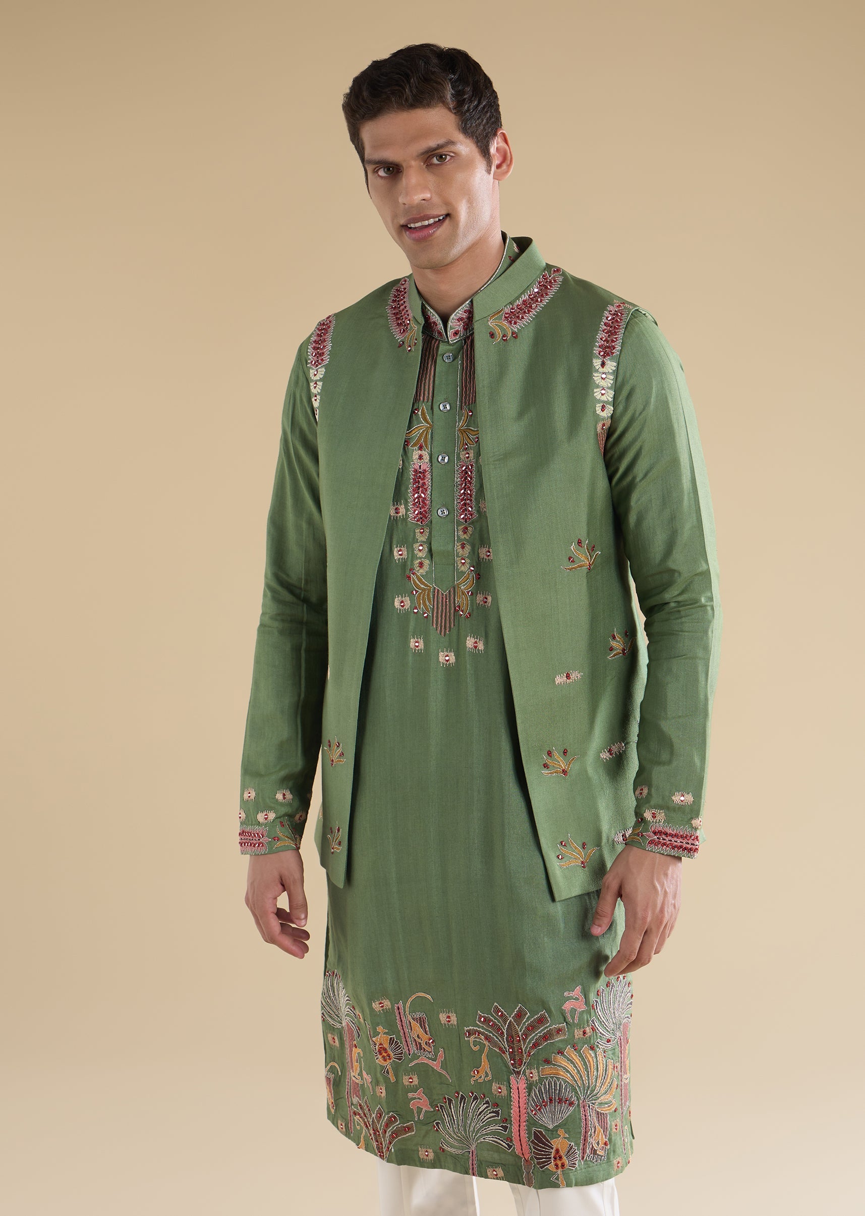 A refined green kurta jacket set crafted in cotton silk, featuring intricate thread and mirror embroidery that adds subtle festive shine. Designed with a structured jacket layered over a classic kurta and straight-fit pants, this Indo-western ensemble is ideal for mehendi and haldi functions, making it a perfect pick for groomsmen seeking elegance with comfort.