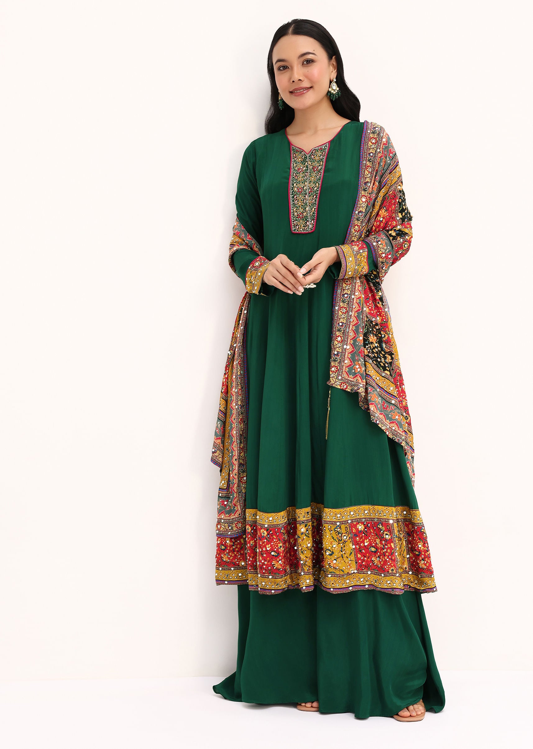 Green Embroidered Satin Kurta Palazzo With Dupatta