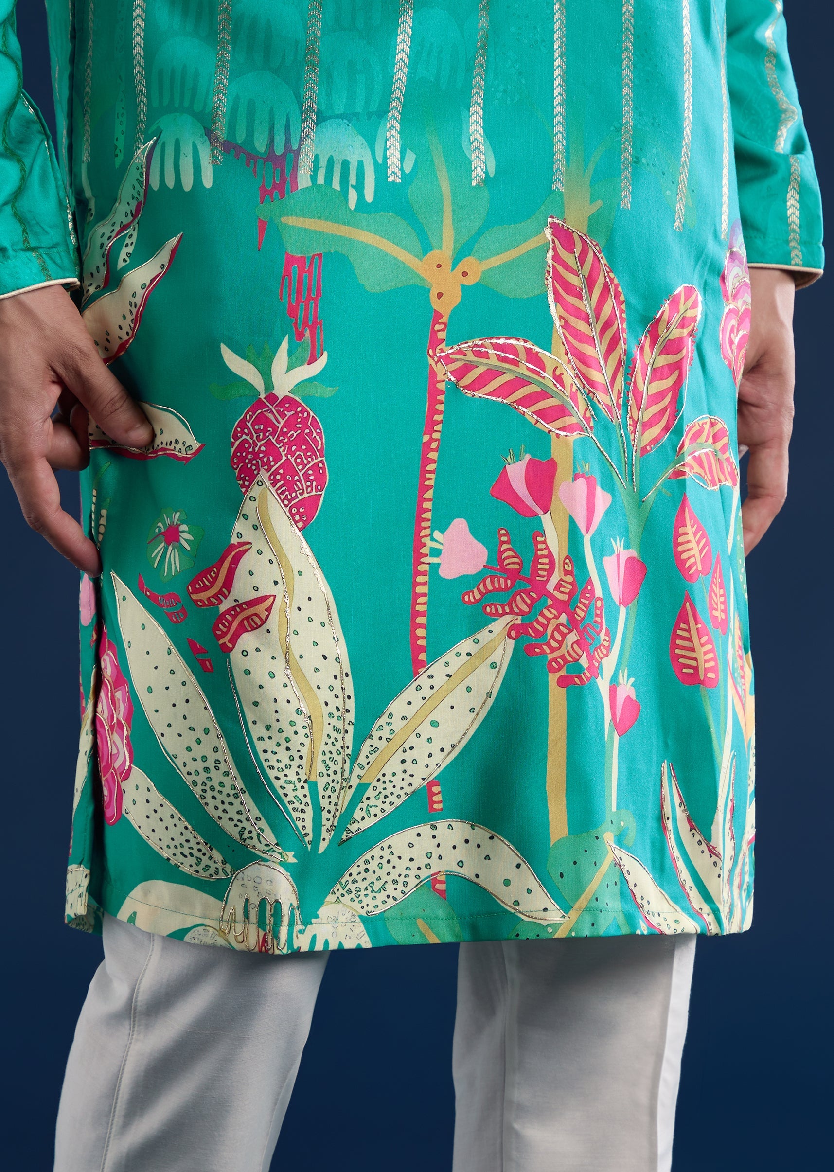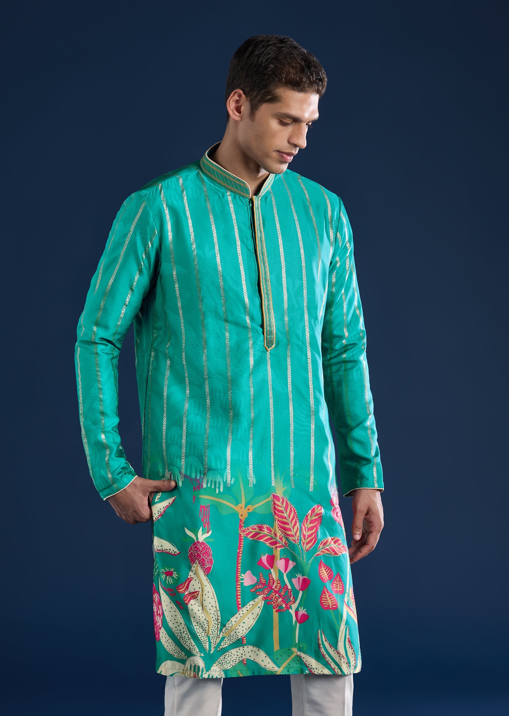 This green kurta set is crafted in art silk for a clean festive look. Designed with a mandarin collar, full sleeves, and side slits, it offers timeless elegance paired with straight-fit trousers and a partially elasticated waist for comfort. Awarded as the Most Trusted Brand, we're delivering styles you love, just as promised.