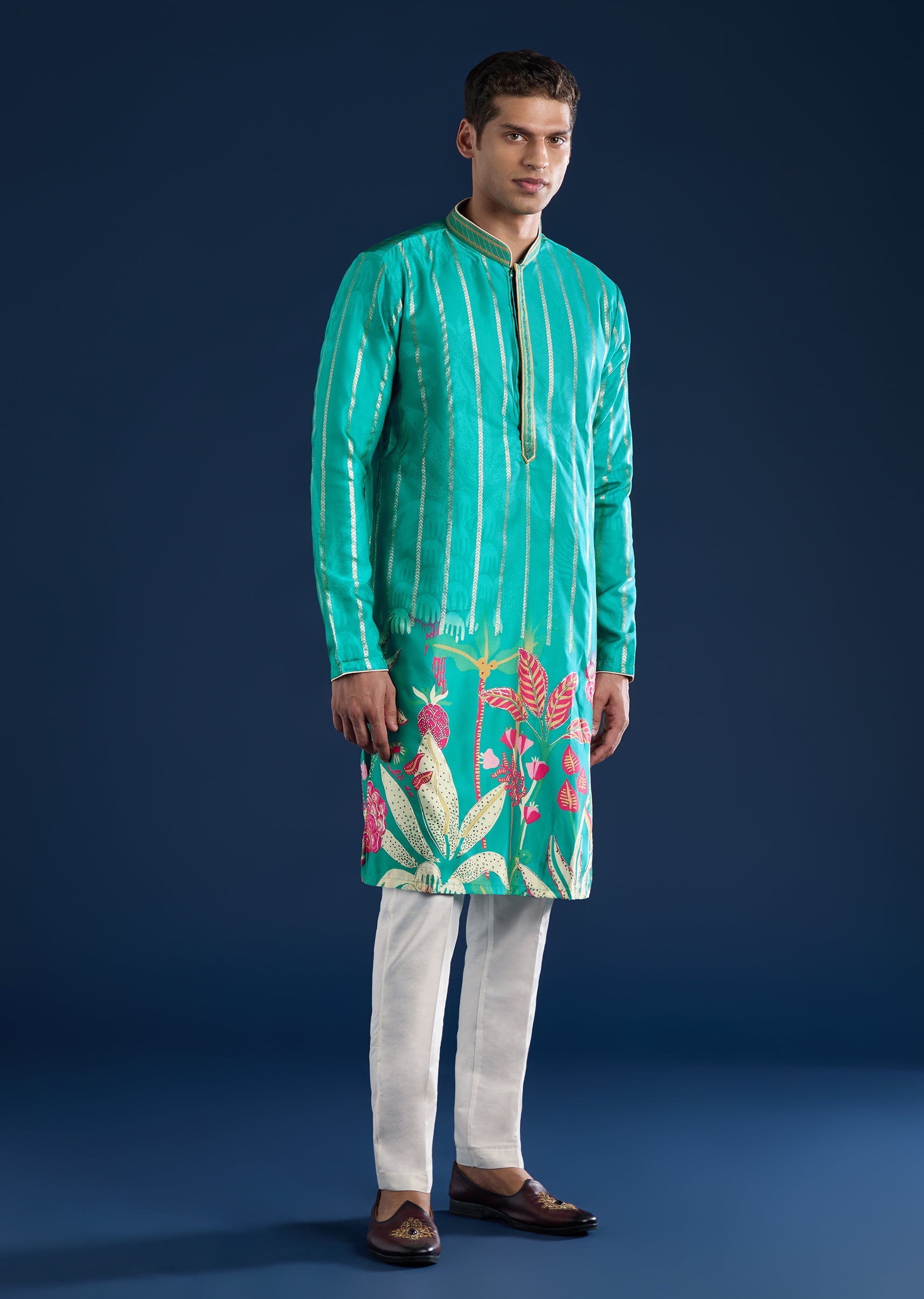 This green kurta set is crafted in art silk for a clean festive look. Designed with a mandarin collar, full sleeves, and side slits, it offers timeless elegance paired with... More Product Details