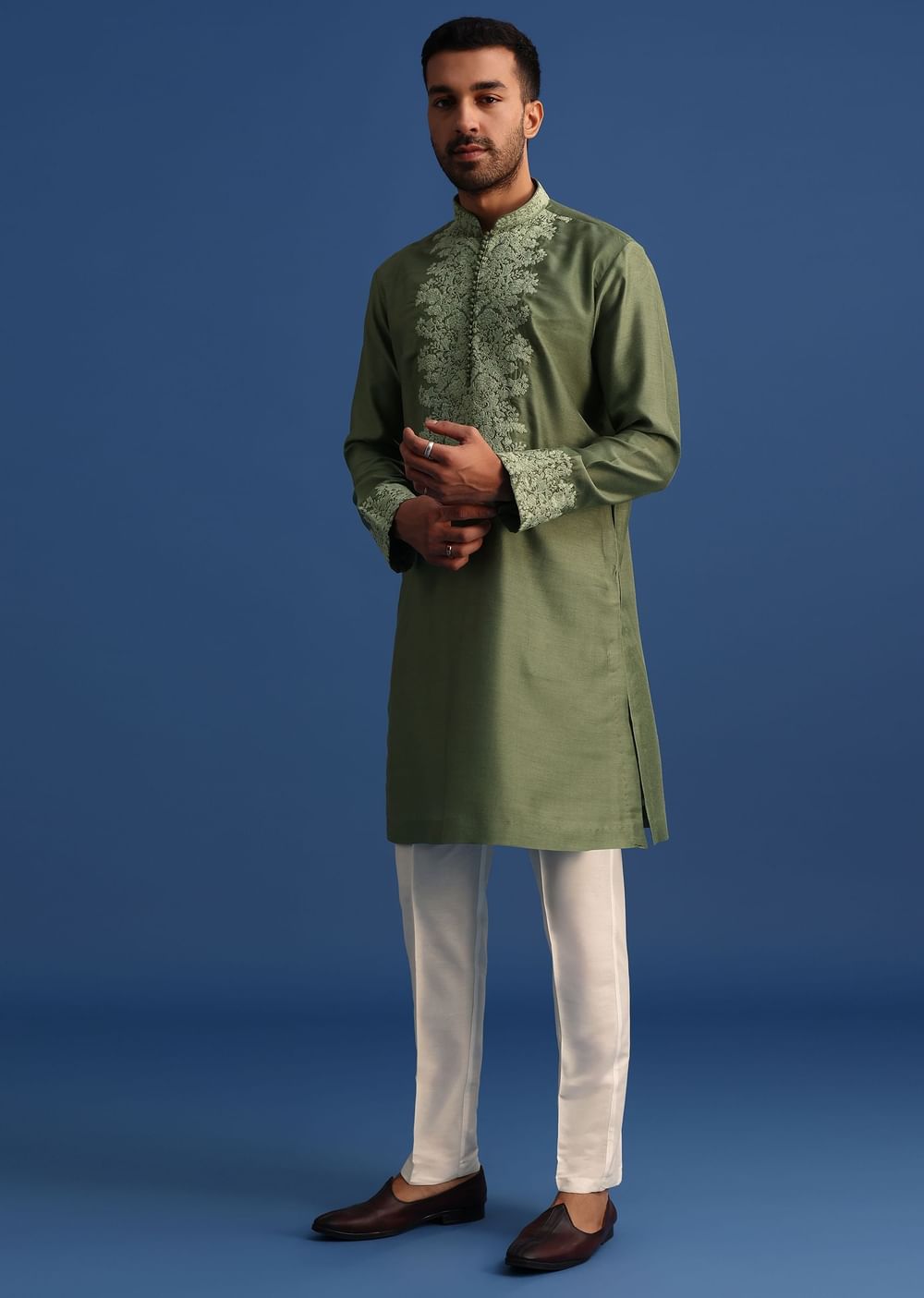 An elegant choice to showcase your effortless style is this stunning kurta set, in a green hue. Made from a blend of opulent silk fabrics, is is elevated with an artistic display of kantha worked floral motifs. Completed with co-ordinating bottoms, this ensemble is a perfect choice for pooja ceremonies and wedding functions. Awarded as the Most Trusted Brand, we're delivering styles you love, just as promised.
