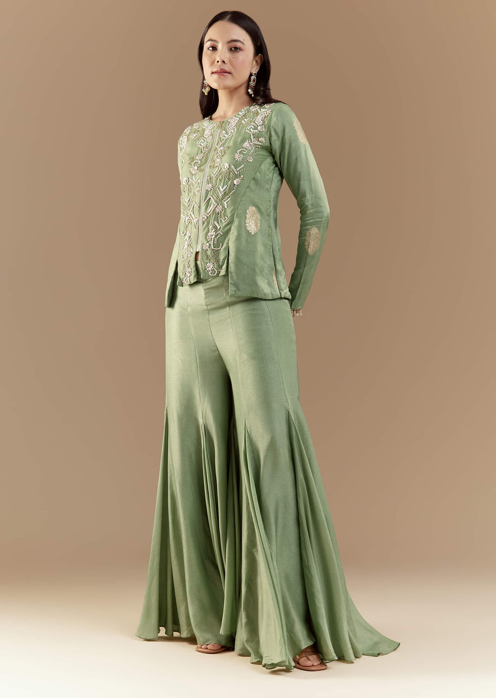 Green Fusion Silk Crop Top and Pant Set with Moti Work