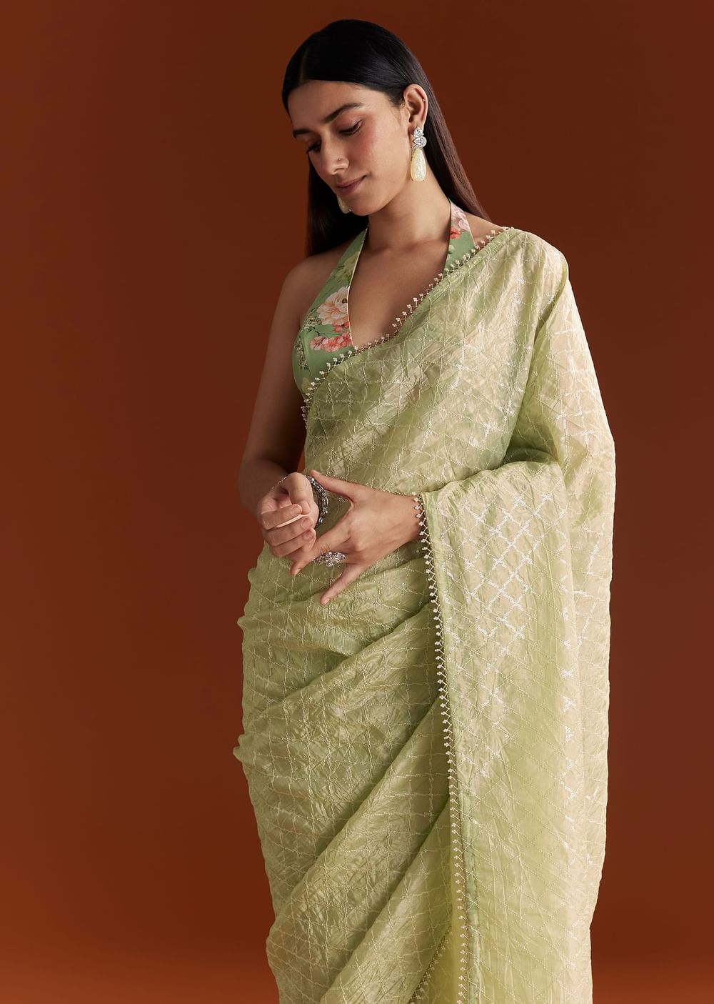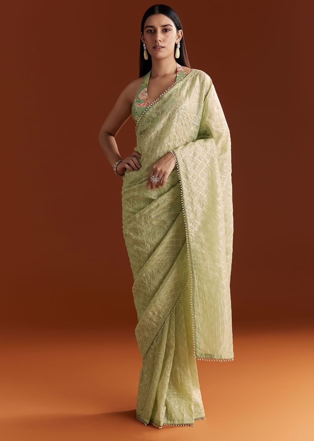 Green Glass Tissue Saree With Sequins And Cutdana Beaded Border