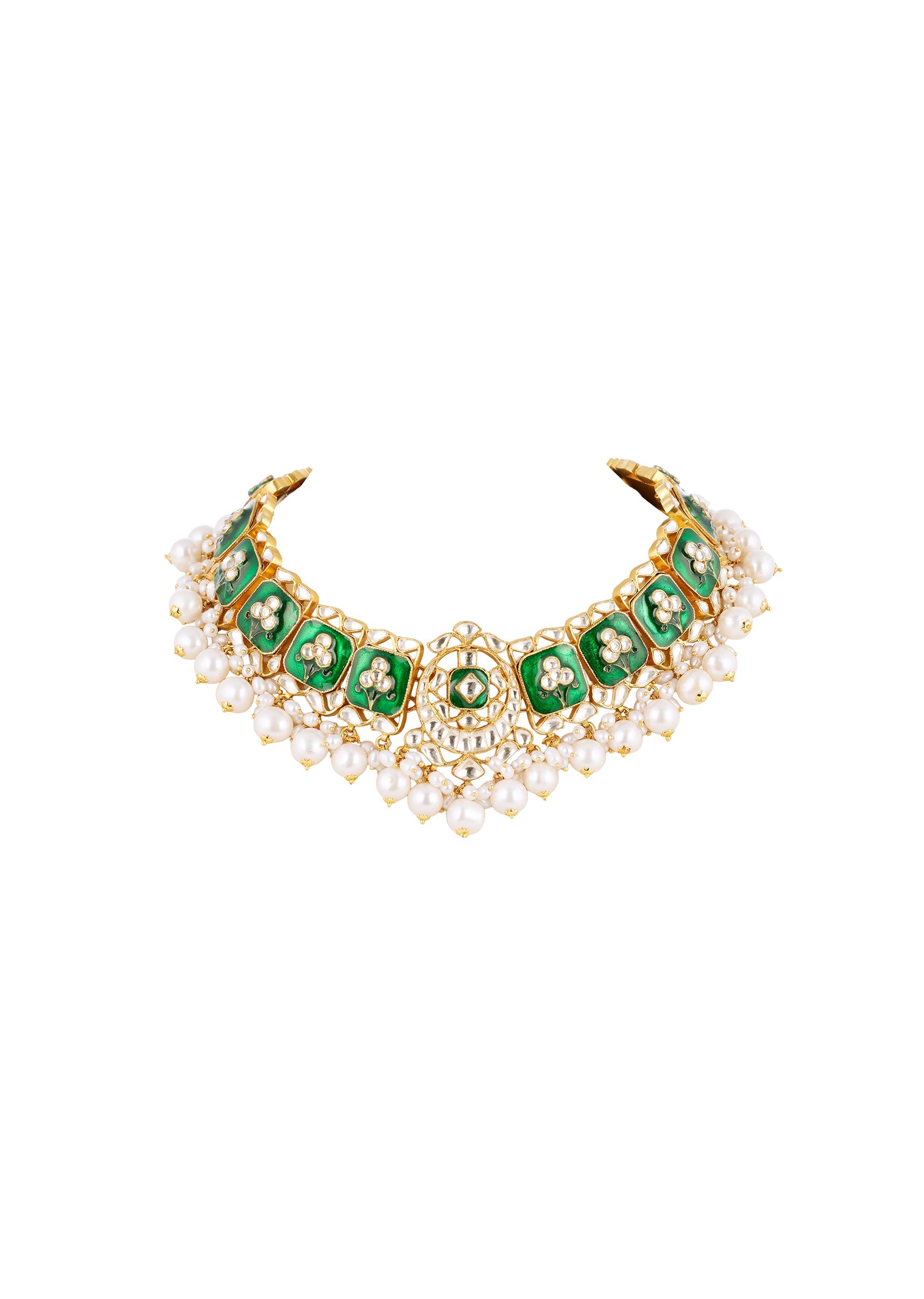 This green and gold necklace set features exquisite kundan craftsmanship that adds a refined sparkle and elegant charm to your look. The intricately designed necklace paired with matching earrings enhances... More Product Details