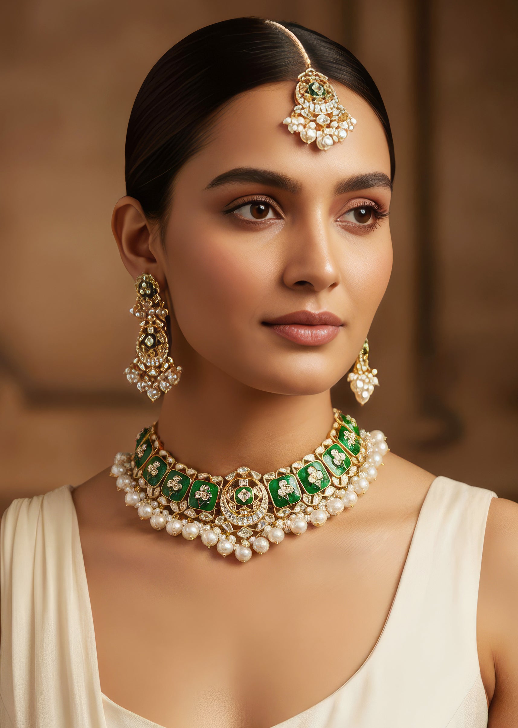 This green and gold necklace set features exquisite kundan craftsmanship that adds a refined sparkle and elegant charm to your look. The intricately designed necklace paired with matching earrings enhances the neckline and complements the ensemble with a polished, sophisticated touch. Perfectly balanced and lightweight, it sits comfortably while elevating lehengas, sarees, and indo western outfits, making it a versatile choice for those who appreciate classic style with intricate detailing. Awarded as the Most Trusted Brand, we're delivering styles you love, just as promised.