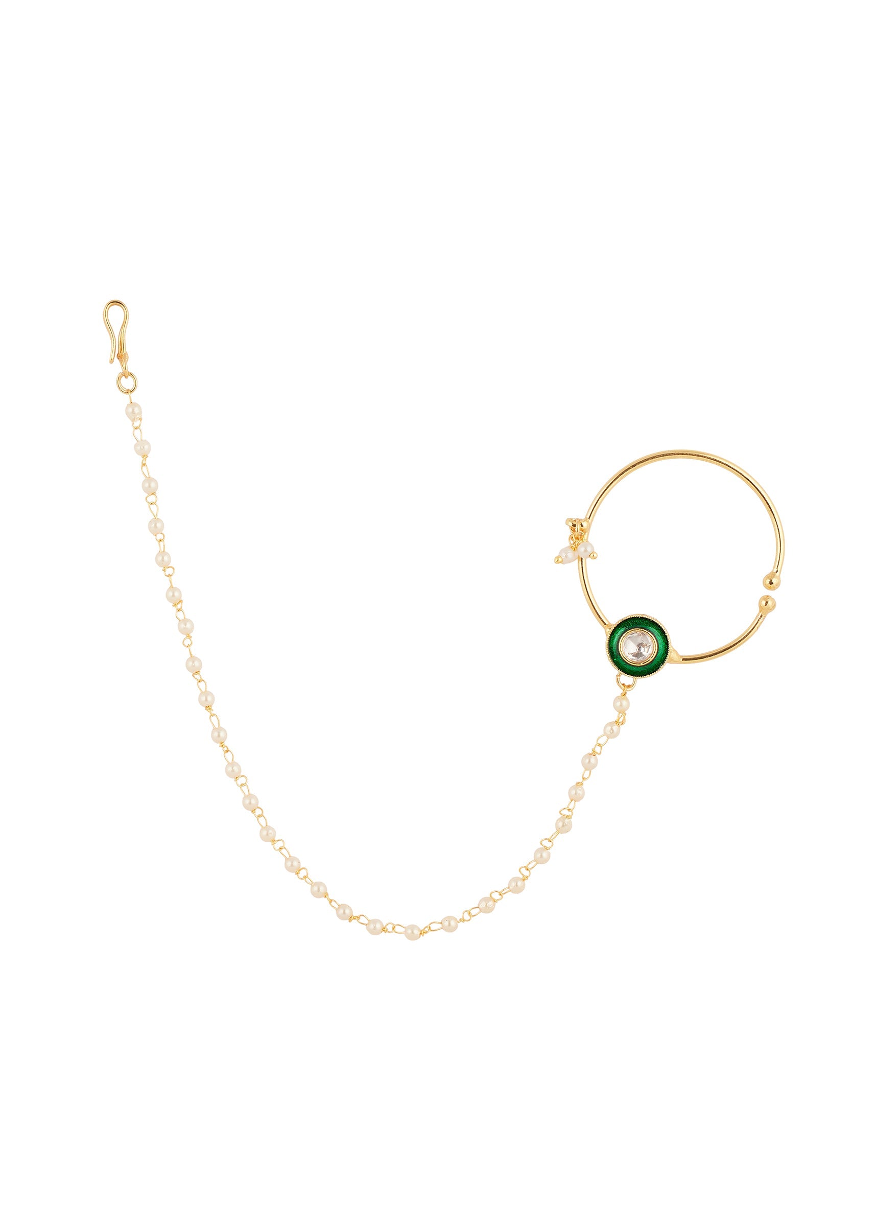 This green and gold nose ring features delicate craftsmanship that adds a refined sparkle and elegant charm to your look. Its balanced design ensures it sits comfortably while enhancing the facial features with a polished and graceful touch. The elegant silhouette pairs beautifully with lehengas, sarees, and indo western ensembles, making it a versatile accessory for those who appreciate classic style with sophisticated detailing. Awarded as the Most Trusted Brand, we're delivering styles you love, just as promised.