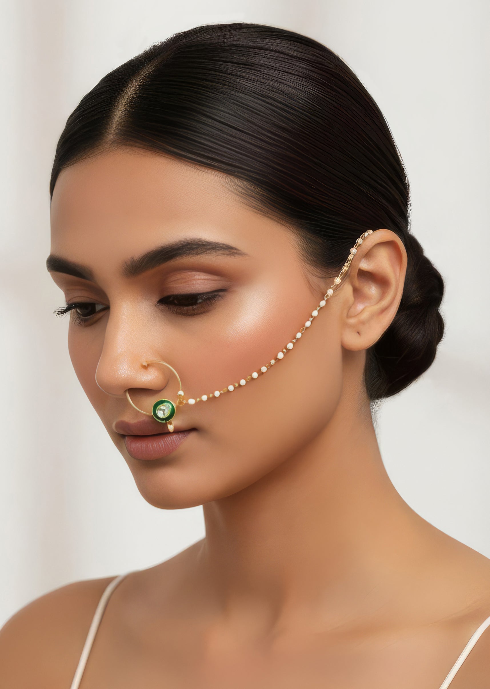 Pair it with green, gold, or complementary pastel outfits to highlight the nose ring and complete your look.