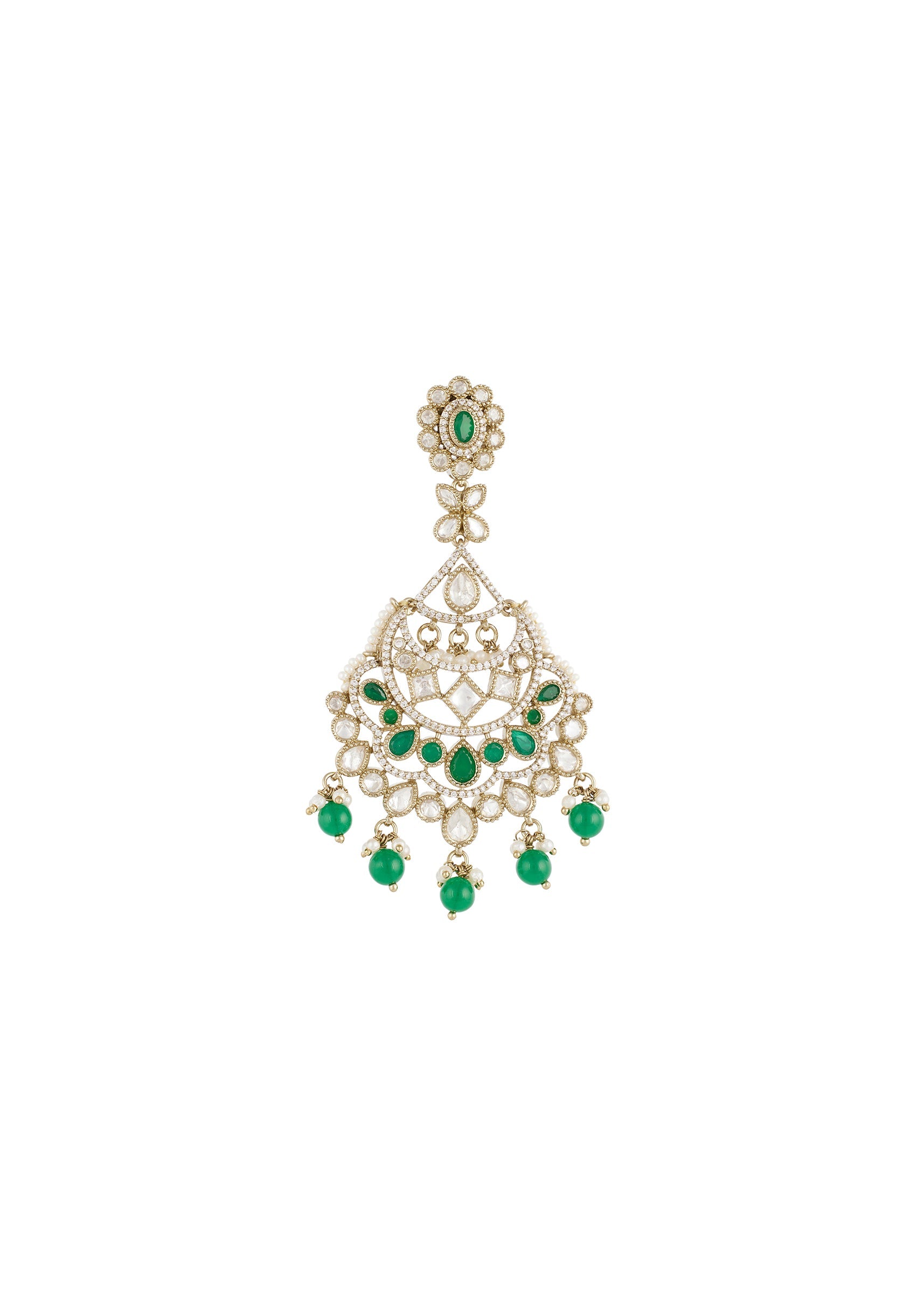 These green and gold earrings feature intricate polki detailing that adds a refined sparkle and vibrant charm to your look. The delicate craftsmanship enhances the timeless appeal of the design,... More Product Details