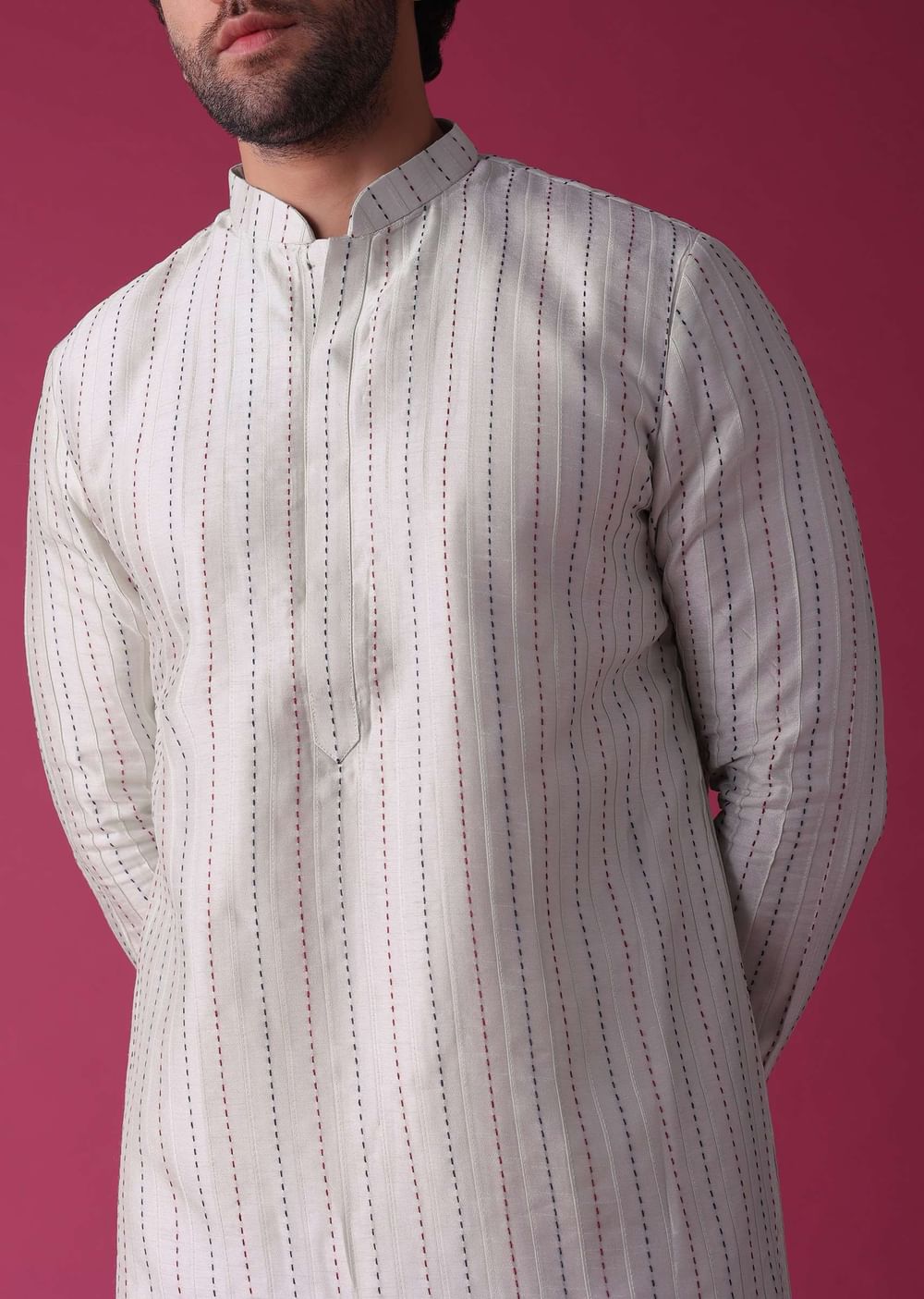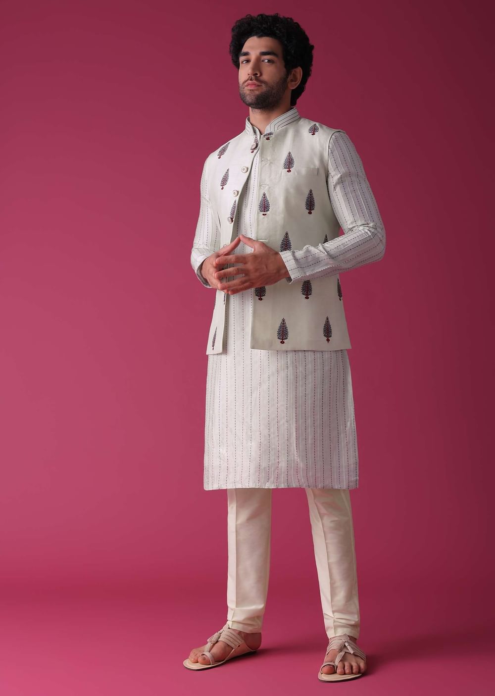 For a more contemporary look, style the jacket and kurta with denim jeans and white sneakers.