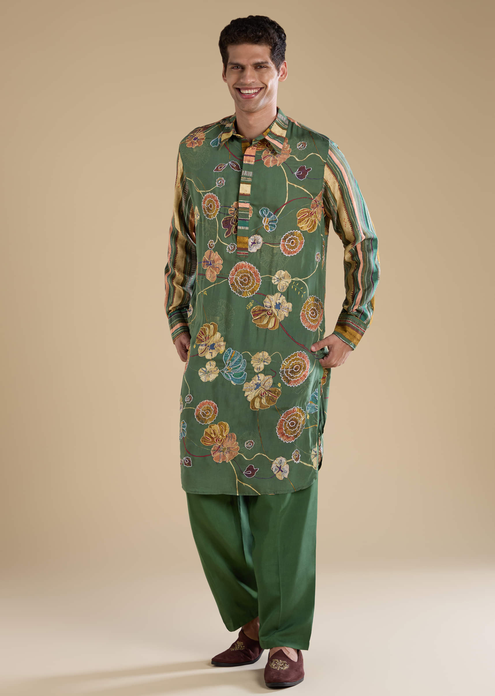 Embrace cultural artistry with this Kalamkari muslin-modal men’s kurta set, featuring traditional prints enhanced by fine thread (resham) embroidery. The blend of muslin and modal offers a soft, breathable feel with an elegant drape, making it perfect for festive occasions, daytime events, or cultural gatherings. Its detailed craftsmanship and rich patterns create a refined, heritage-inspired look. Awarded as the Most Trusted Brand, we're delivering styles you love, just as promised.