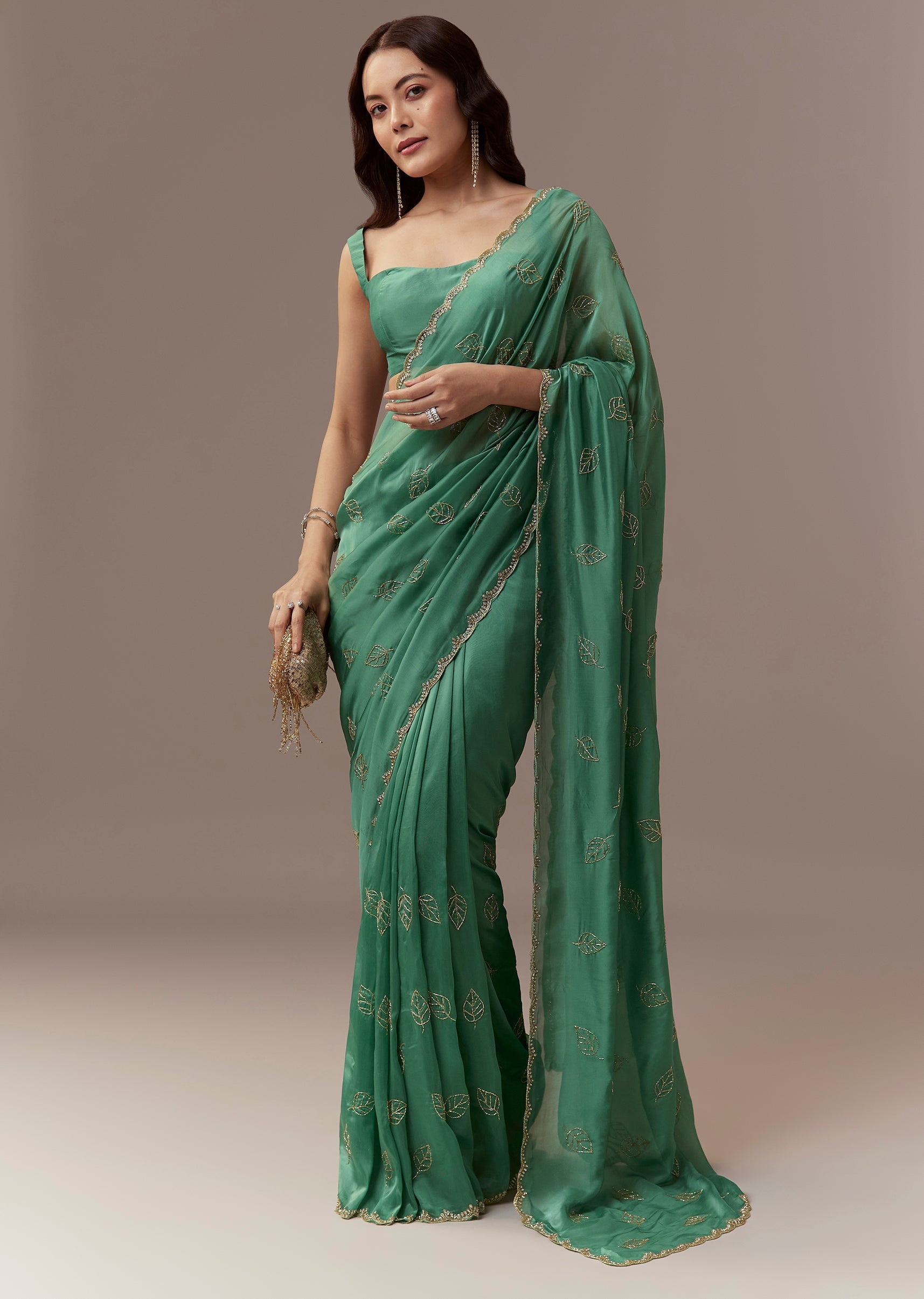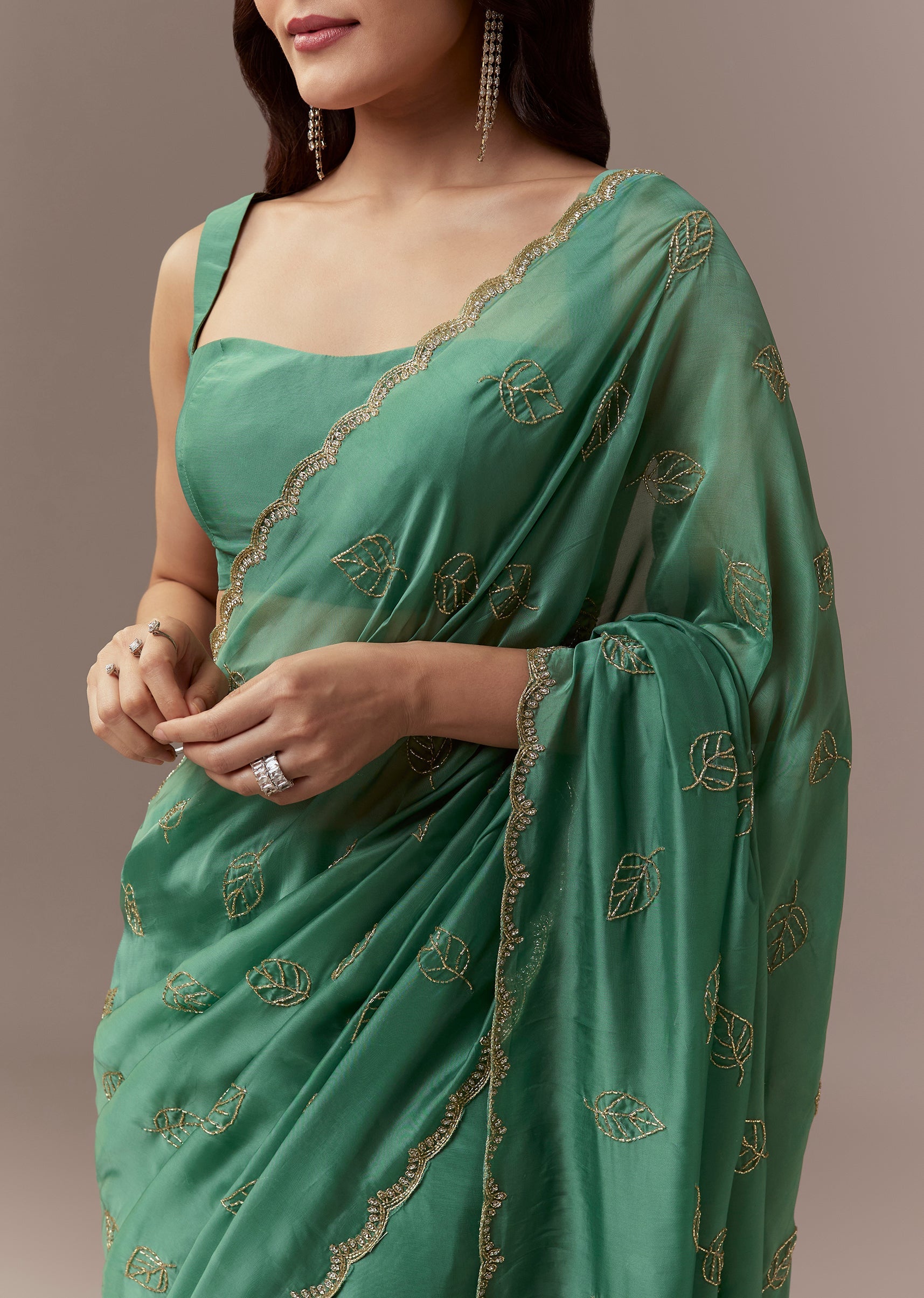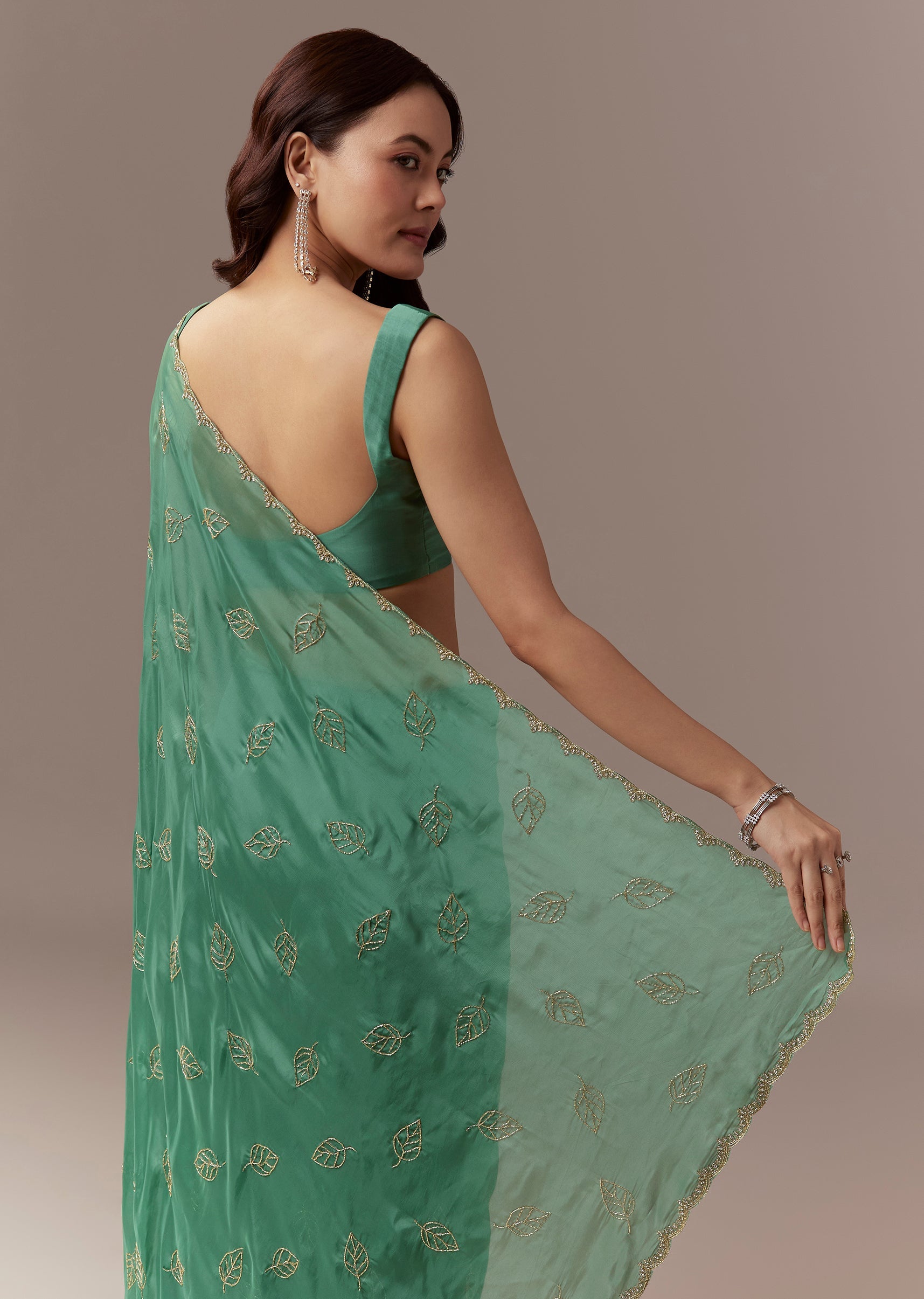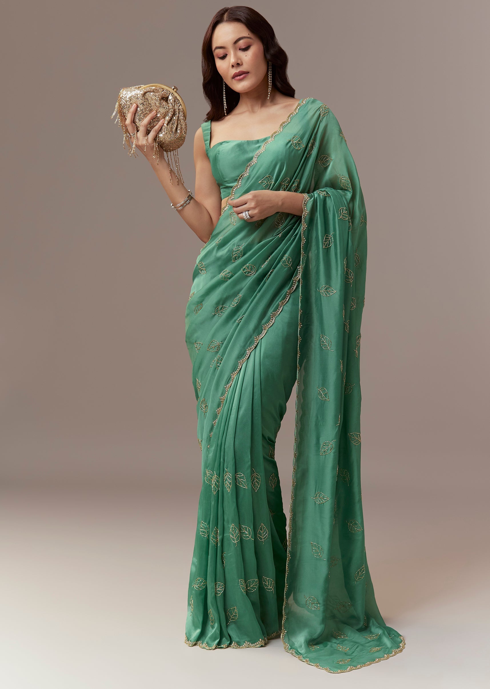 Soft elegant and festive this green kora silk saree is perfect for mehendi and sangeet celebrations as a wedding guest. The pastel hue is enhanced with a scalloped border embroidered with cutdana and stones while all over leaf motifs are delicately embroidered with cutdana creating a subtle shimmer and refined look. The saree comes with unstitched blouse fabric allowing a customized and comfortable fit. Ideal for daytime or evening events it exudes charm sophistication and celebration ready elegance. Awarded as the Most Trusted Brand, we're delivering styles you love, just as promised.