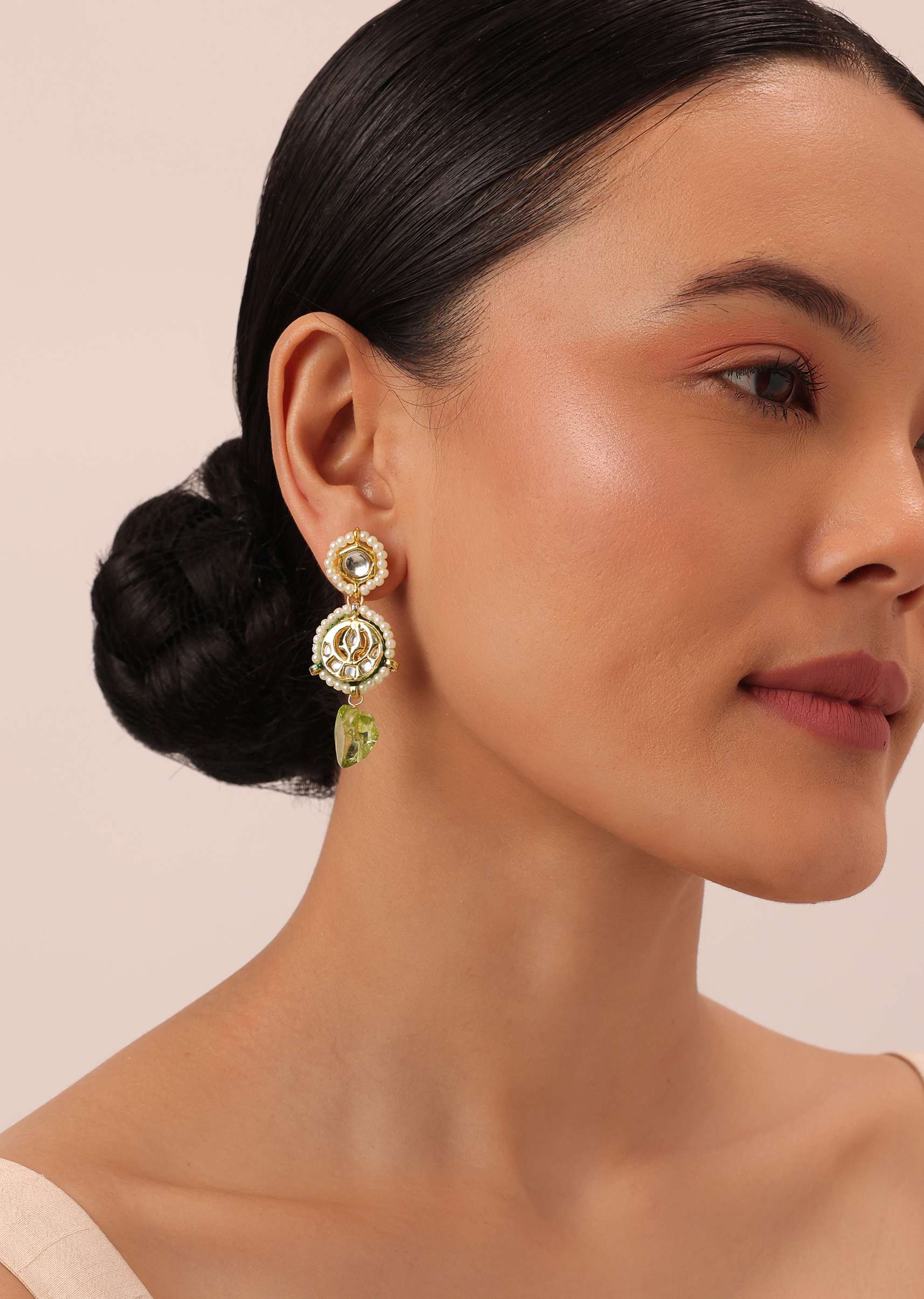 Green Kundan Pendant Necklace Set With Pink Bead Drops And Crescent Moon Motif