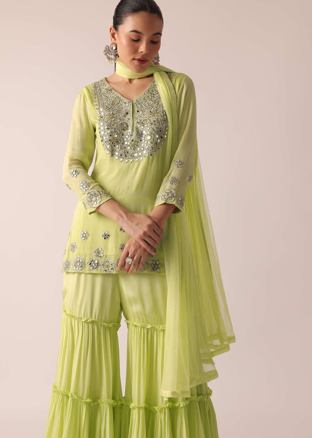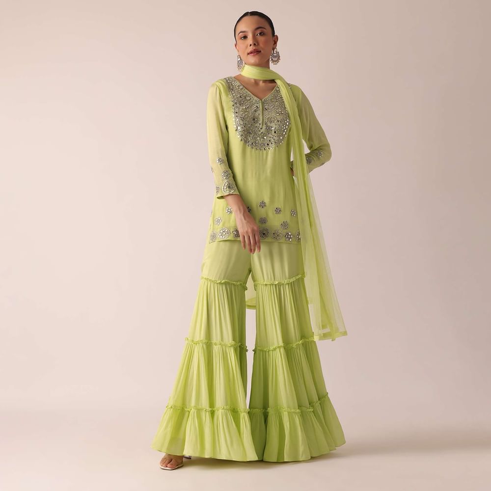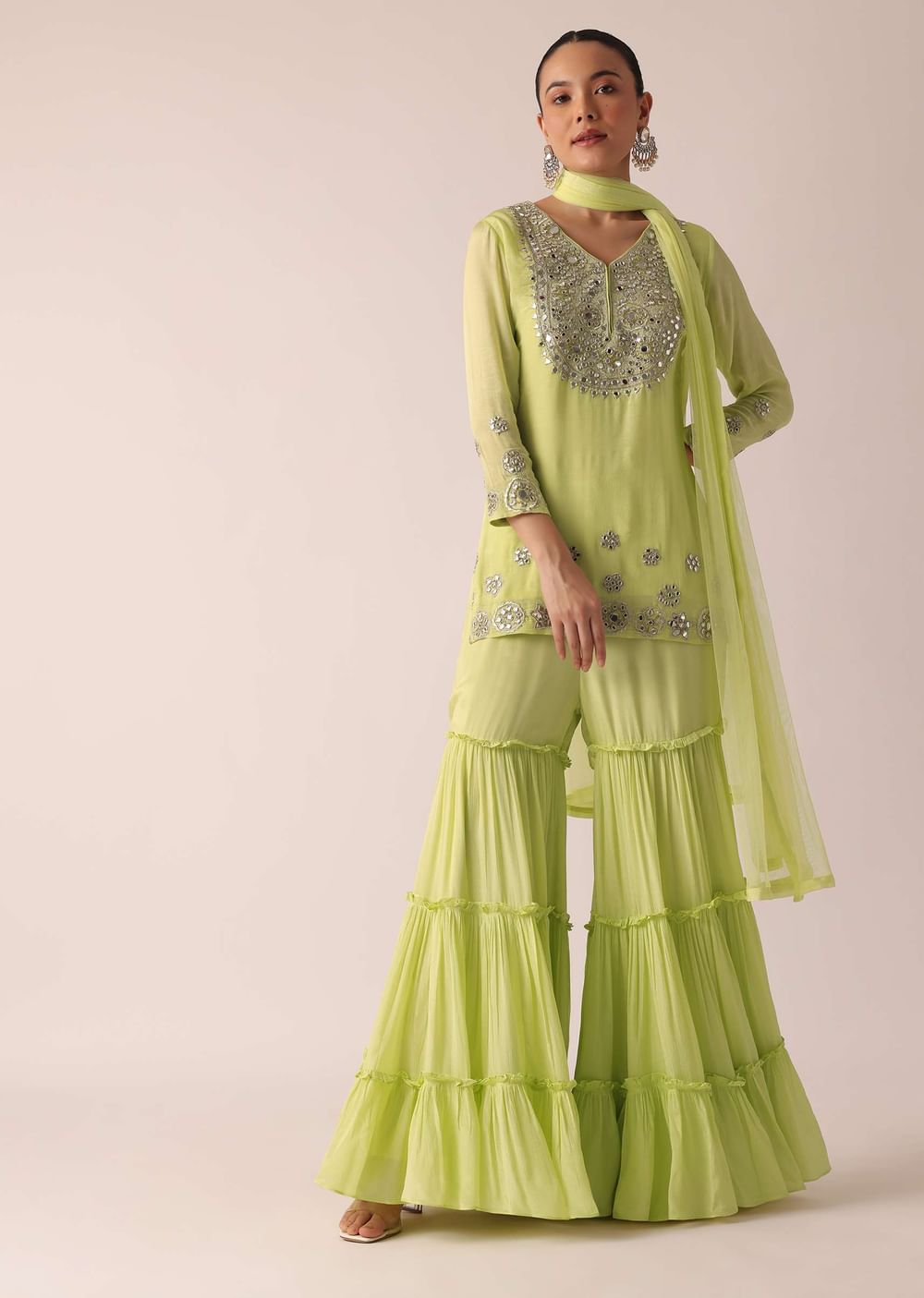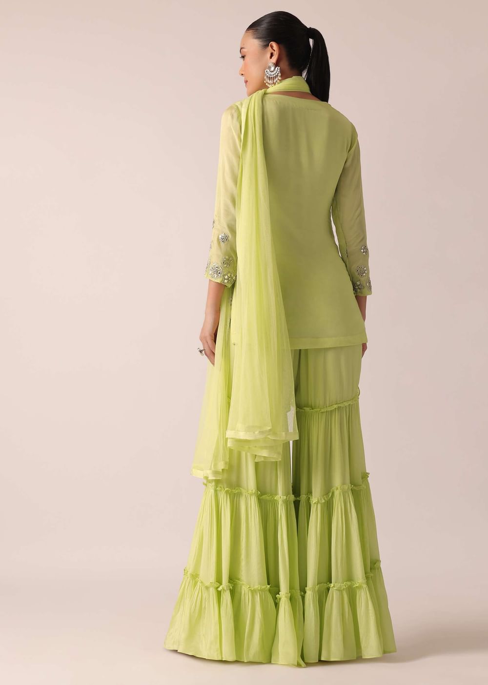 Bringing a fancy buzz to your ethnic collection is this evergreen hue. Showcasing a chiffon short kurta ornated with mirror cutdana and zari. Teamed with a tiered sharara and net... More Product Details