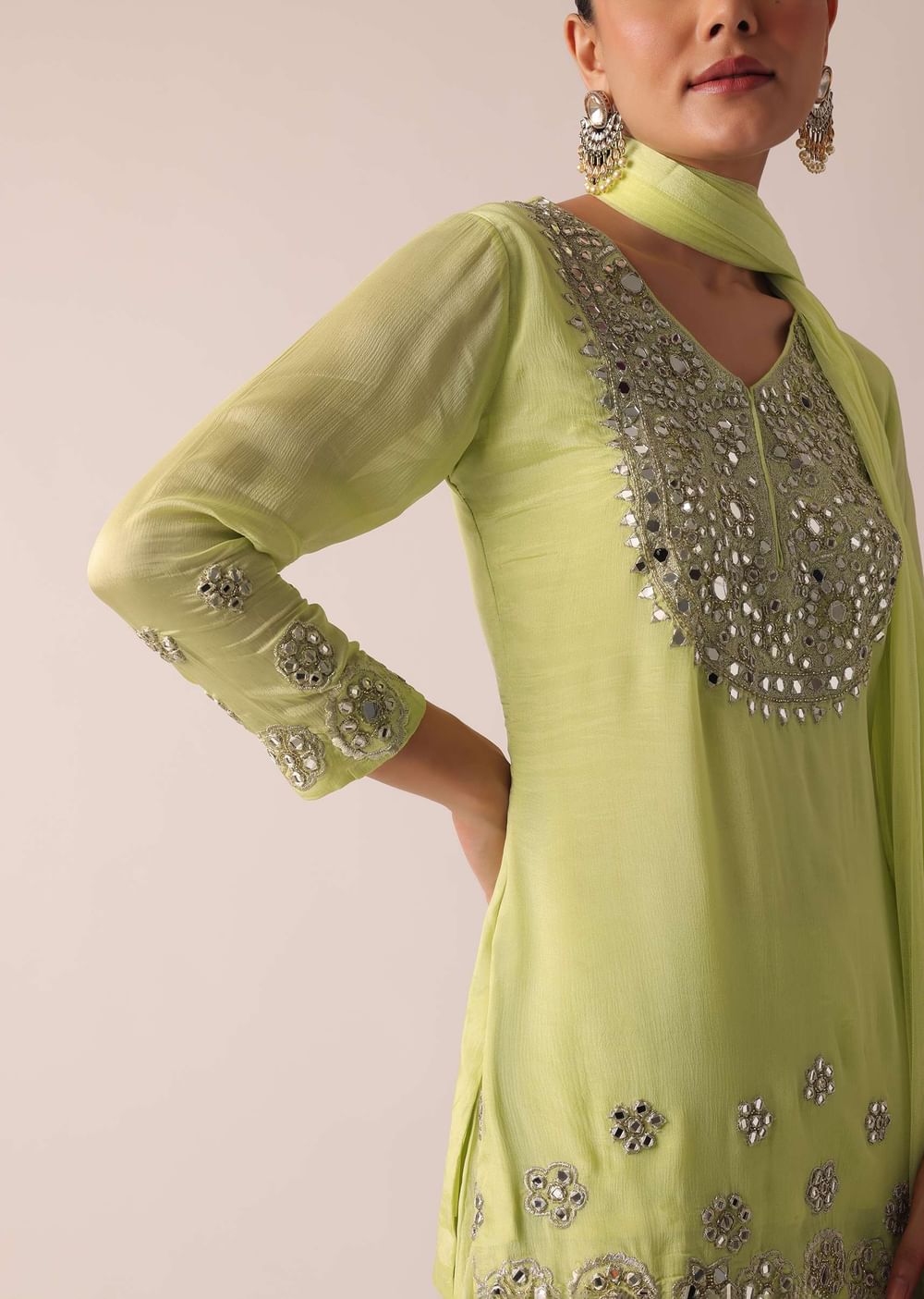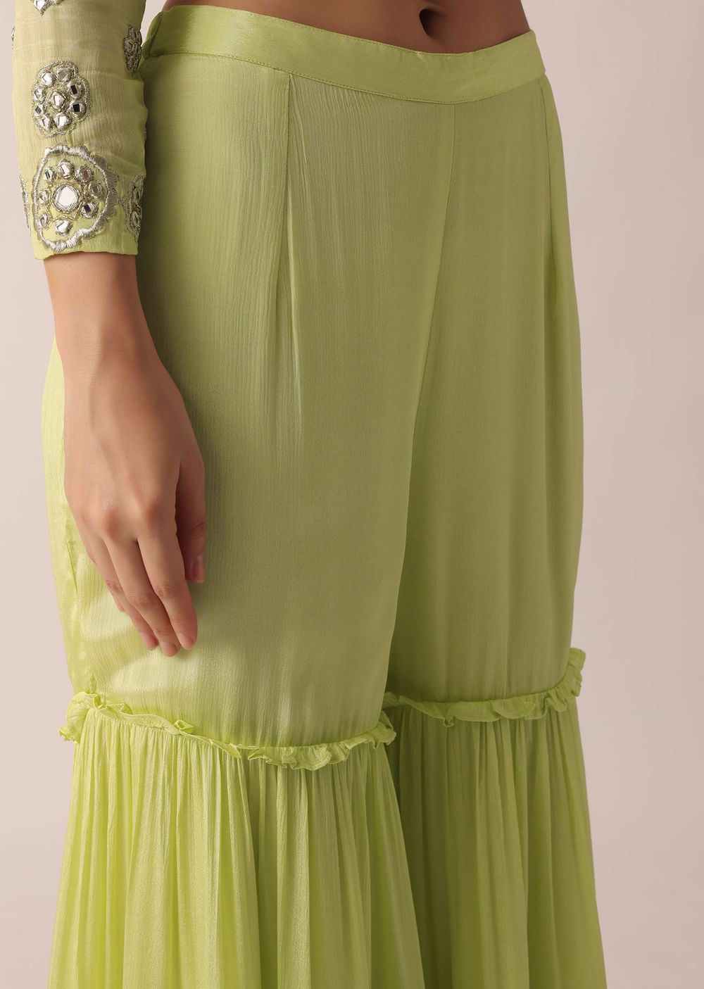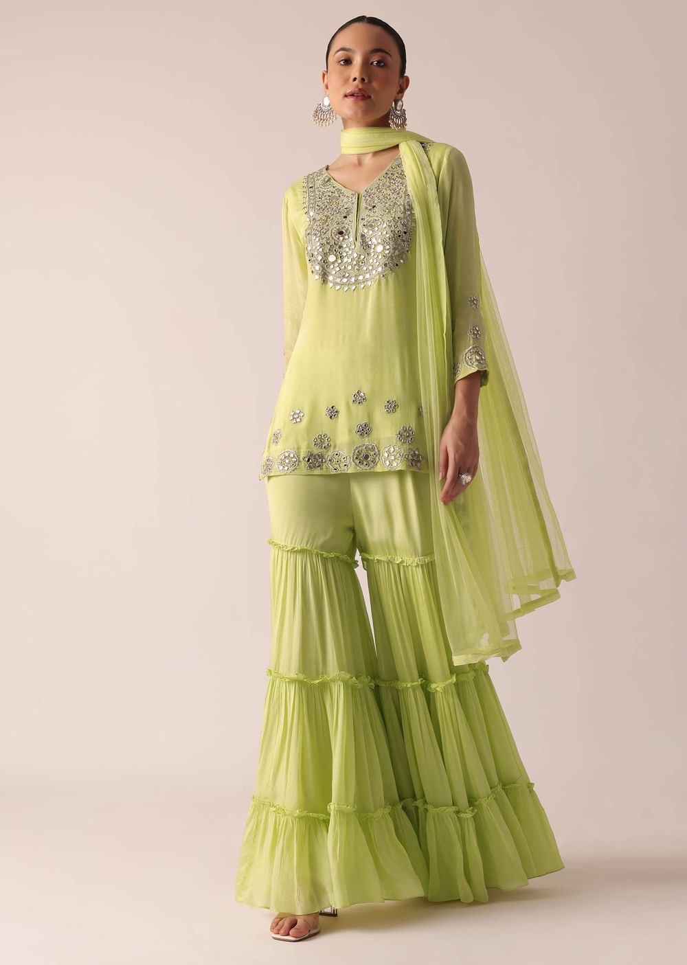 Bringing a fancy buzz to your ethnic collection is this evergreen hue. Showcasing a chiffon short kurta ornated with mirror cutdana and zari. Teamed with a tiered sharara and net... More Product Details