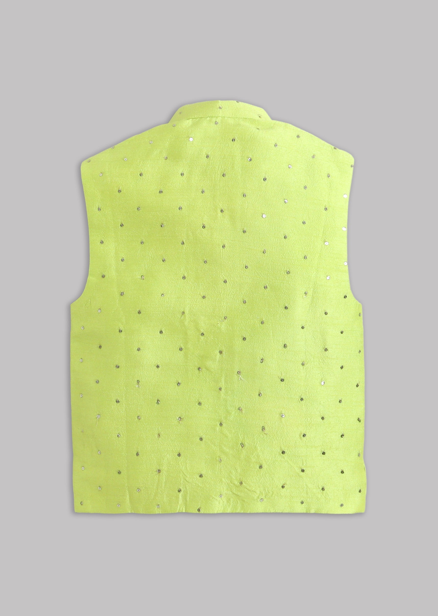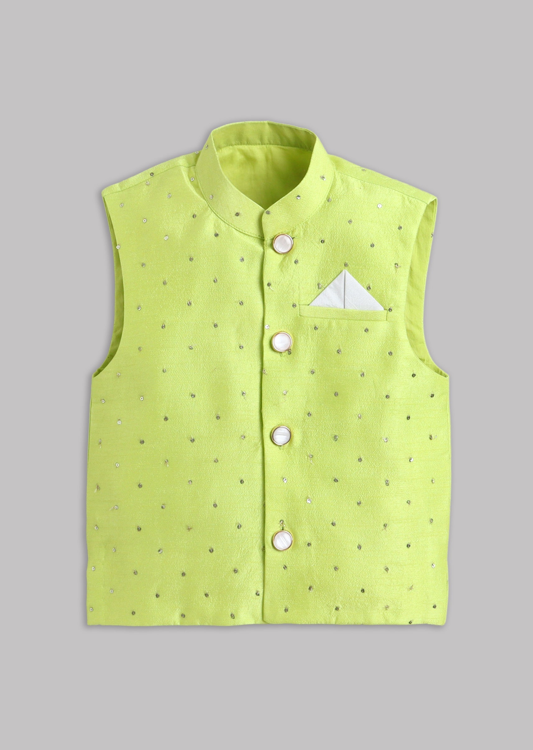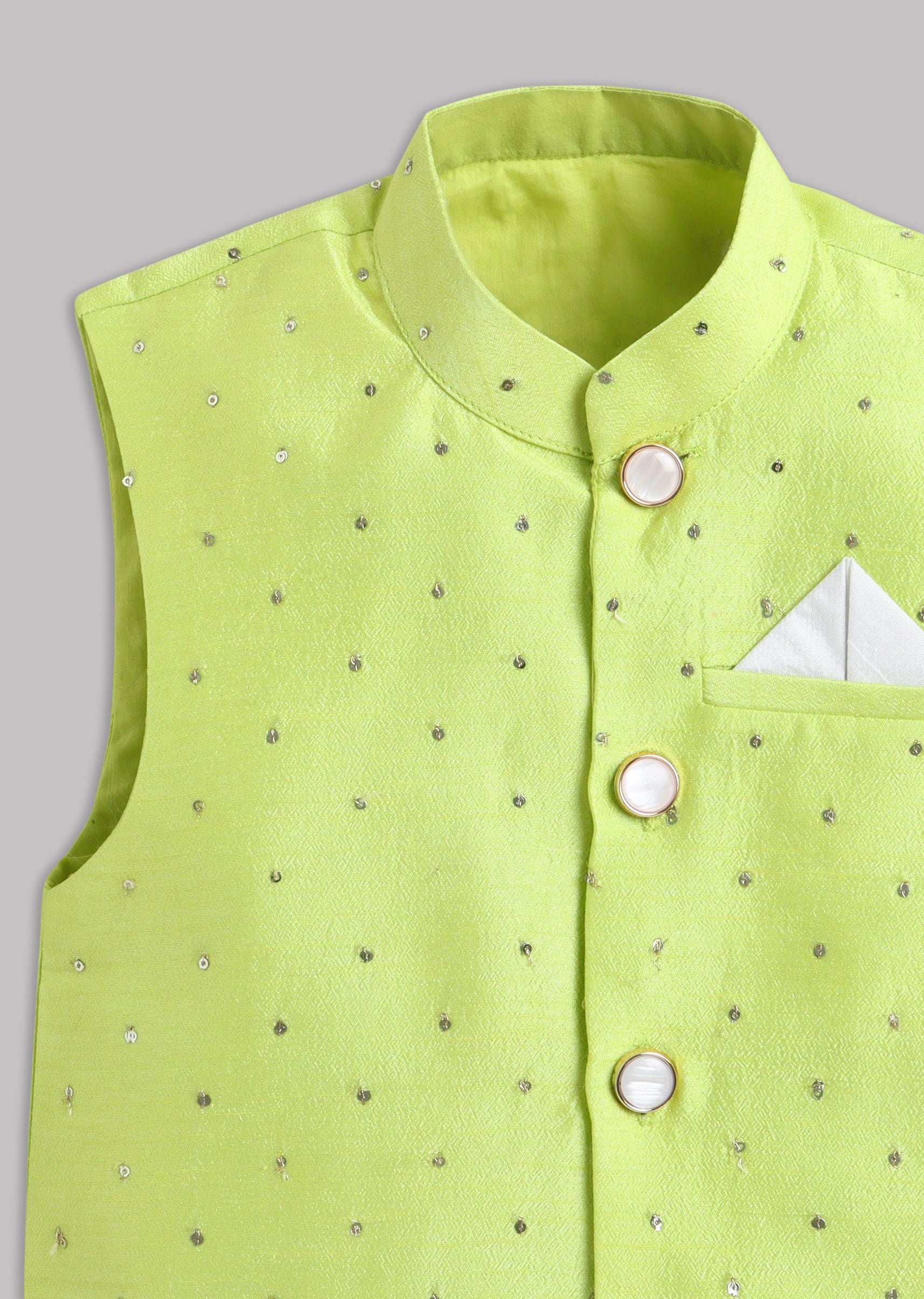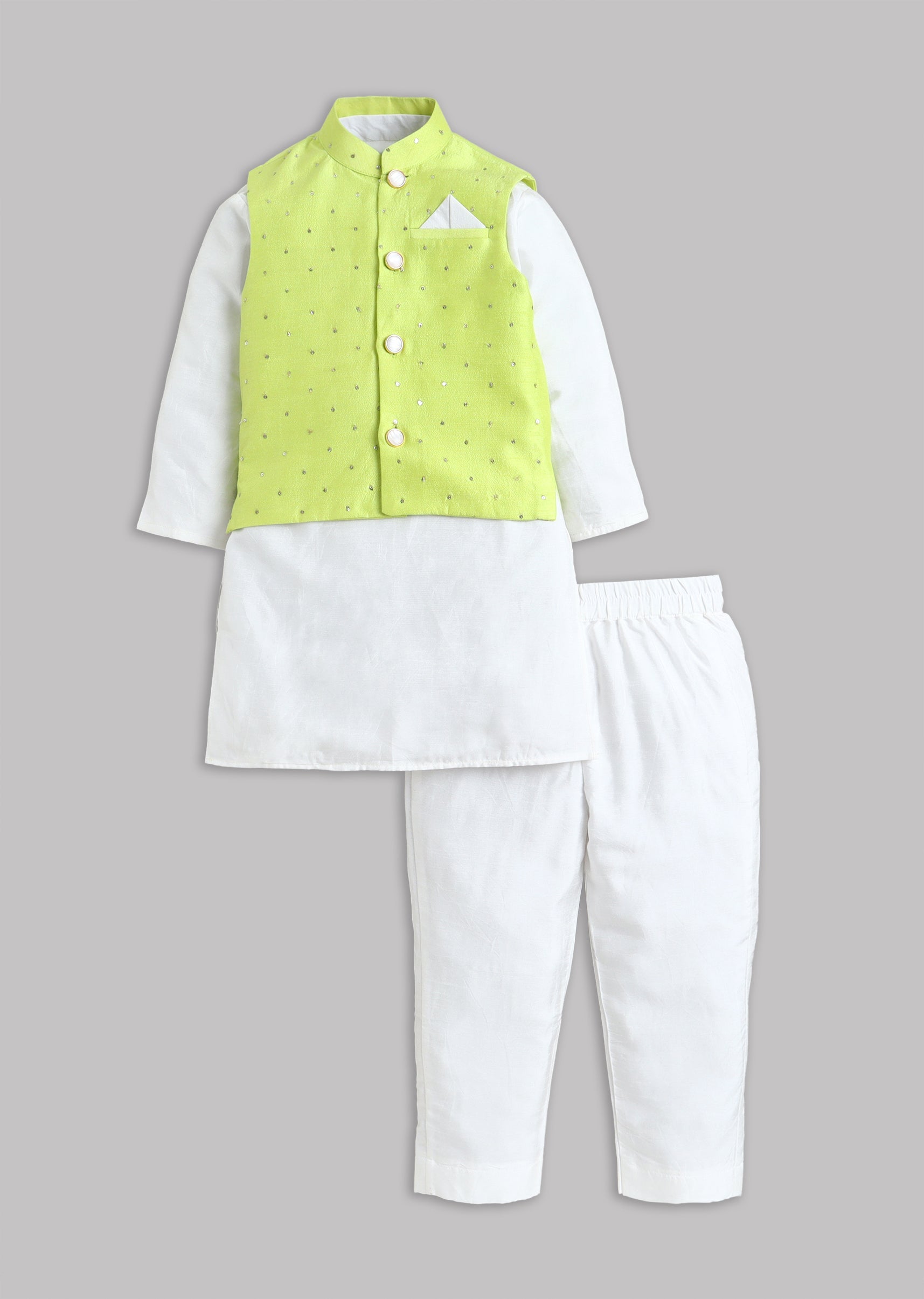 A festive green kurta set paired with a smart Nehru jacket, finished with full sleeves, mandarin collar, and front buttons. A classic layered look for weddings and special family occasions.... More Product Details