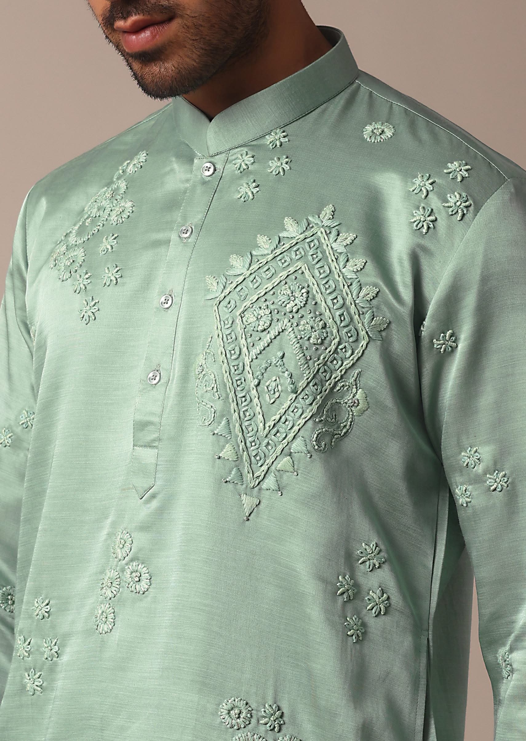 Embrace festive flair with our Green Linen Kurta Set. It features intricate thread/resham work on the yoke in a vibrant Mehendi hue. Crafted for comfort and style, this set includes... More Product Details