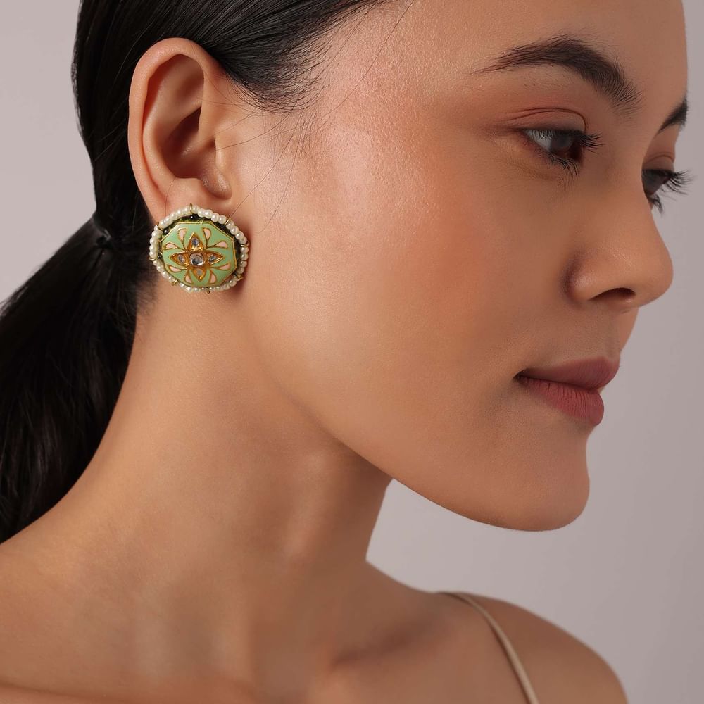 An ideal choice to keep it chic and classy this festive season. Adorned with intricate Meenakari work these green circular studs flaunt a floral motif design. Made from mix metal... More Product Details