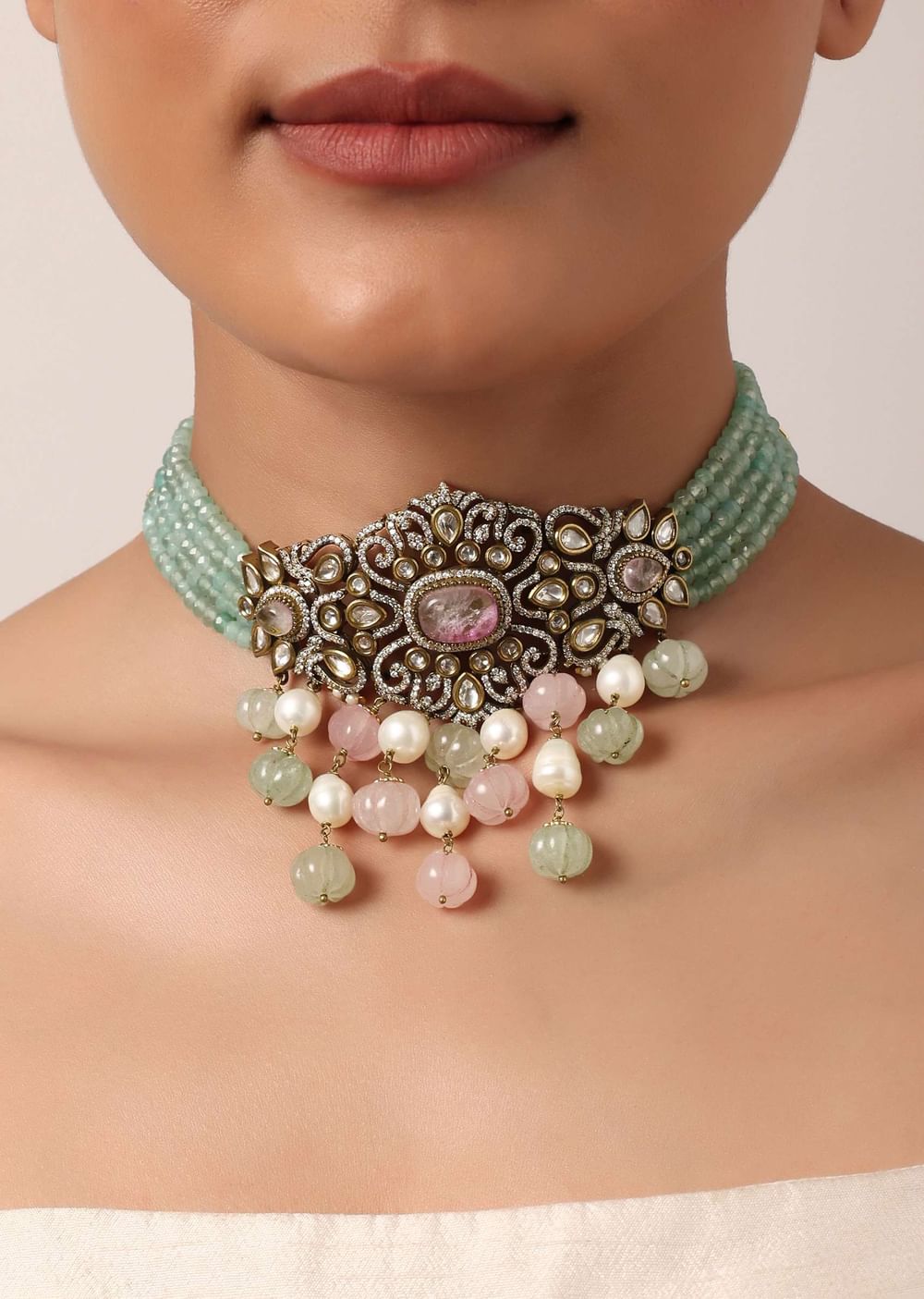 Complete your Mehendi look with this statement choker set. Adorned with a string of green beads, it flaunts an exquisite motif pendant. Embedded with polki stones, the multi-hued beads add... More Product Details